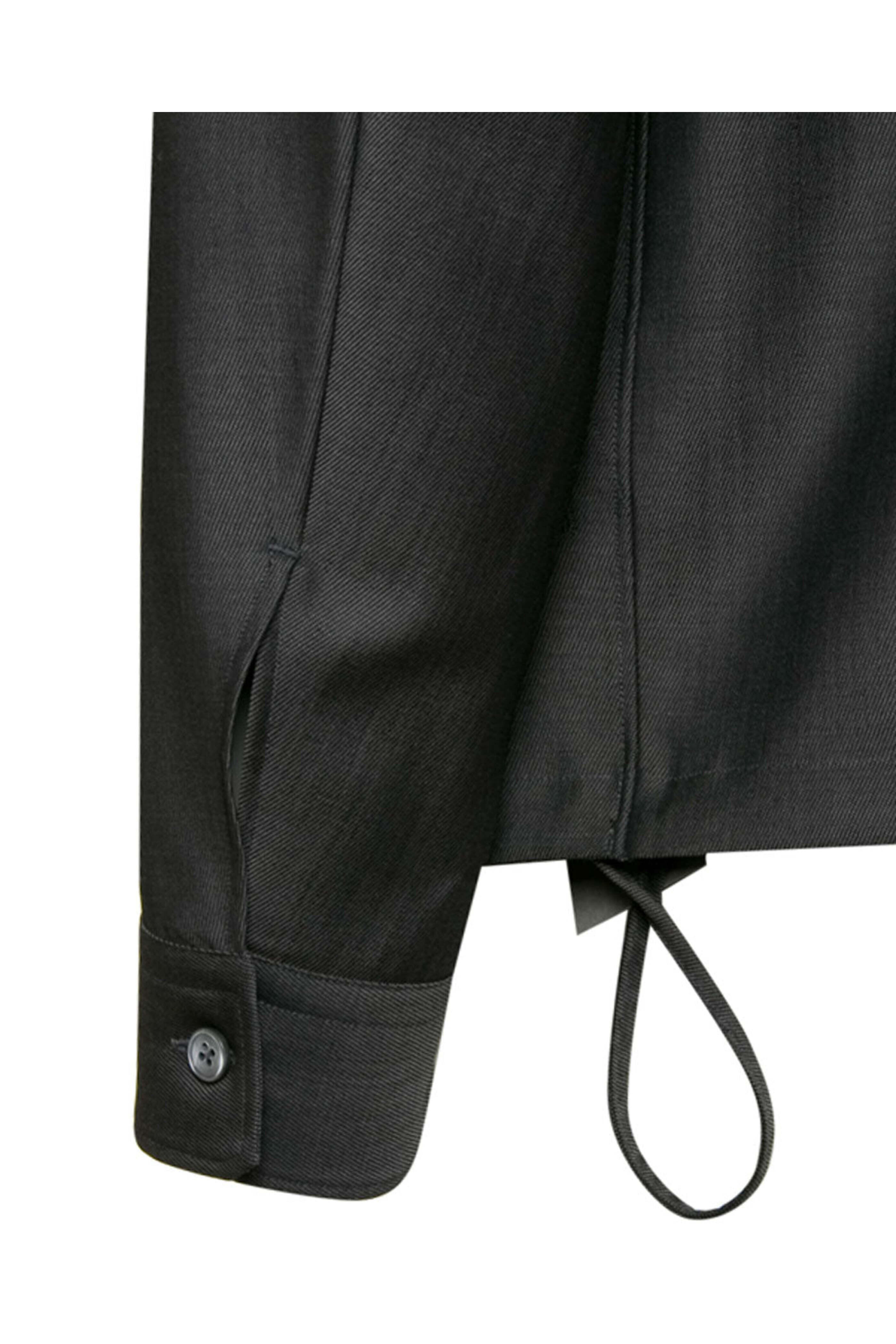 Zegna Charcoal Grey Wool Overshirt. Collared. Front button closure. Long sleeve. Single button cuffs. Front hand pockets. Straight hem. Adjustment side pulls at hem. 86% wool, 14% mohair. Lining: 100% cupro.