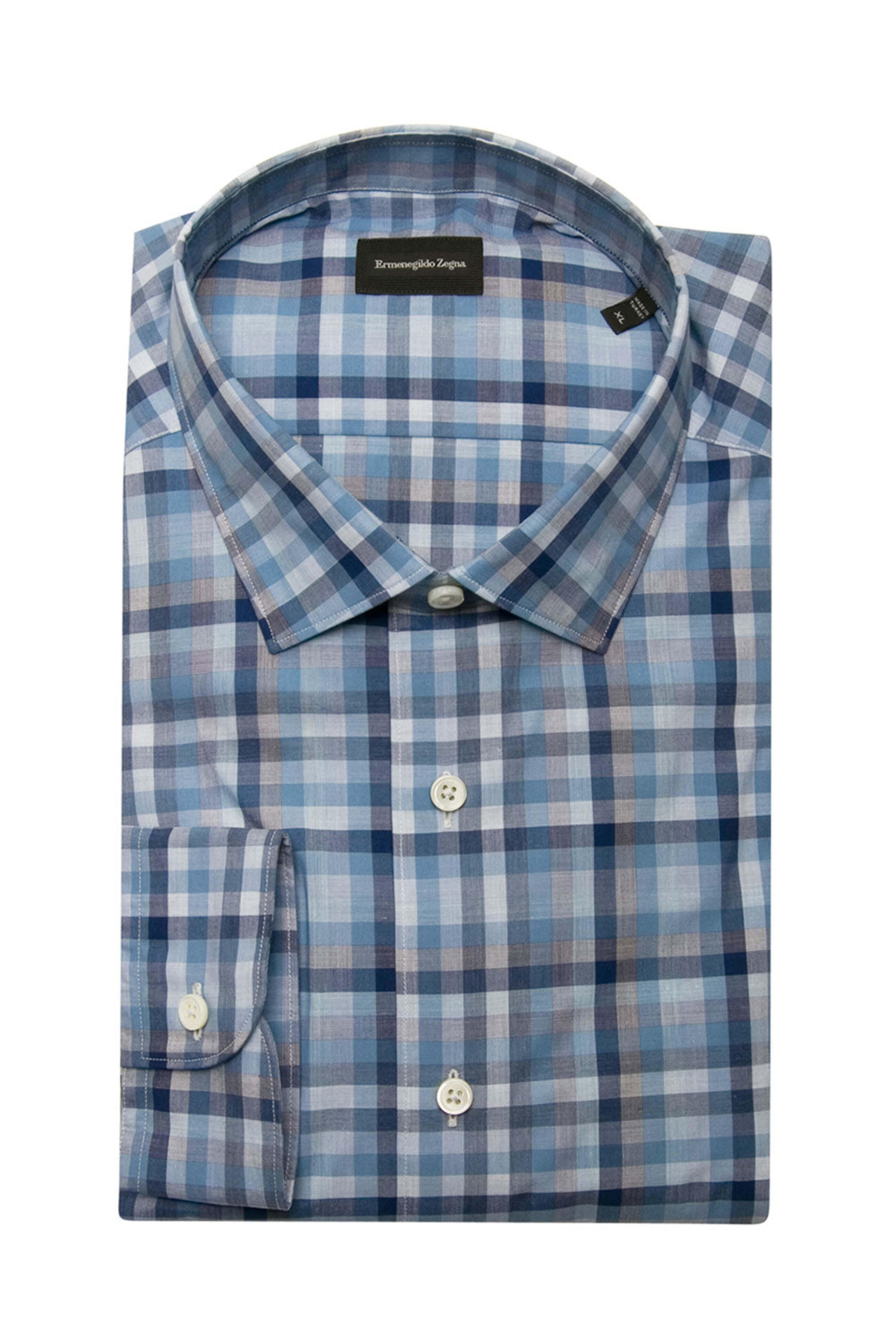Zegna Blue Plaid Sport Shirt. Pointed collar. Button down front. Long sleeves. Single button barrel cuff. Classic fit. 100% cotton.