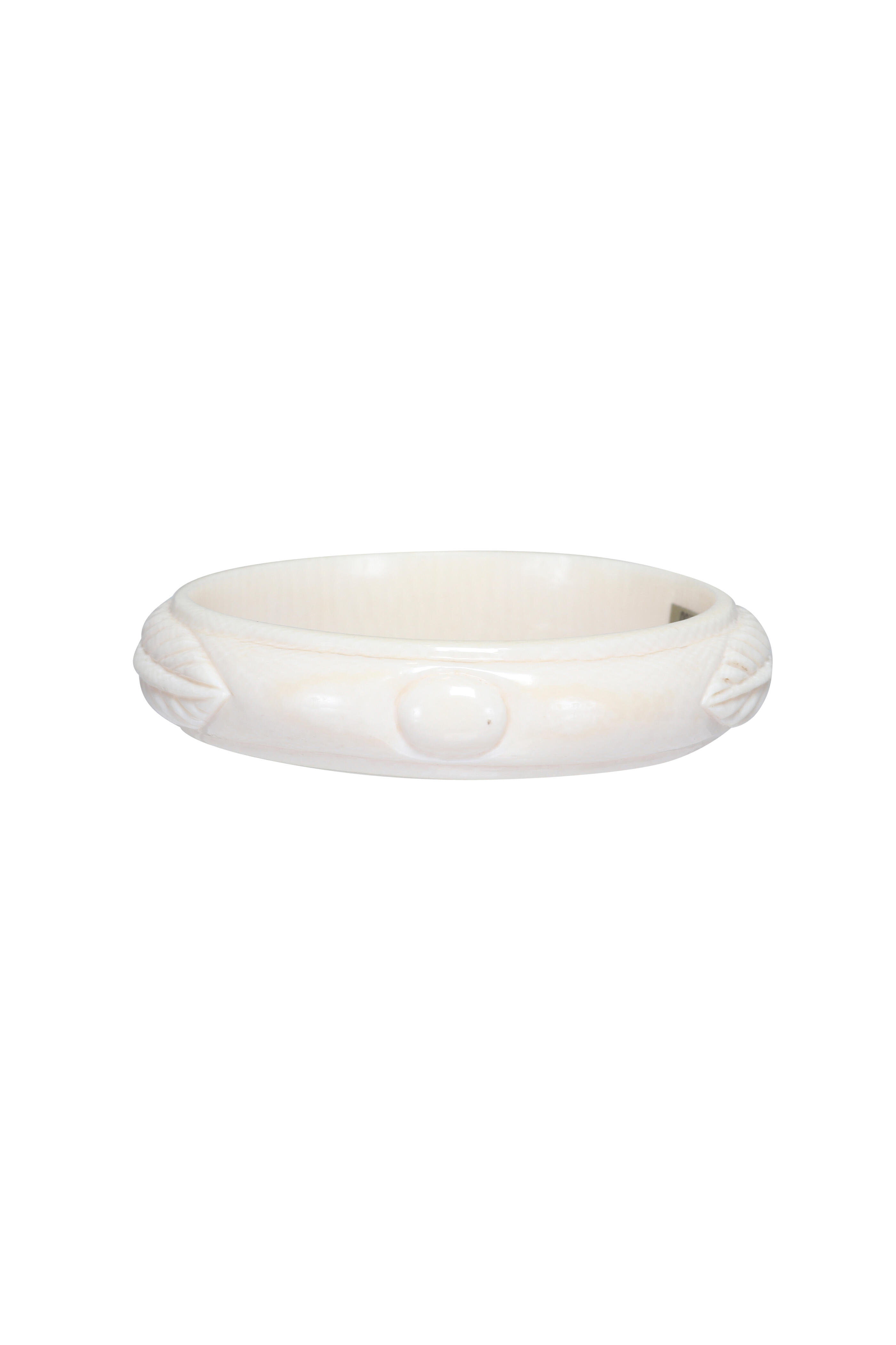 Recycled vintage ivory. Art deco design. Carved leaf design. Engraved detailing. Slip-on. Bangle style. Manufactured in New York City. Diameter: 2.5”.