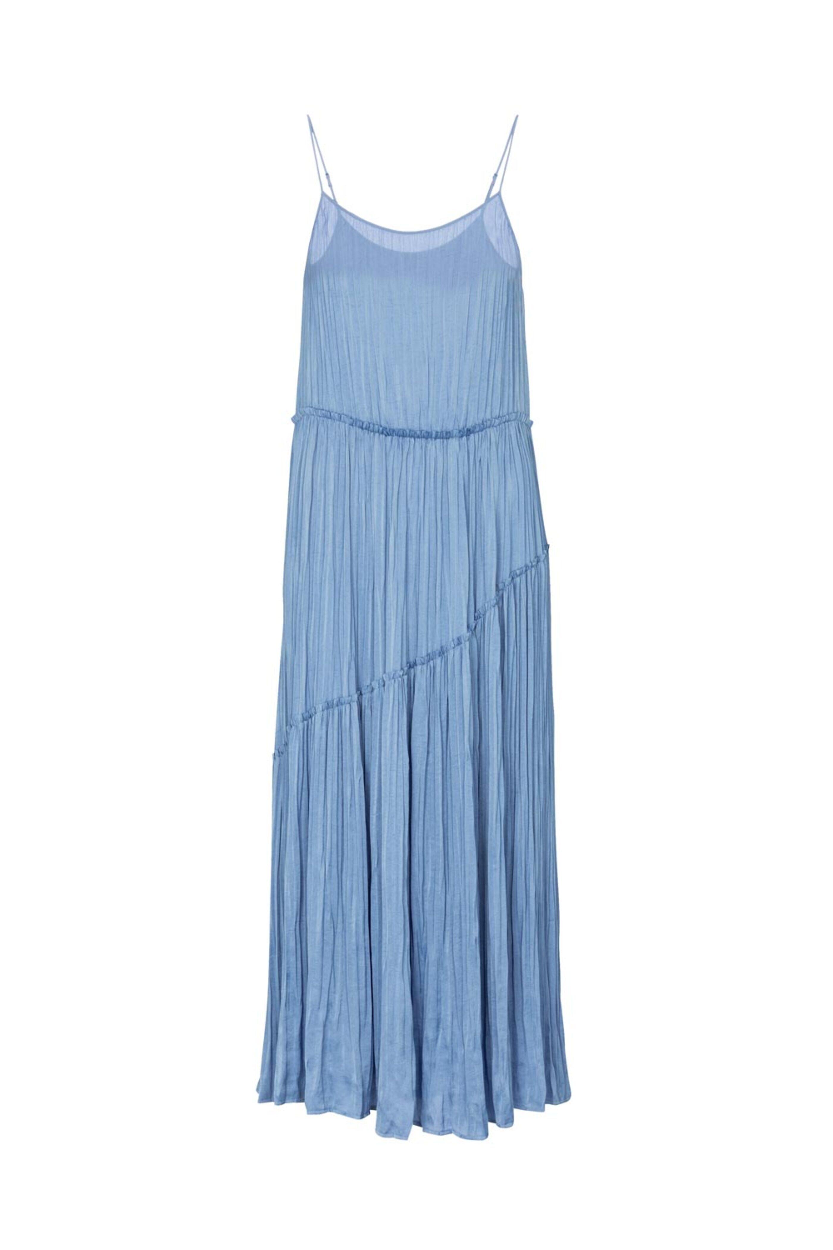 - Vince Pale Fountain Asymmetrical Tiered Pleat Maxi Dress Scoop neck Scoop back Sleeveless; adjustable shoulder straps Crinkle pleats throughout Diagonal stitching; panel silhouette Relaxed fit Midi length Unlined 100% polyester