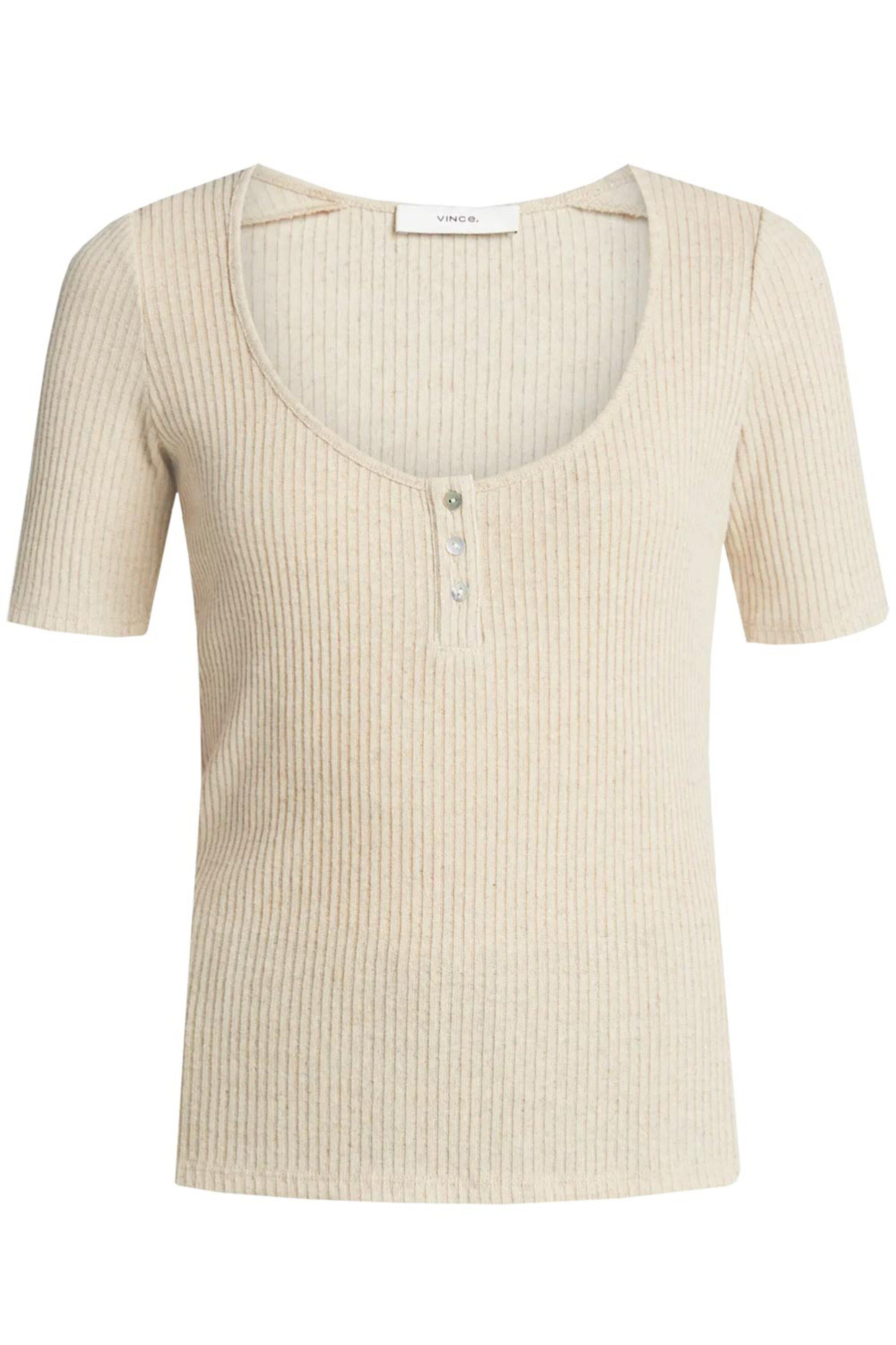 - Vince Natural Ribbed Scoop Neck Henley Scoop neck Short sleeves Button front detail Ribbed throughout Slim silhouette Unlined 100% linen