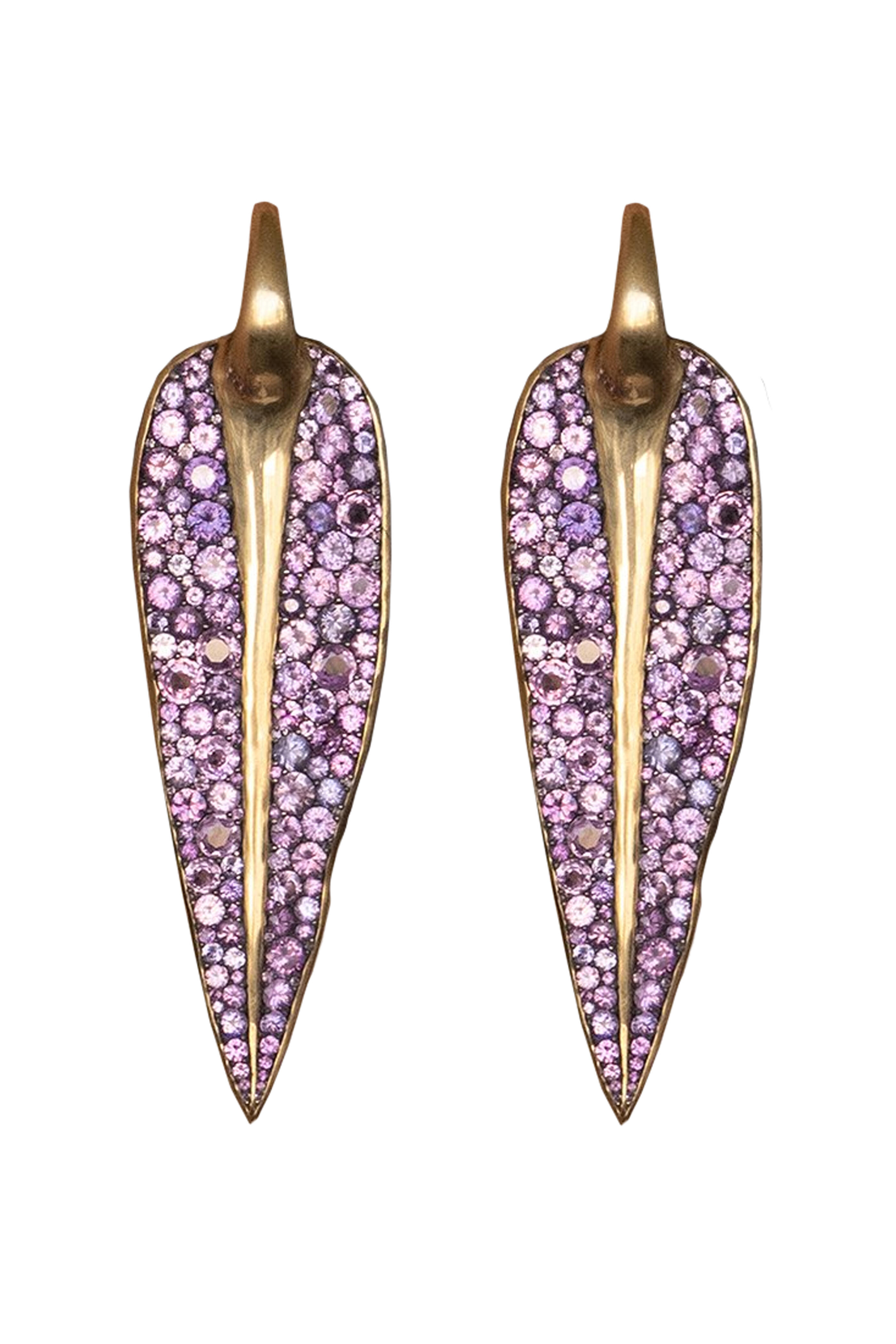 18k gold. Purple sapphire 28.37 total carat weight. Evocative of ancient tools. Carved detailing. Drop style. Prong setting. Hinged closure. Due to the handcrafted nature of the work and the natural materials used, no two pieces will be precisely alike. Designed and crafted in L.A.