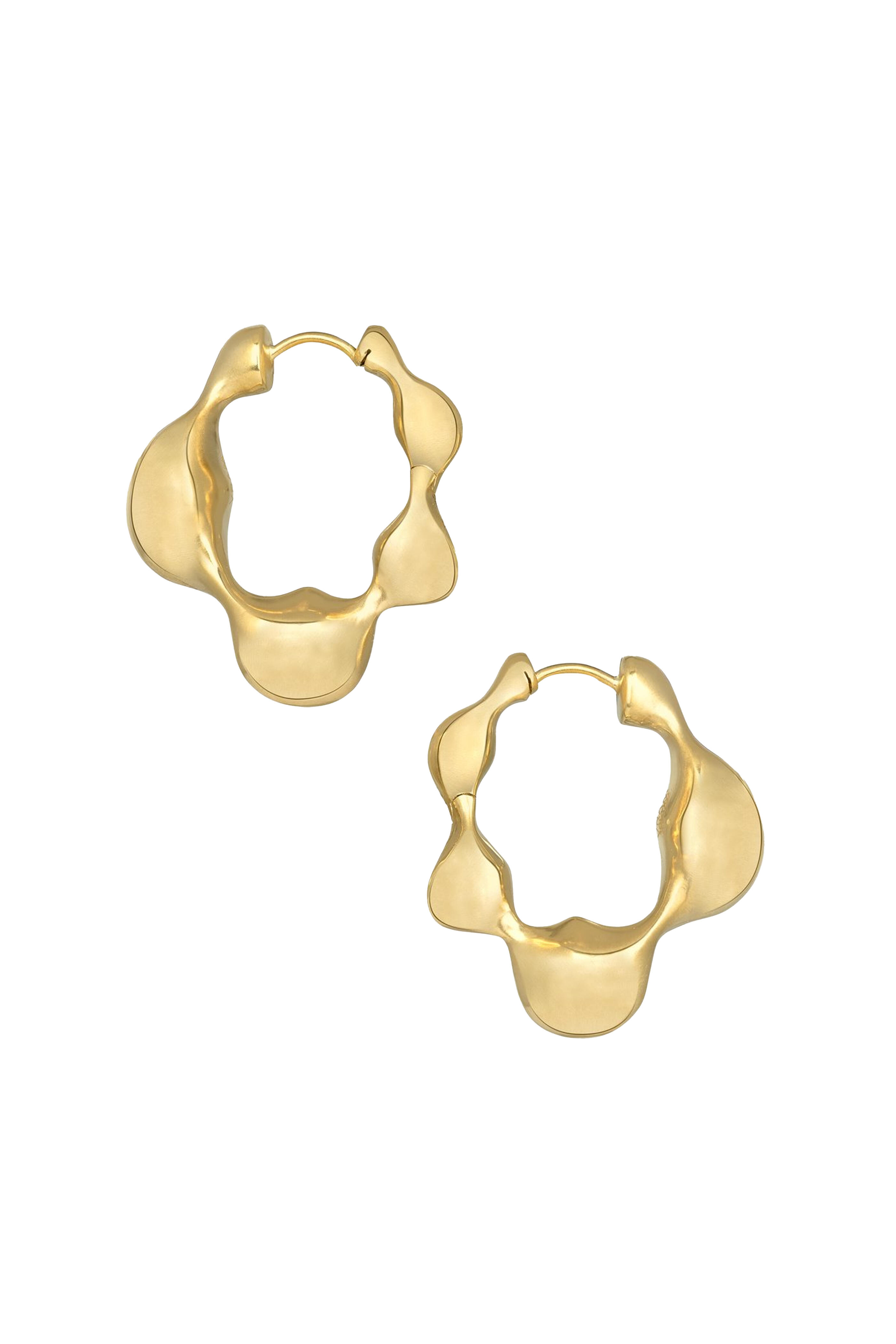 18k gold. Carved detailing. Hoop style. Hinged huggie closure. Due to the handcrafted nature of the work and the natural materials used, no two pieces will be precisely alike. Designed and crafted in L.A.