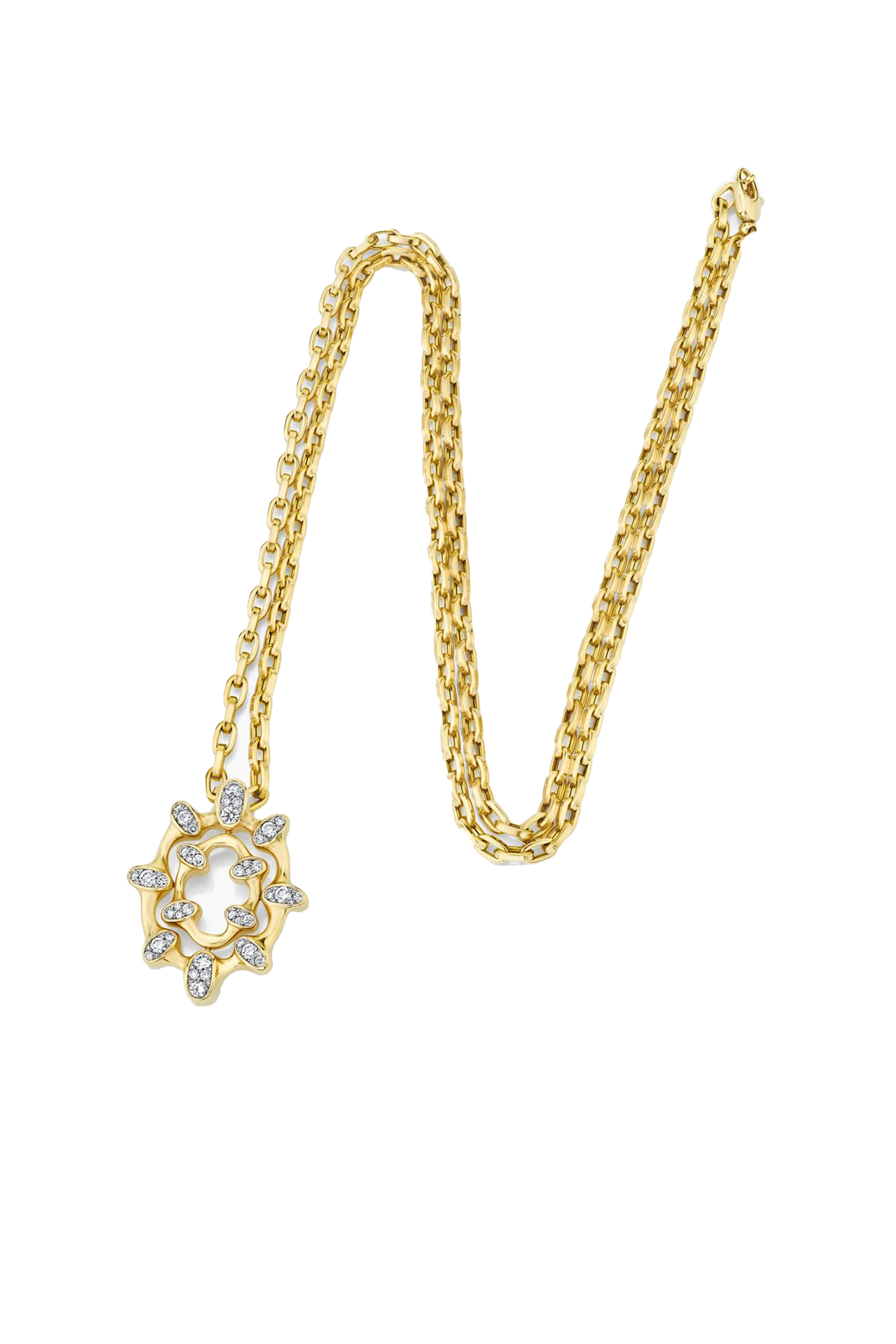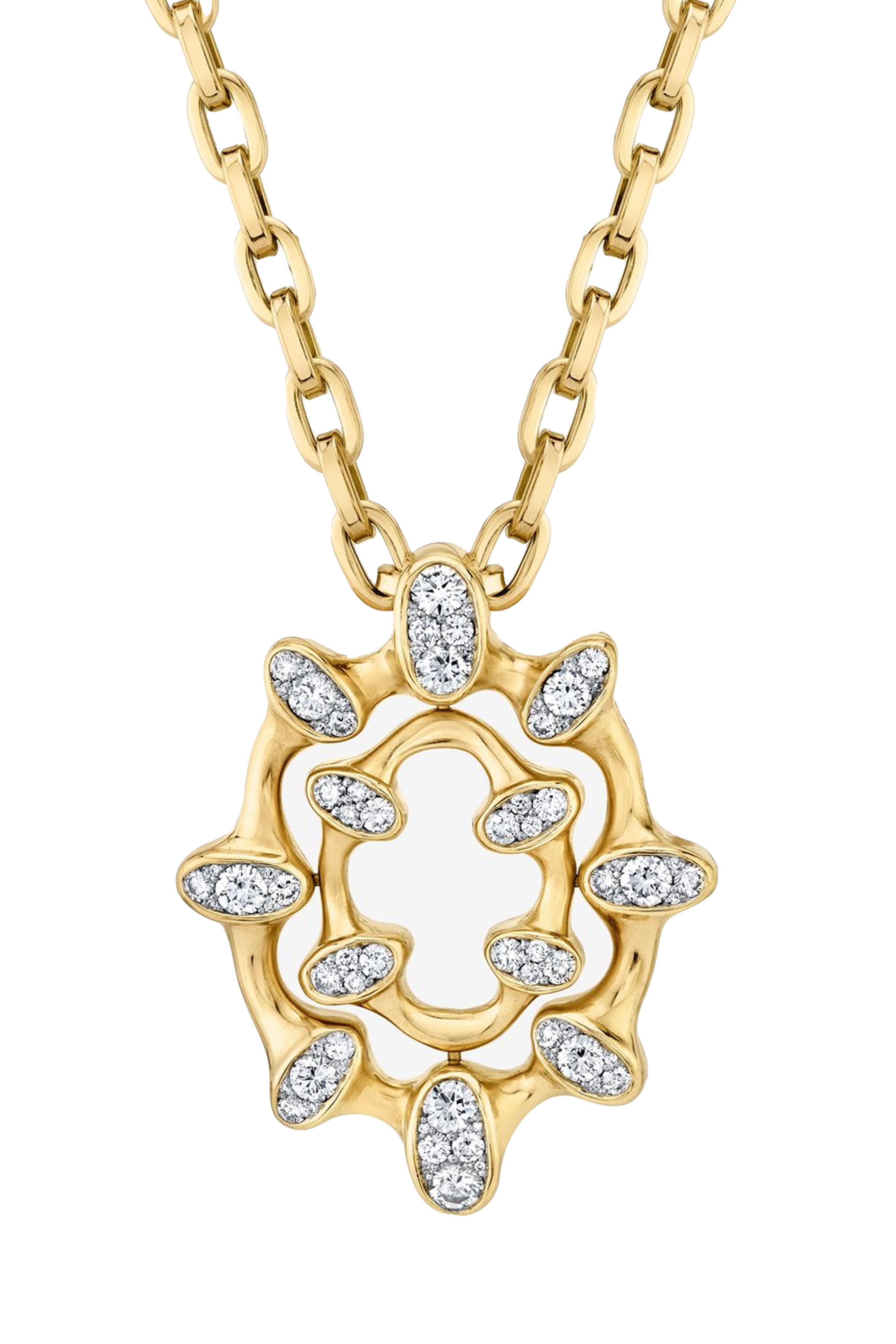 18k gold. Platinum. Diamond 3.11 total carat weight. Round, brilliant cut diamond. Features curvaceous ridges. Prong setting. Bold cable chain. Lobster claw clasps. Due to the handcrafted nature of the work and the natural materials used, no two pieces will be precisely alike. Designed and crafted in L.A.. Measurement: 35” L.