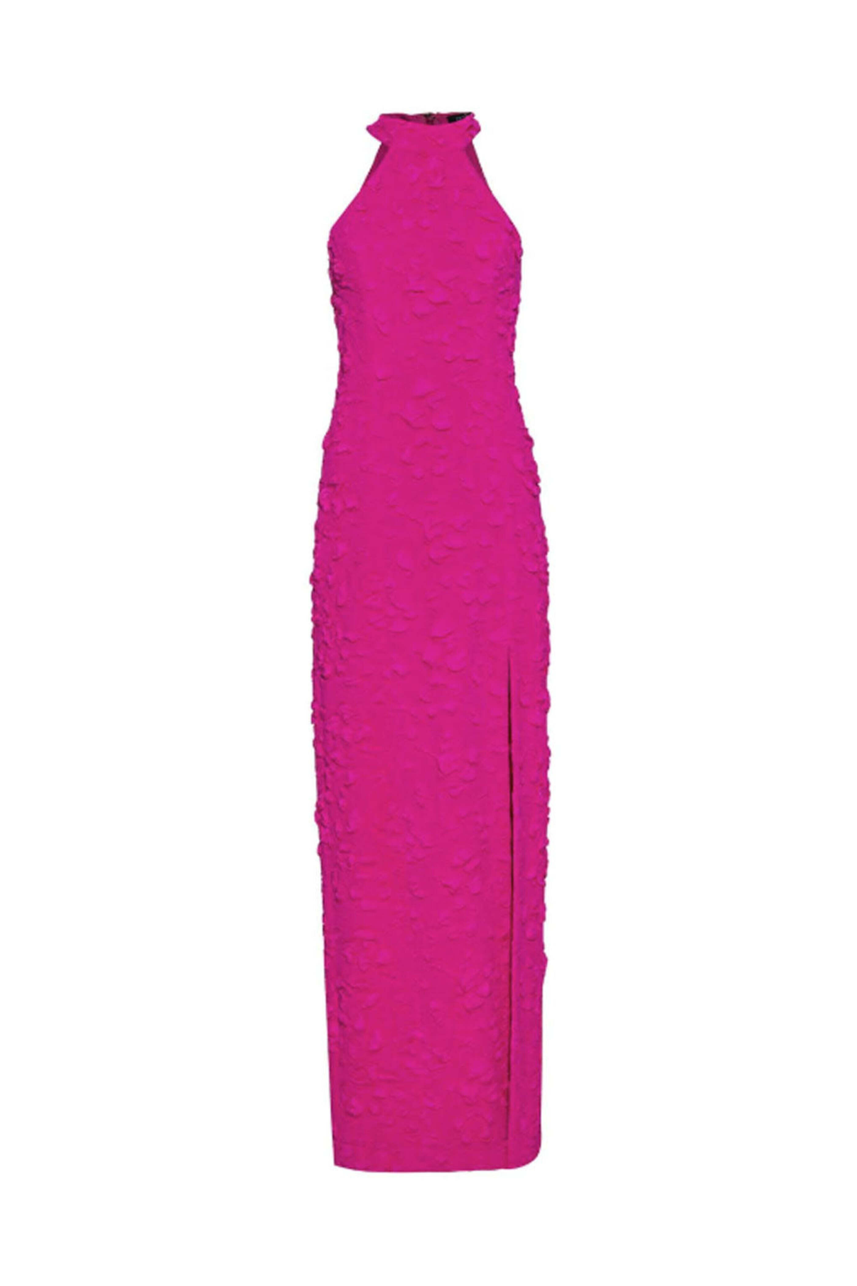 Patbo Neon Pink Jacquard Halter Neck Maxi Dress. Halter neck. Sleeveless. Concealed back zip closure. Slim silhouette. Maxi length. Front hem slit. Jacquard fabrication. Lined. 97% polyamide, 3% elastane outer, 95% polyester, 5% elastane lining.