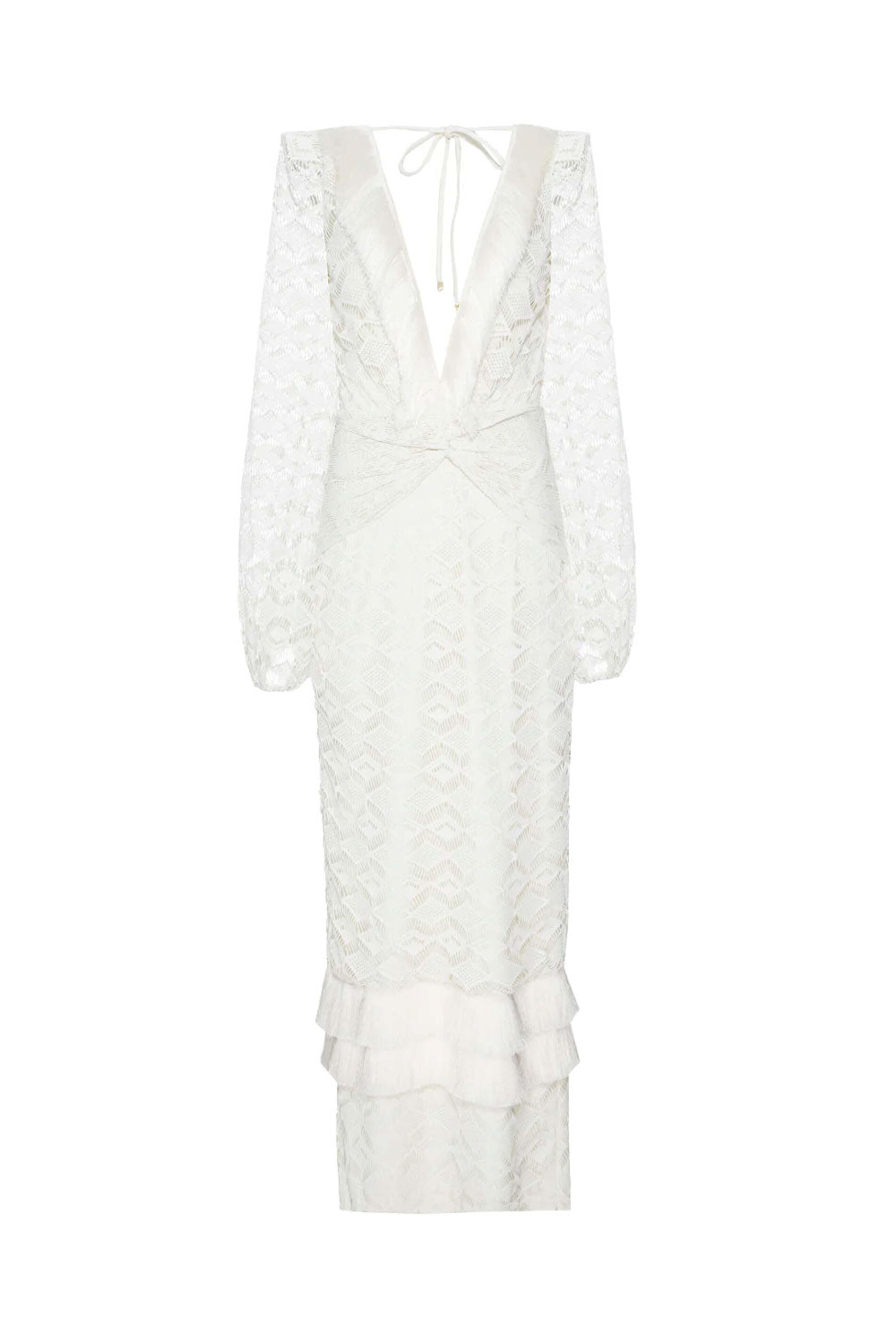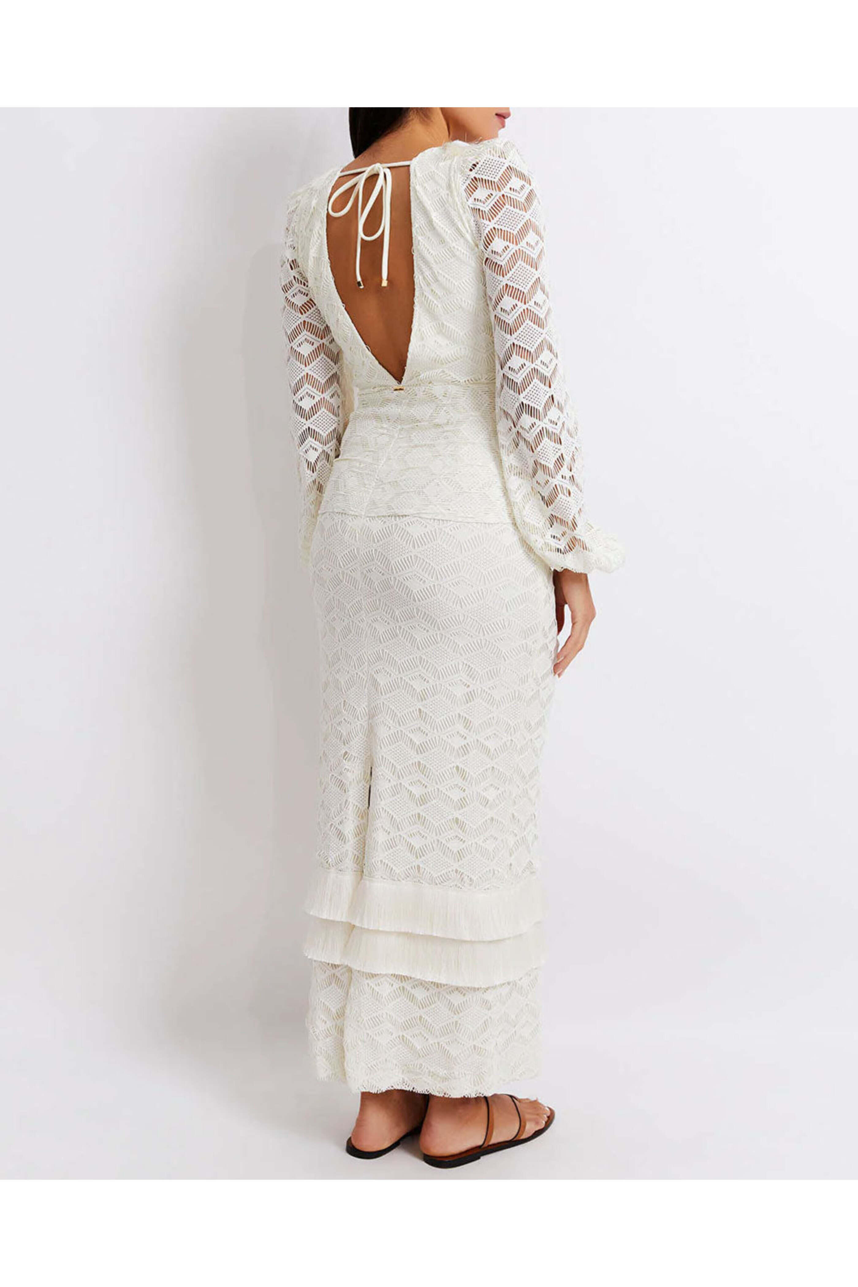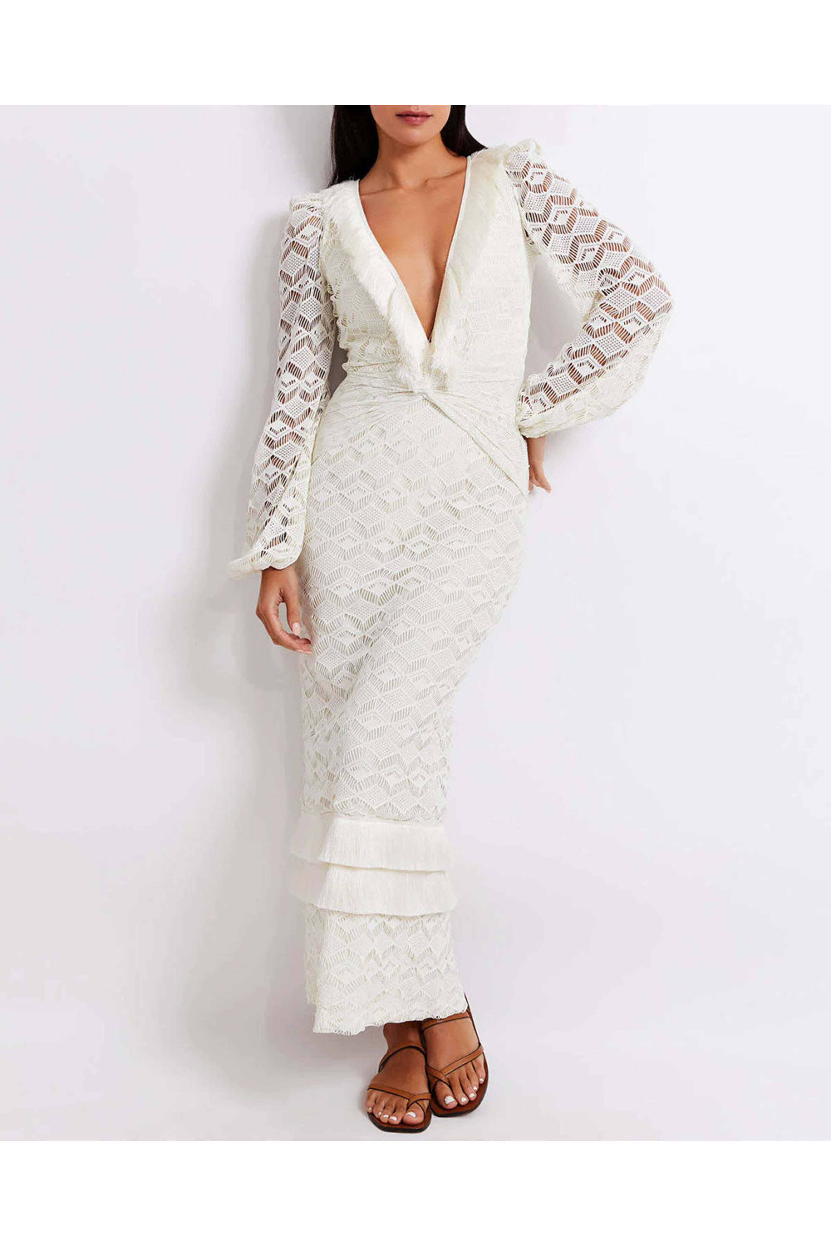 Ivory Crochet Plunge Fringe Trim Maxi Dress