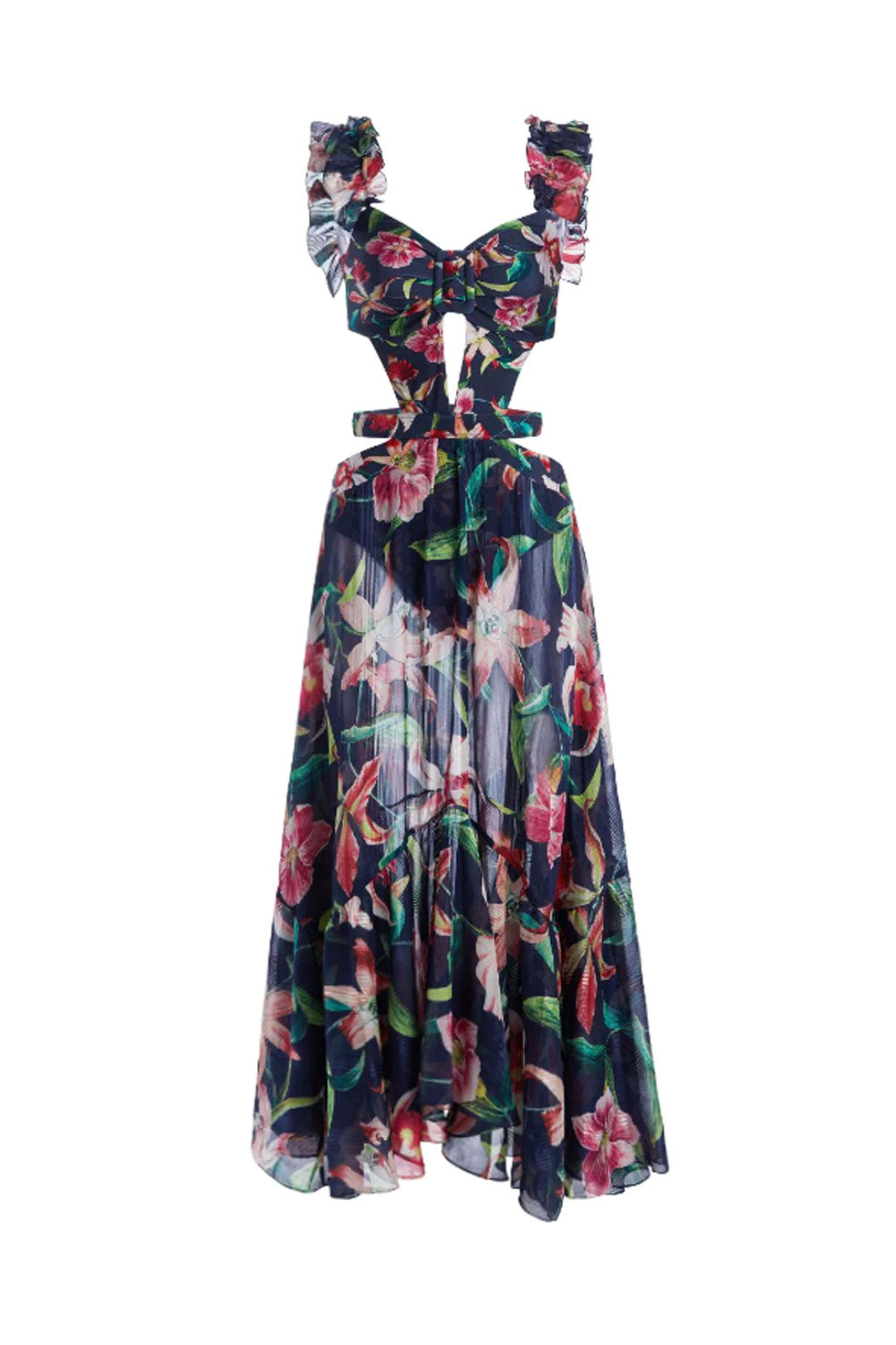 Patbo Midnight Laelia Cutout Beach Dress. Sweetheart neck. Square back; back clasp closure. Sleeveless; ruffle shoulder straps. Keyhole detail at front. Cutout details at sides and back. A line silhouette. Tiered flounce hem. Midi to maxi length. Lined. 100% polyester outer, 87% polyamide, 13% elastane lining.
