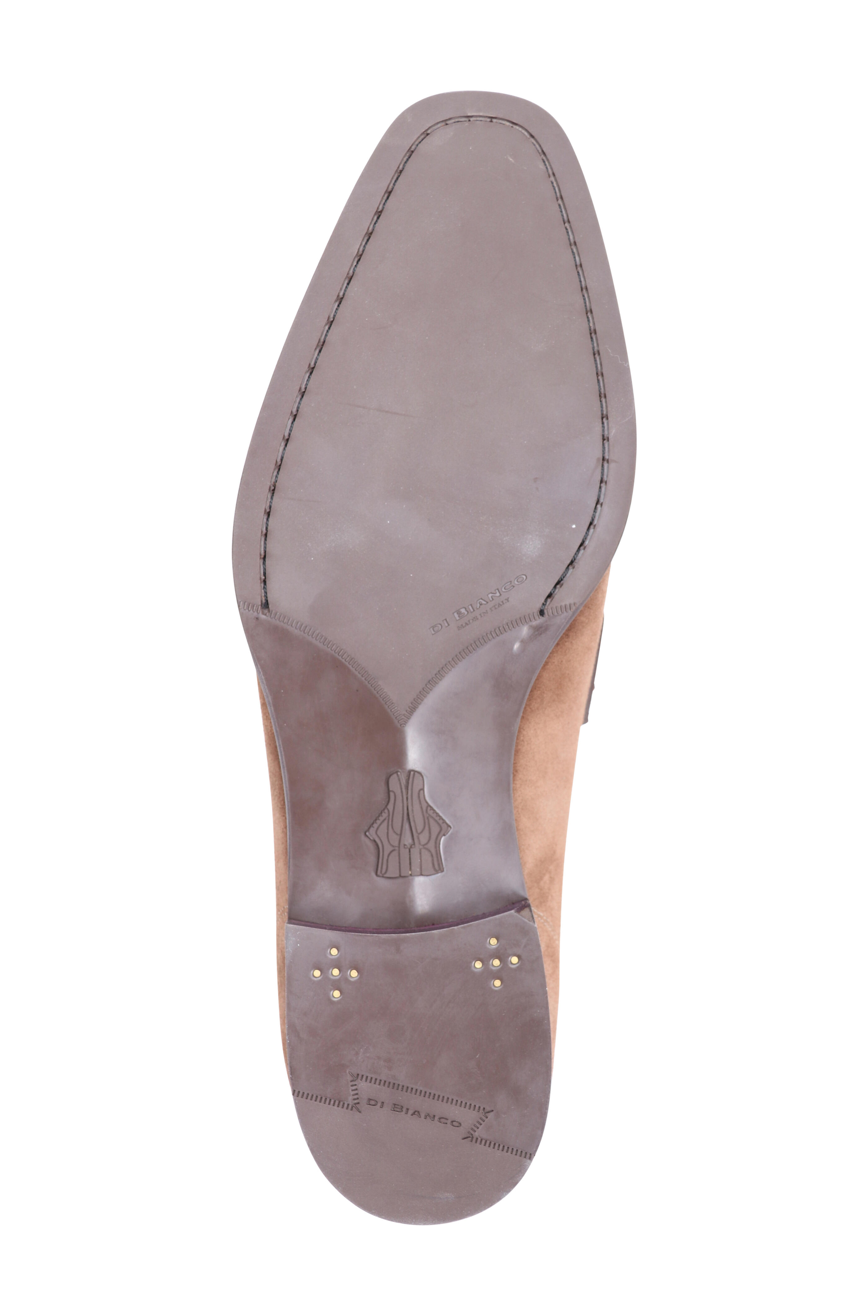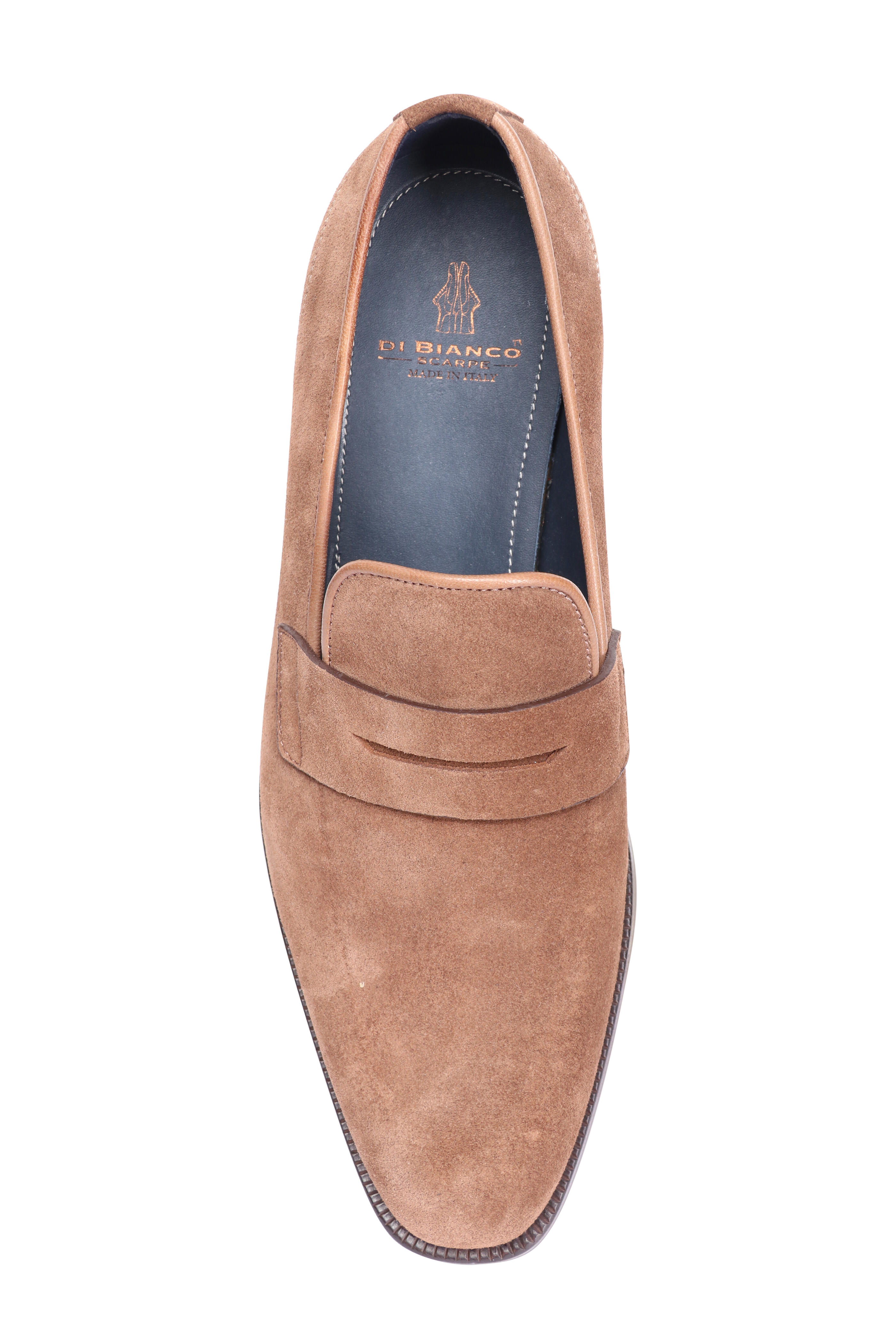 Suede upper. Leather lining and insole. Rubber and leather sole. Almond toe. Notched vamp. Penny keeper strap. Slip-on style. Stacked heel. Made in Italy. All sizes listed are in US measurements.