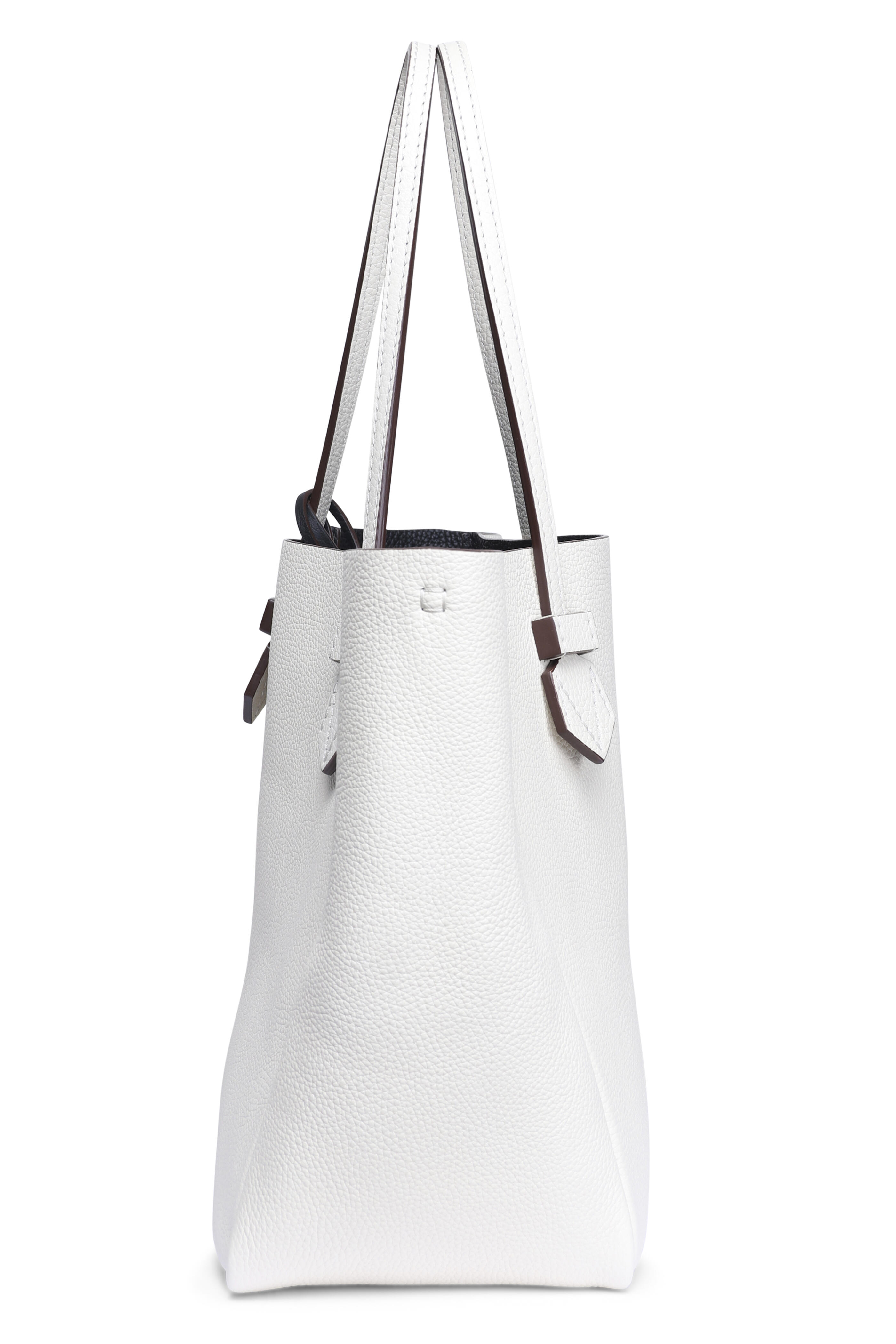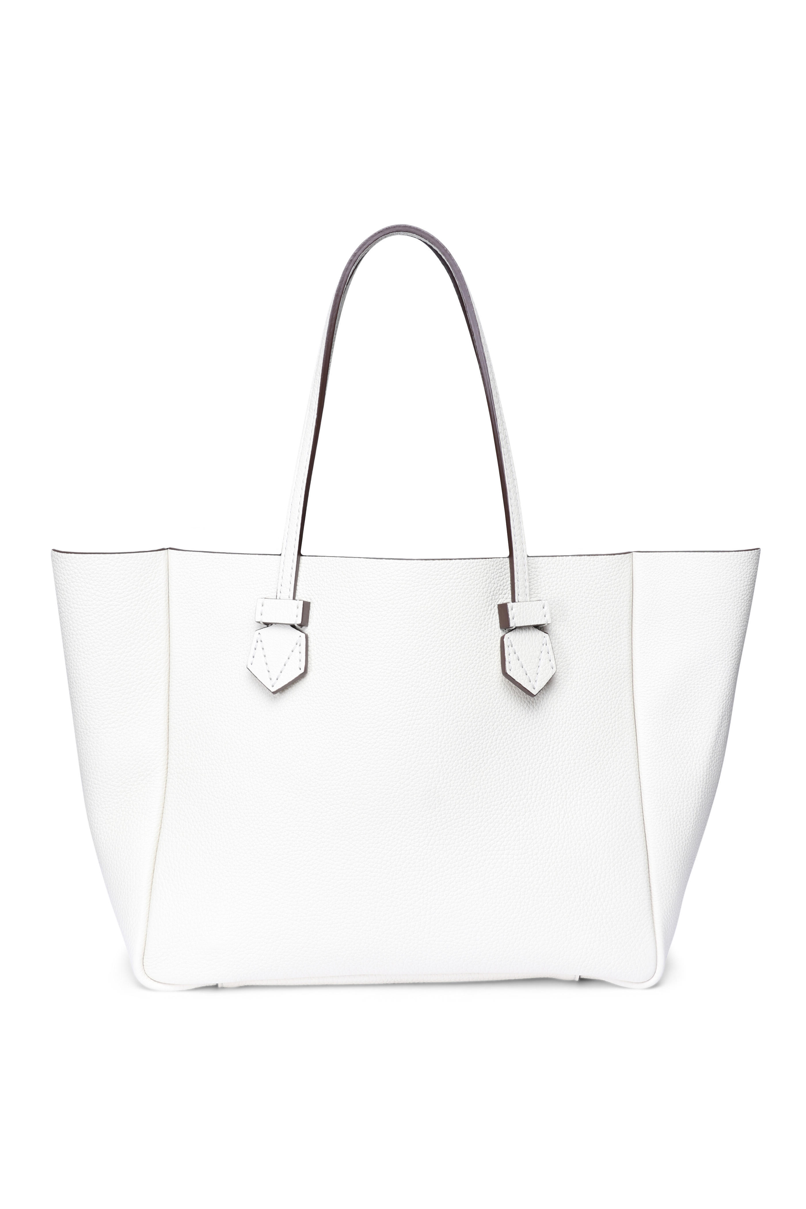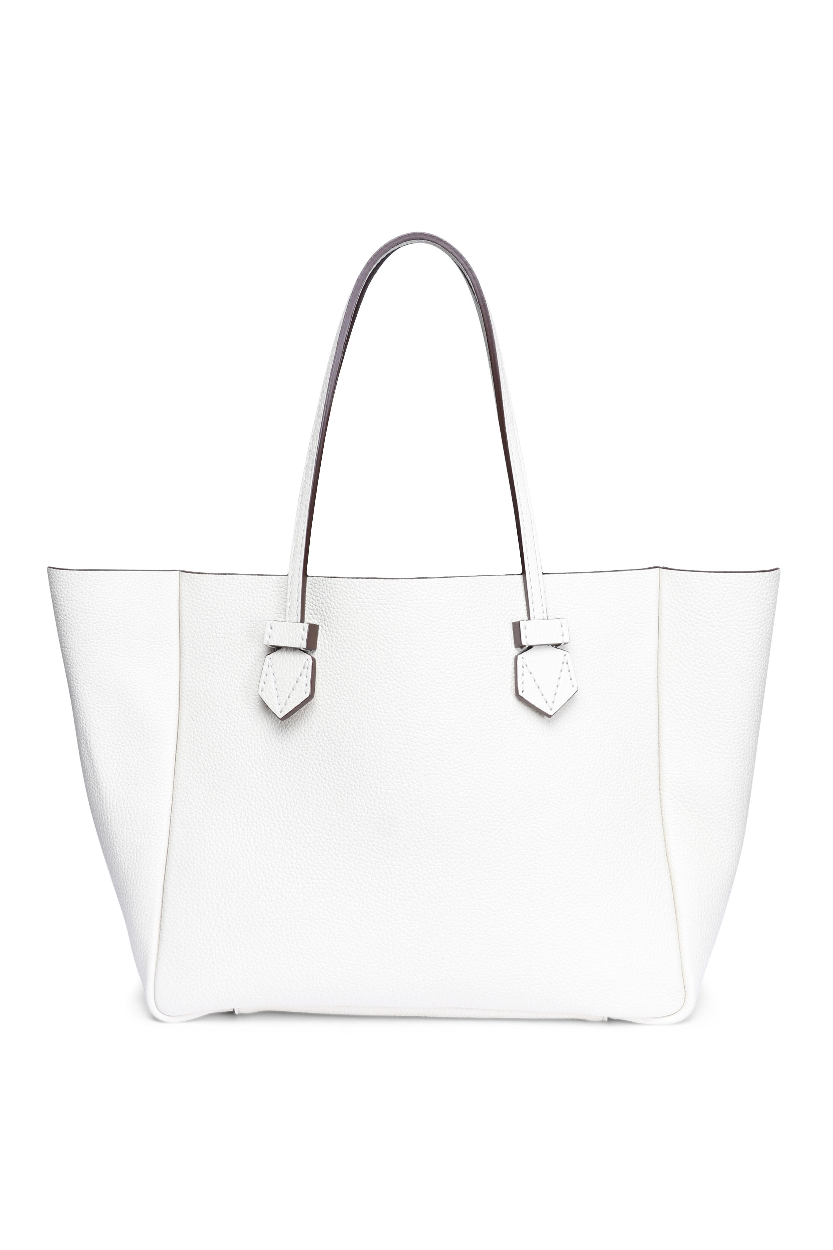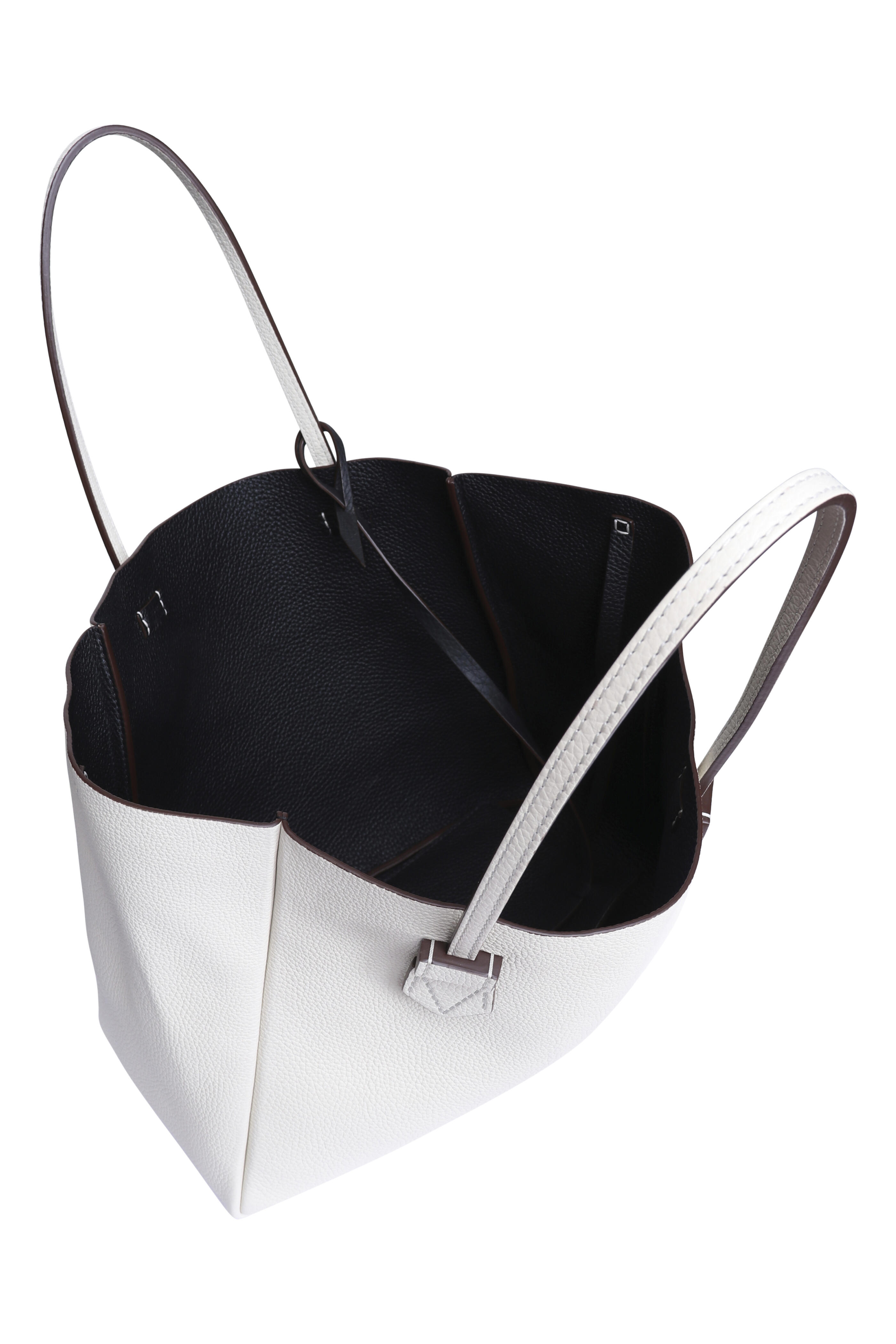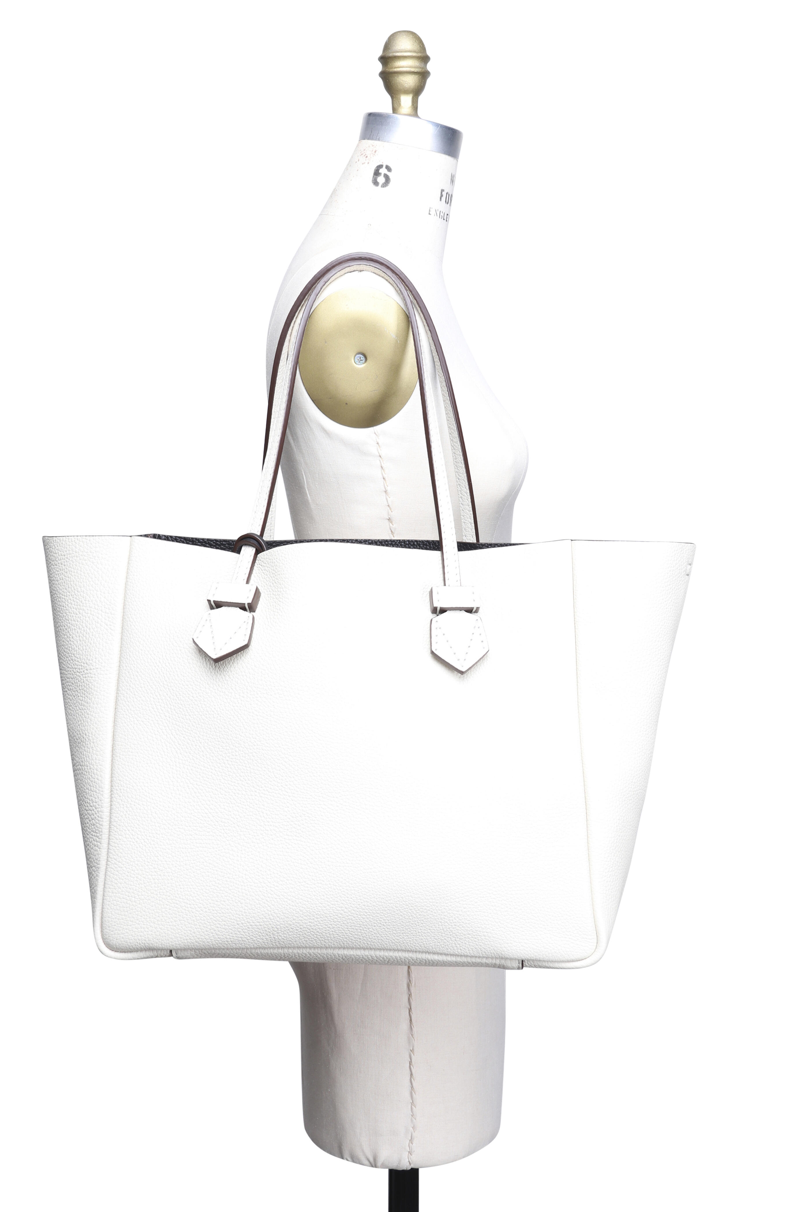 Pebbled calfskin leather outer. Black calfskin leather lining. Open top. Dual handles. Reversible. Champagne leather lining. Made in Italy. Color: Champagne. 11” x 13.38” x 5.51”. Handle drop: 7”.