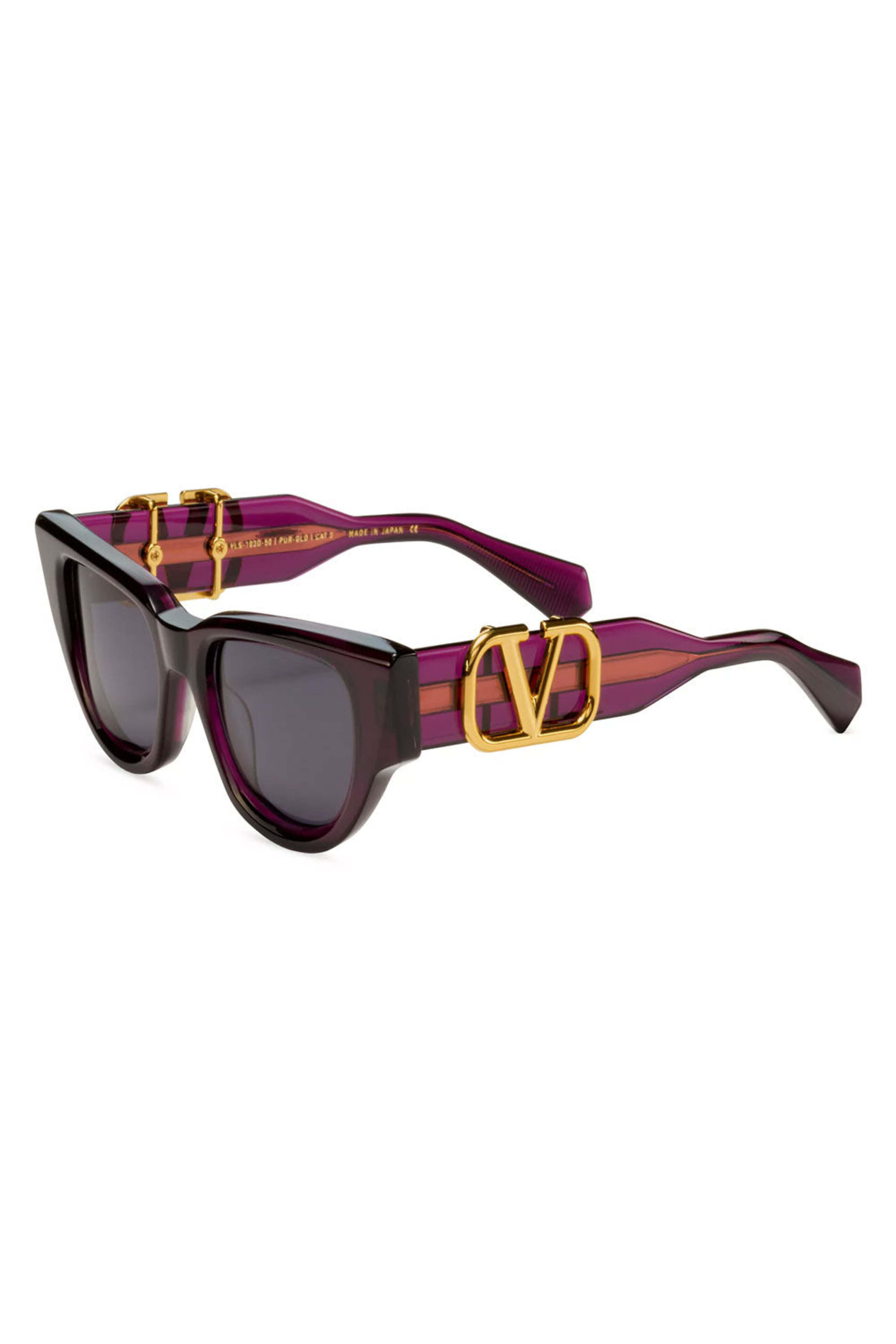 Valentino V-Due Sunglasses in Purple. Cat-eye frames and solid lenses. Crafted from acetate and titanium. Gold-tone logo at temples. Size: 50-18-145. Made in Japan.