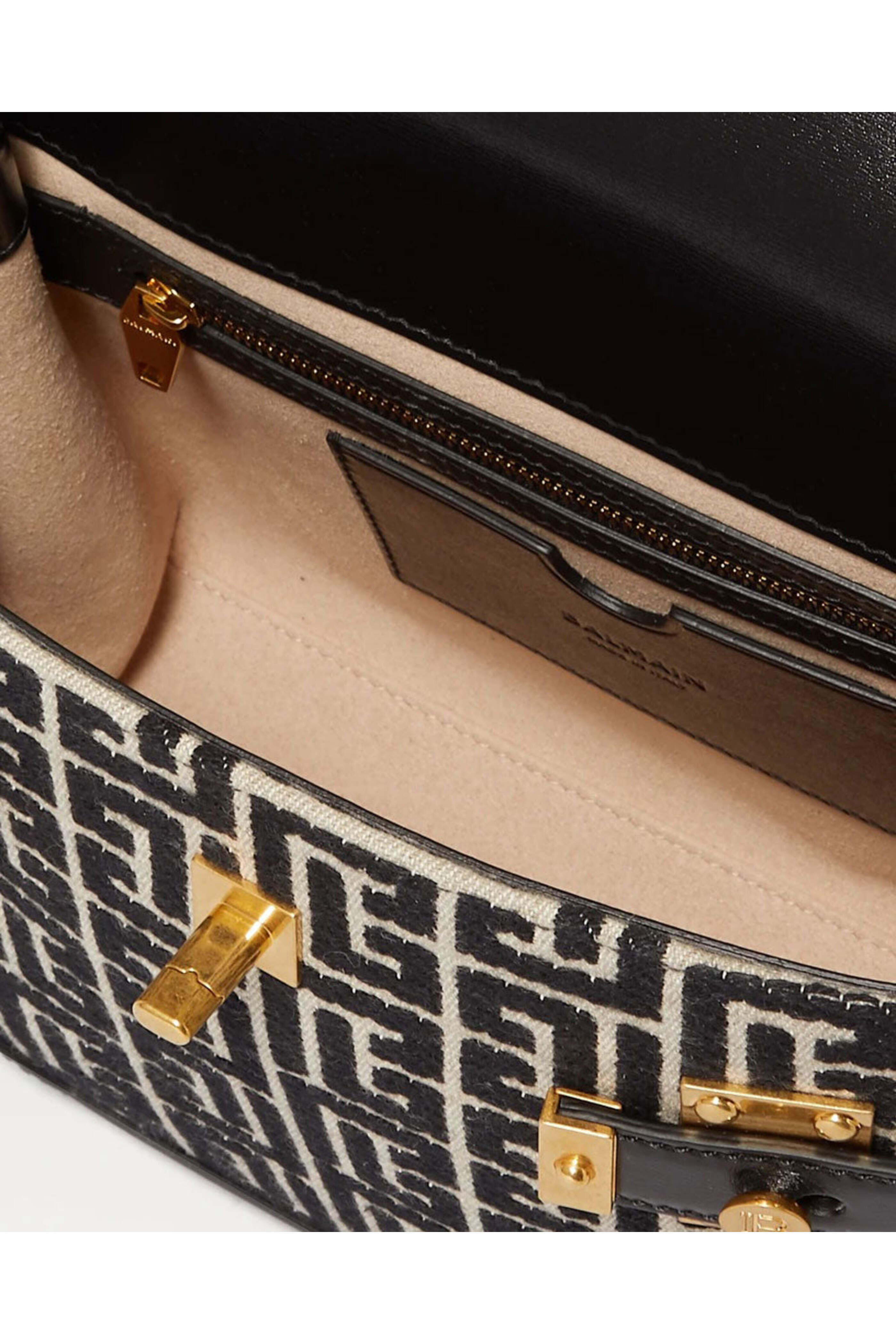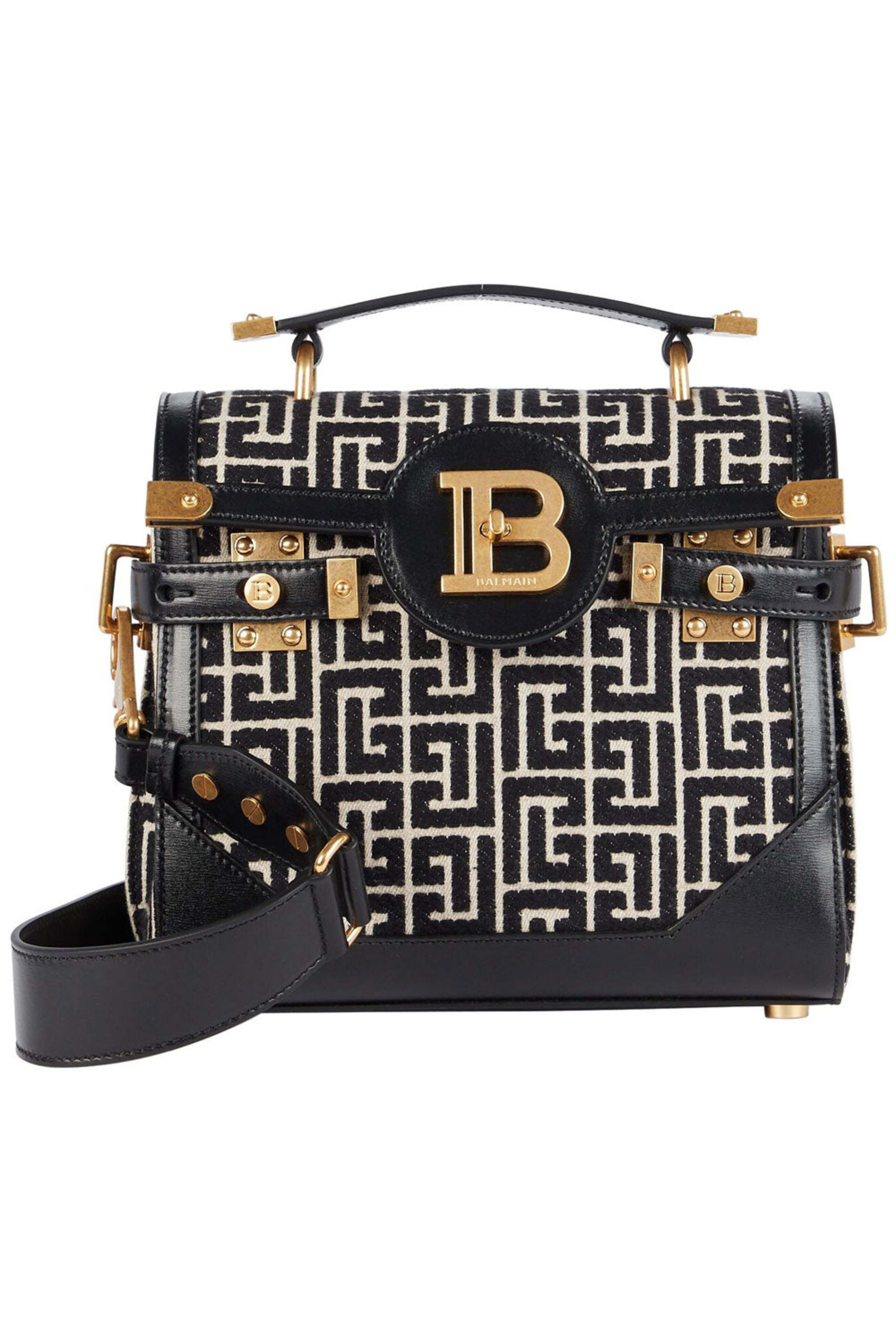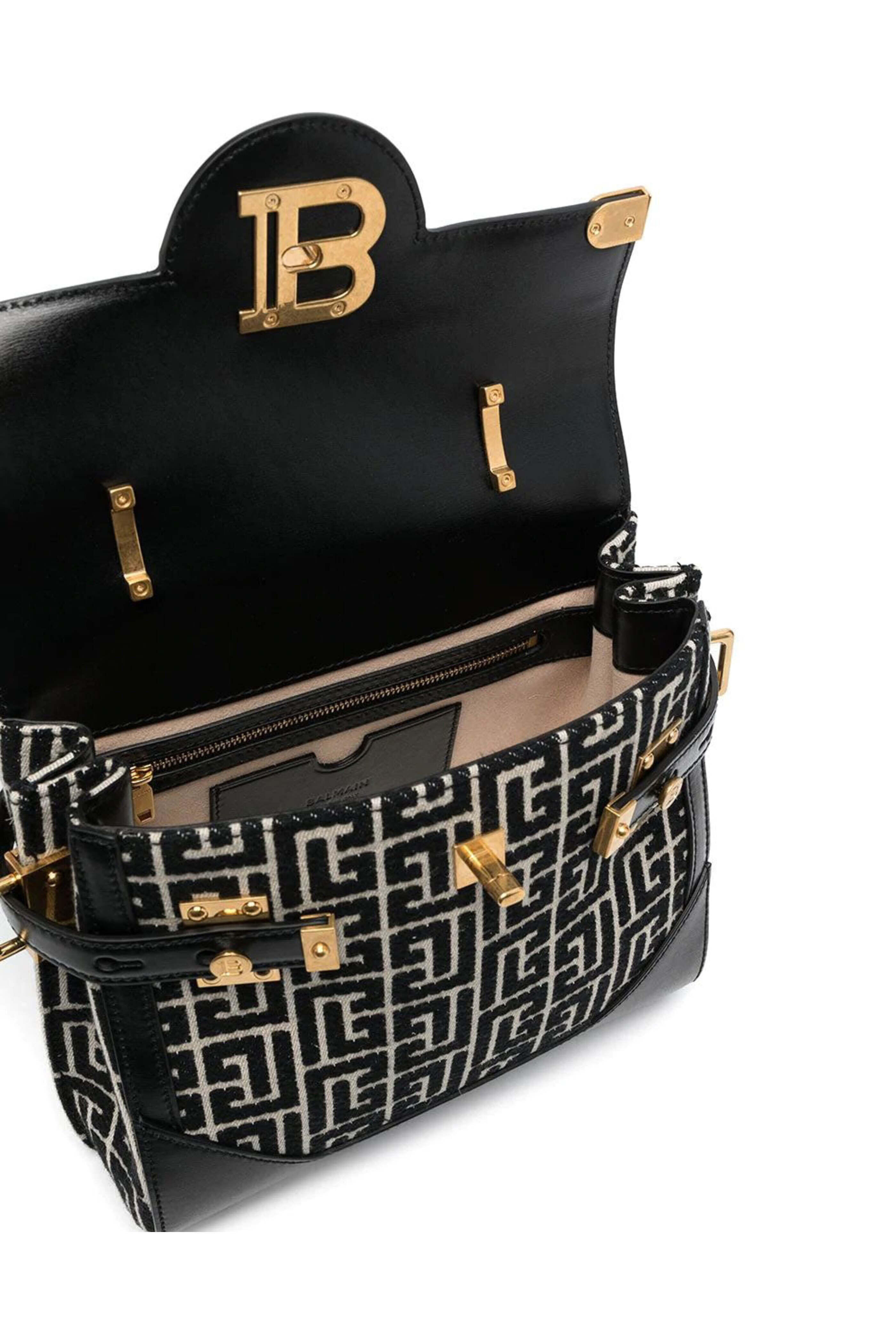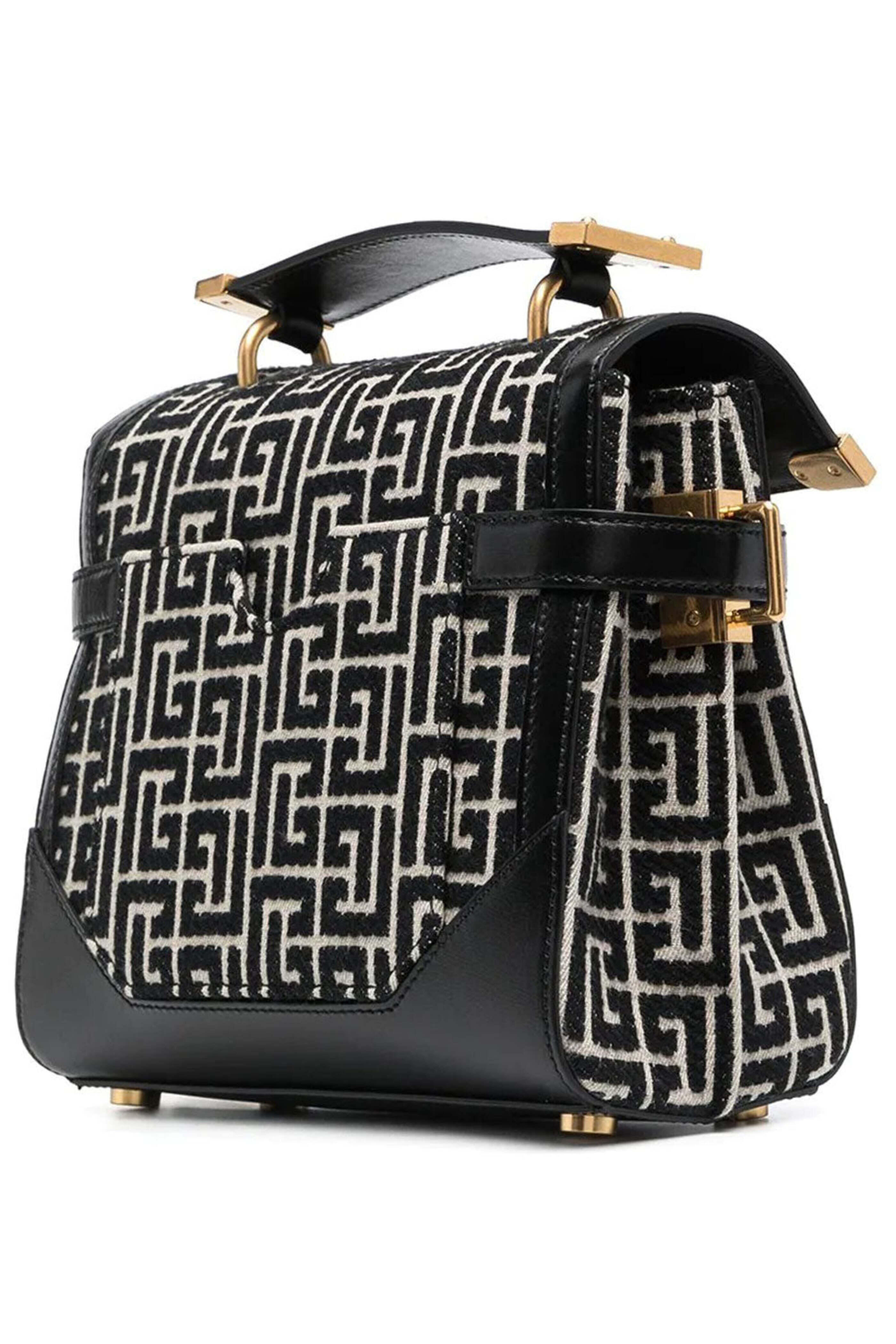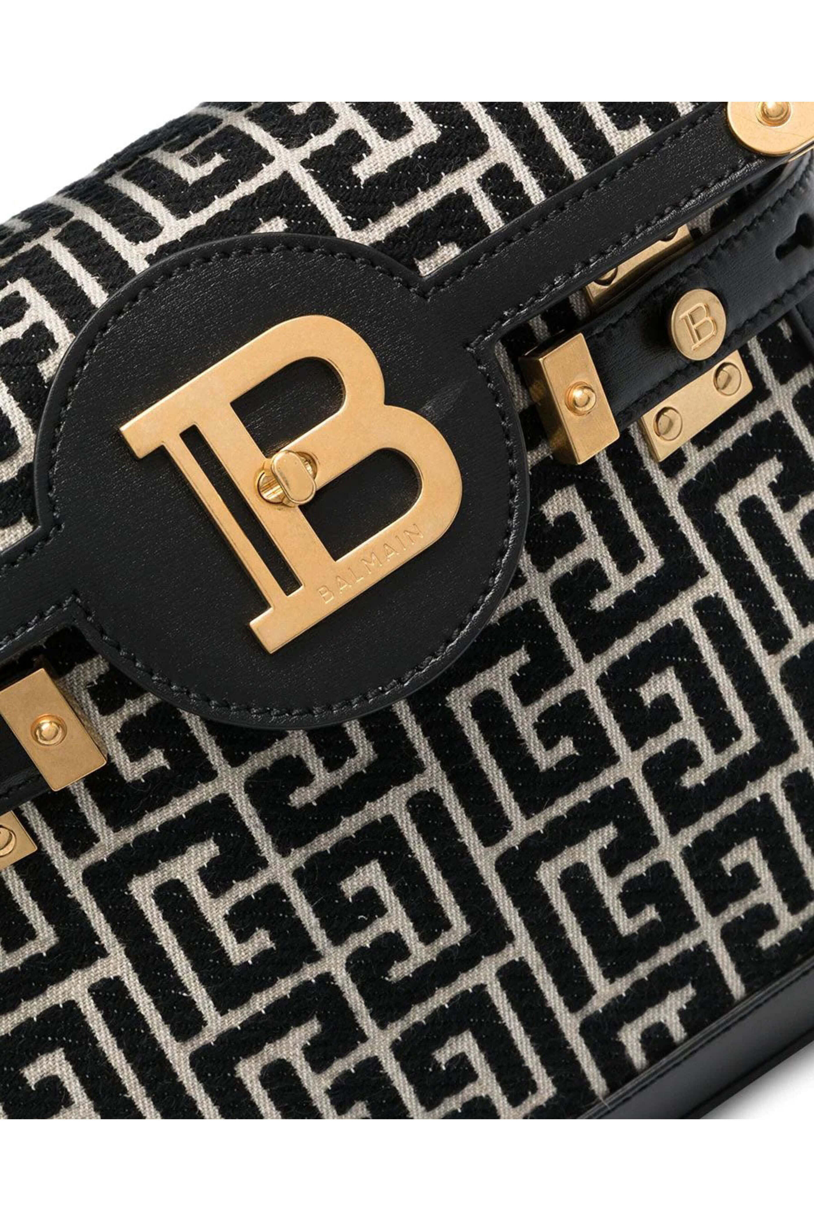 - Balmain B-Buzz 23 Monogram Jacquard Bag Jacquard fabric bag Flap front with twist lock closure Gold tone hardware Suede lined interior One zip pocket One card slot Exterior back pocket Leather trim Adjustable shoulder strap Metal base protective feet 9.1 W X 7.9 H X 4.3 D Made in Italy