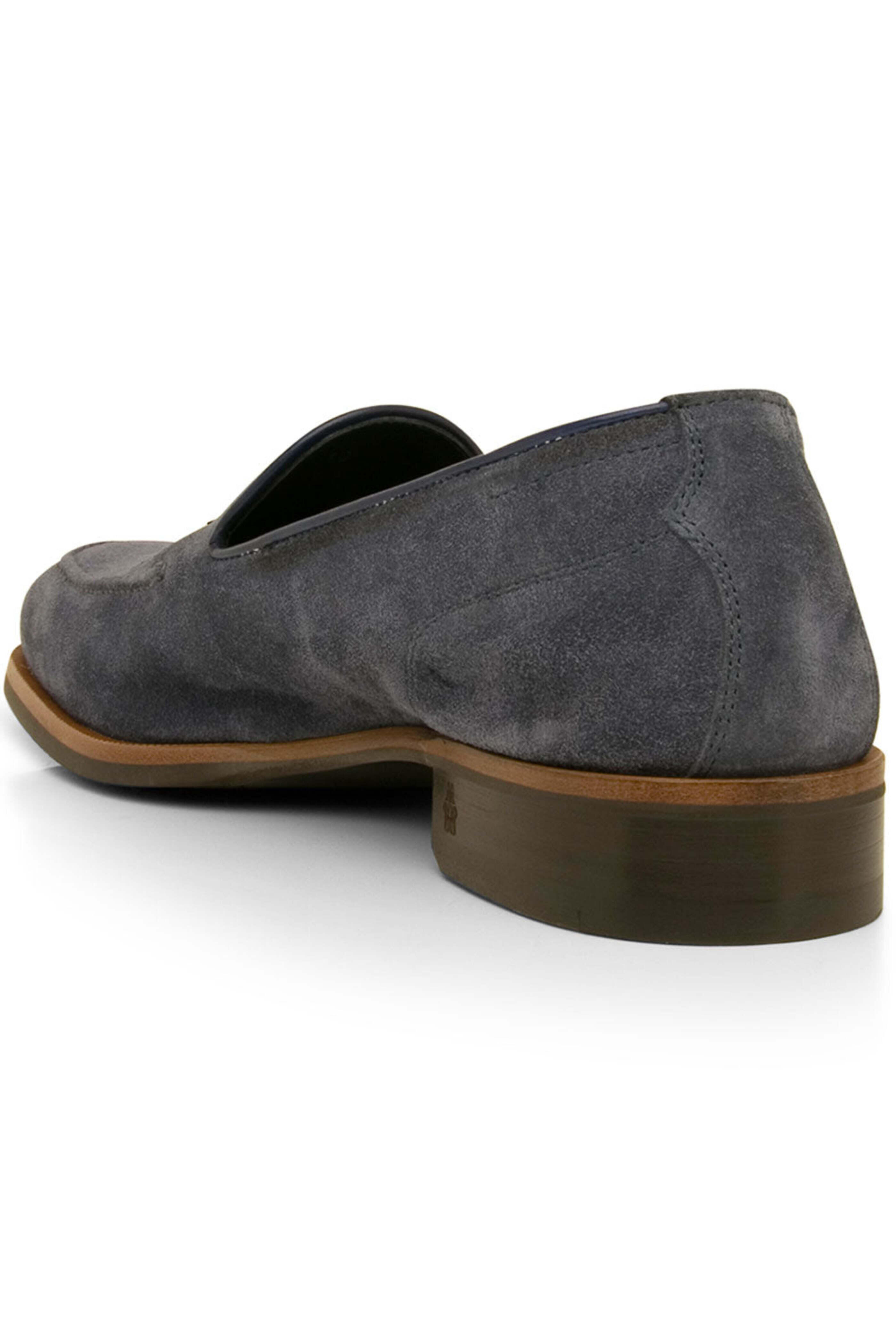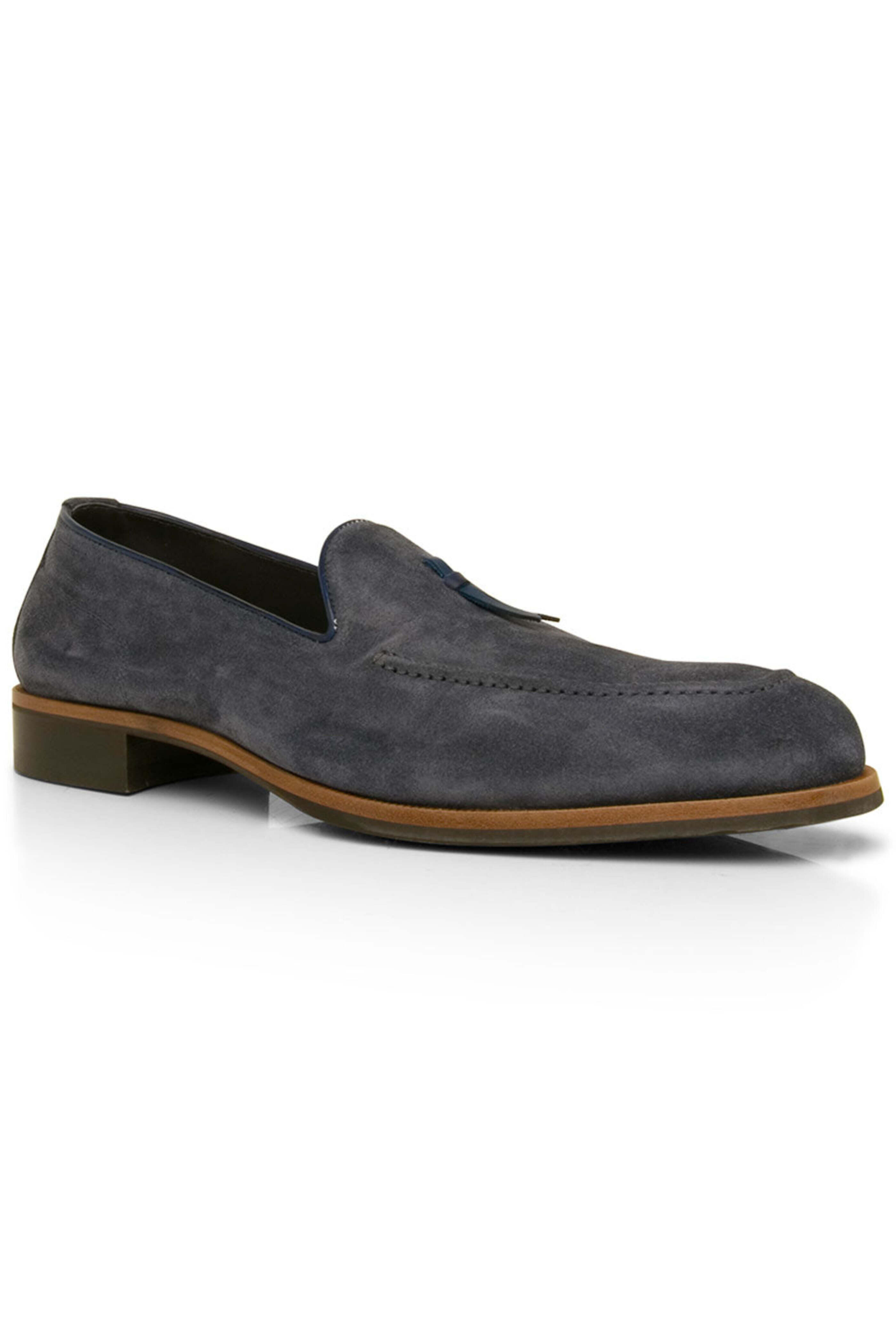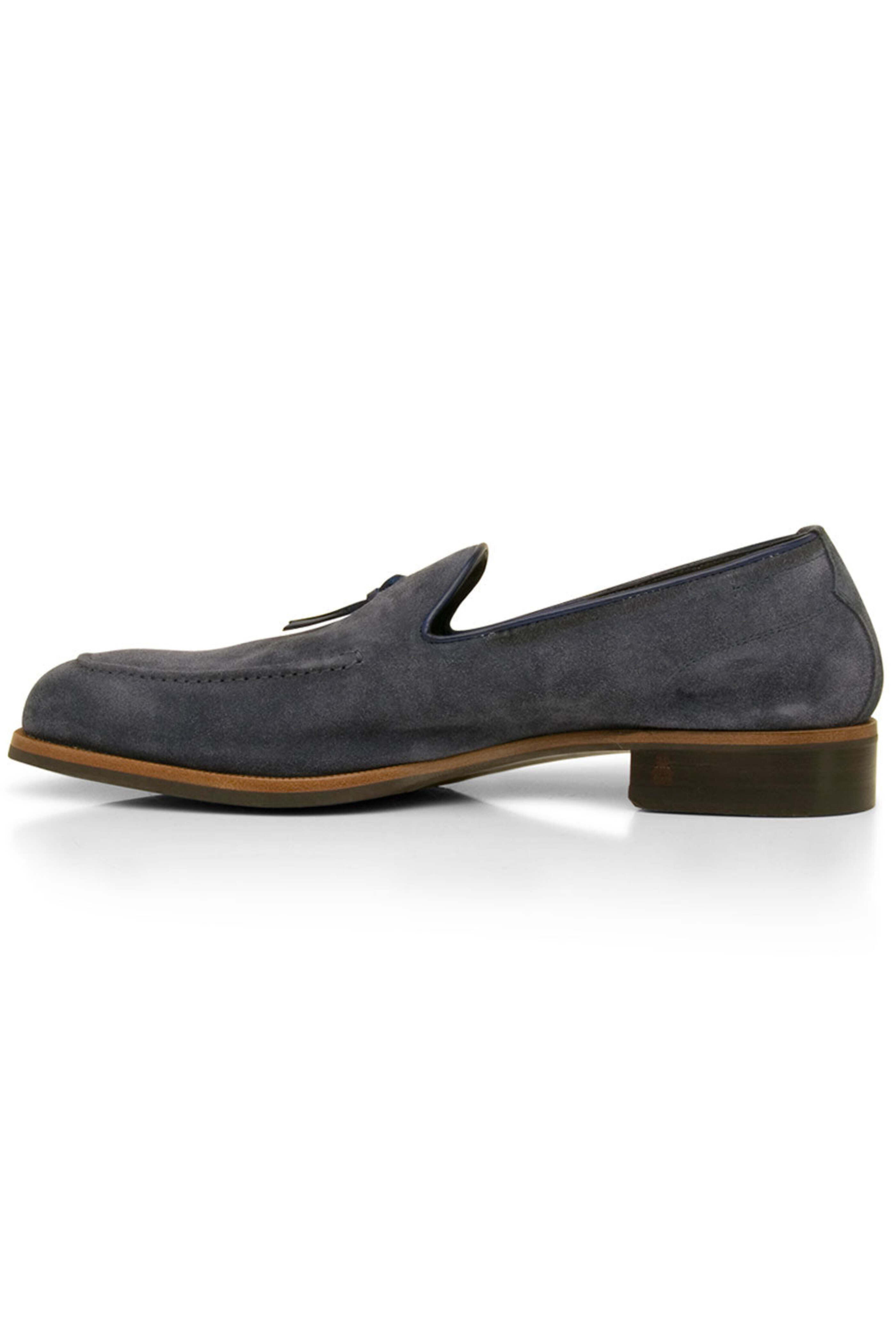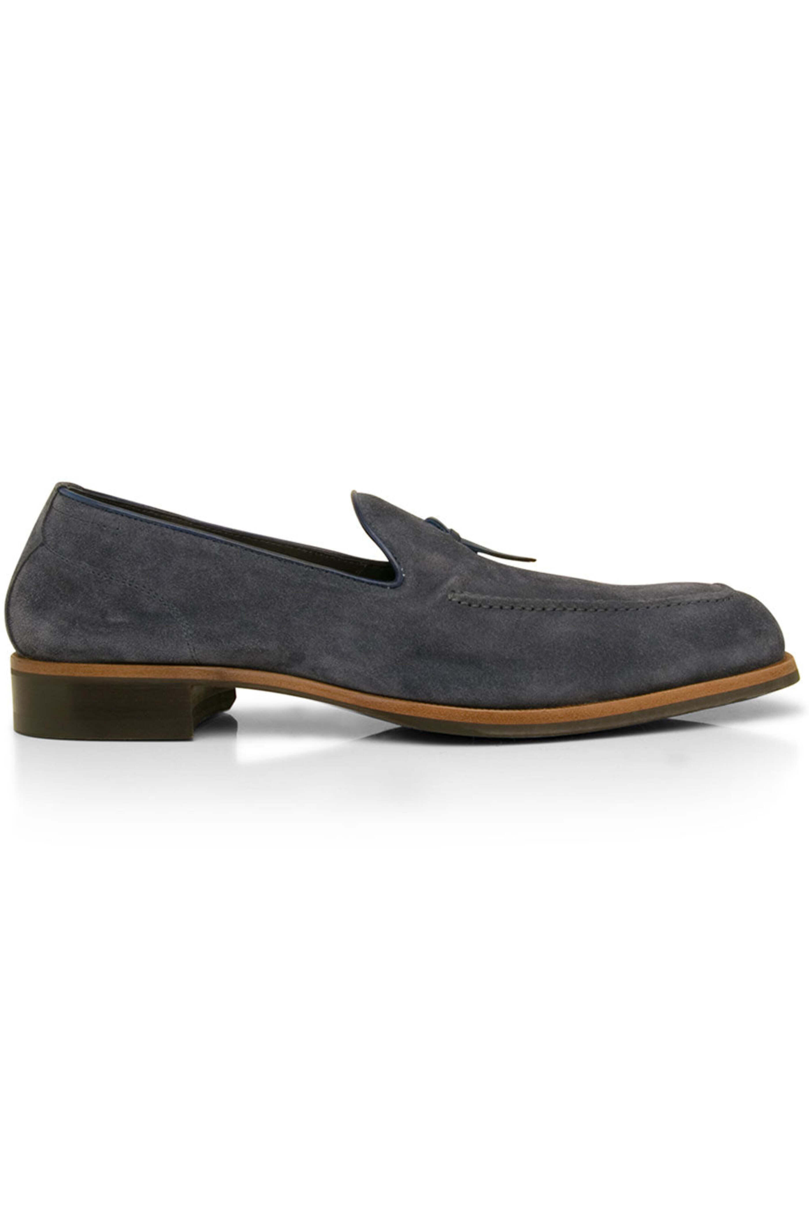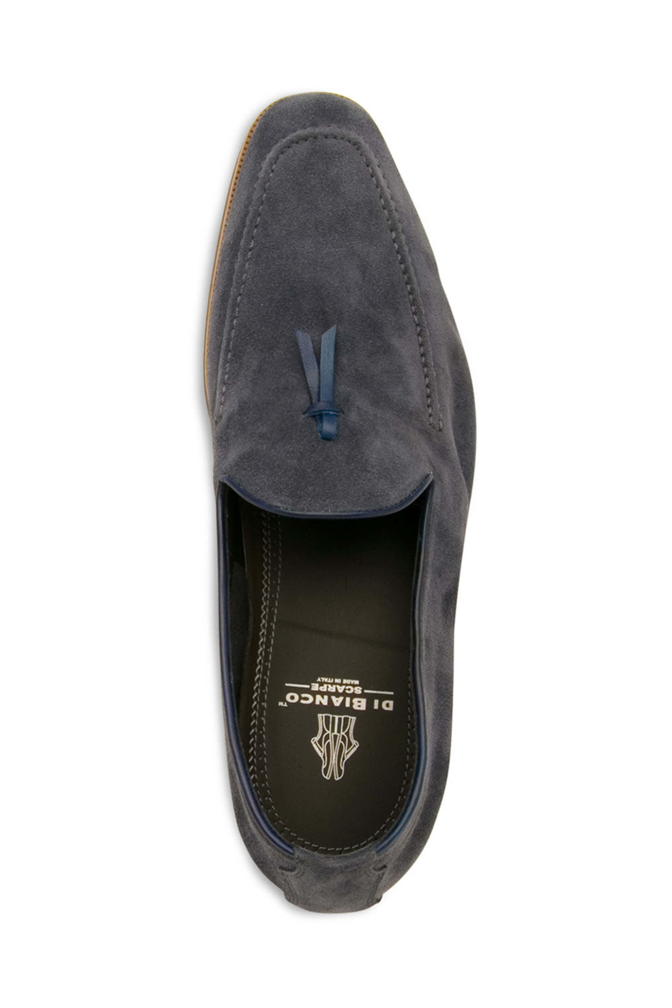Di Bianco Volta Loafer in Denim. Reinforced apron toe. Notched vamp with tassell detail. Slip on. Tonal stitching. Leather trims. Suede upper. Leather lining. Rubber sole. Made in Italy.
