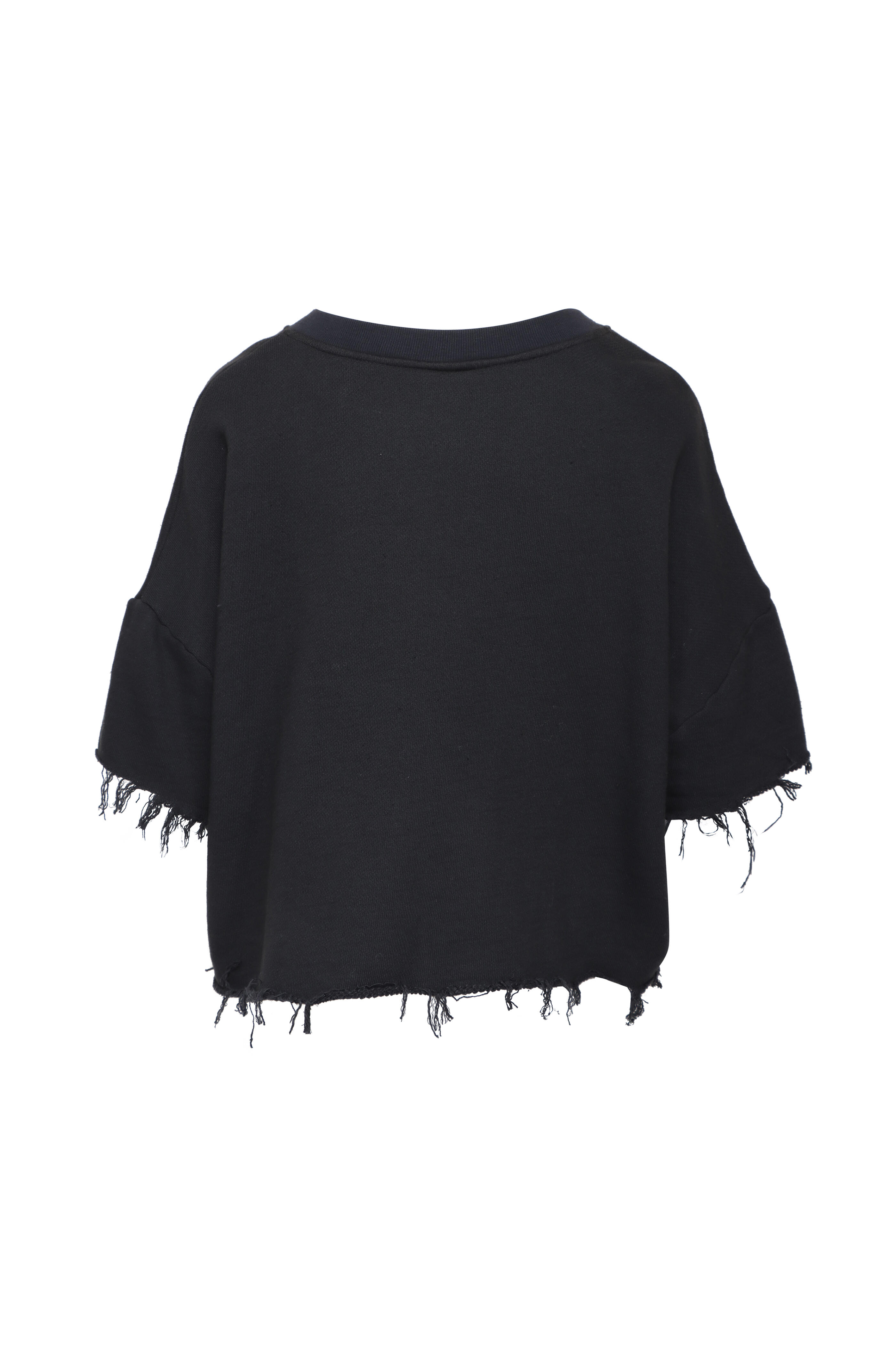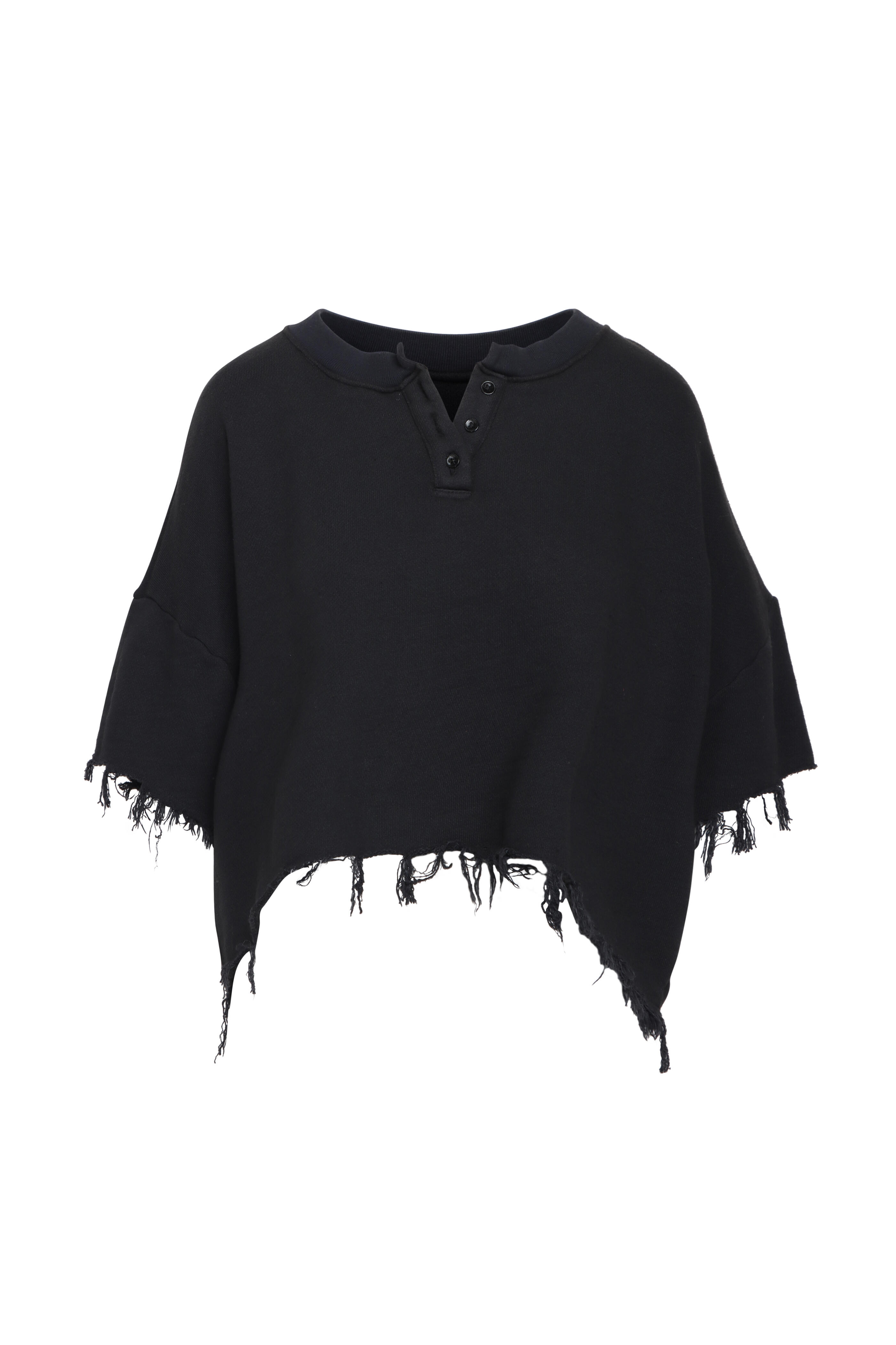 Round neck. Drop shoulders. Short sleeves. Quarter button placket. Boxy fit. Made in LA. Cropped length. 100% cotton. Machine washable.