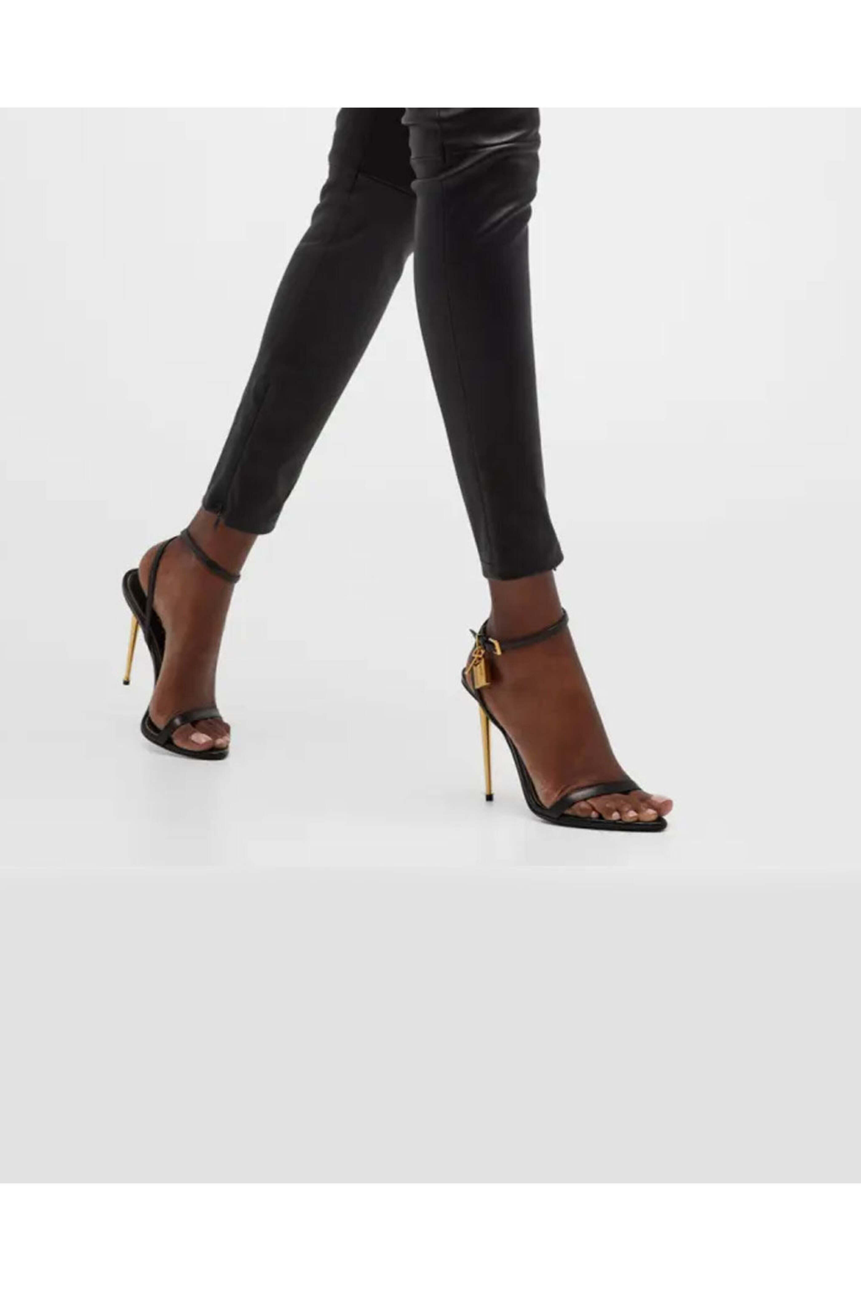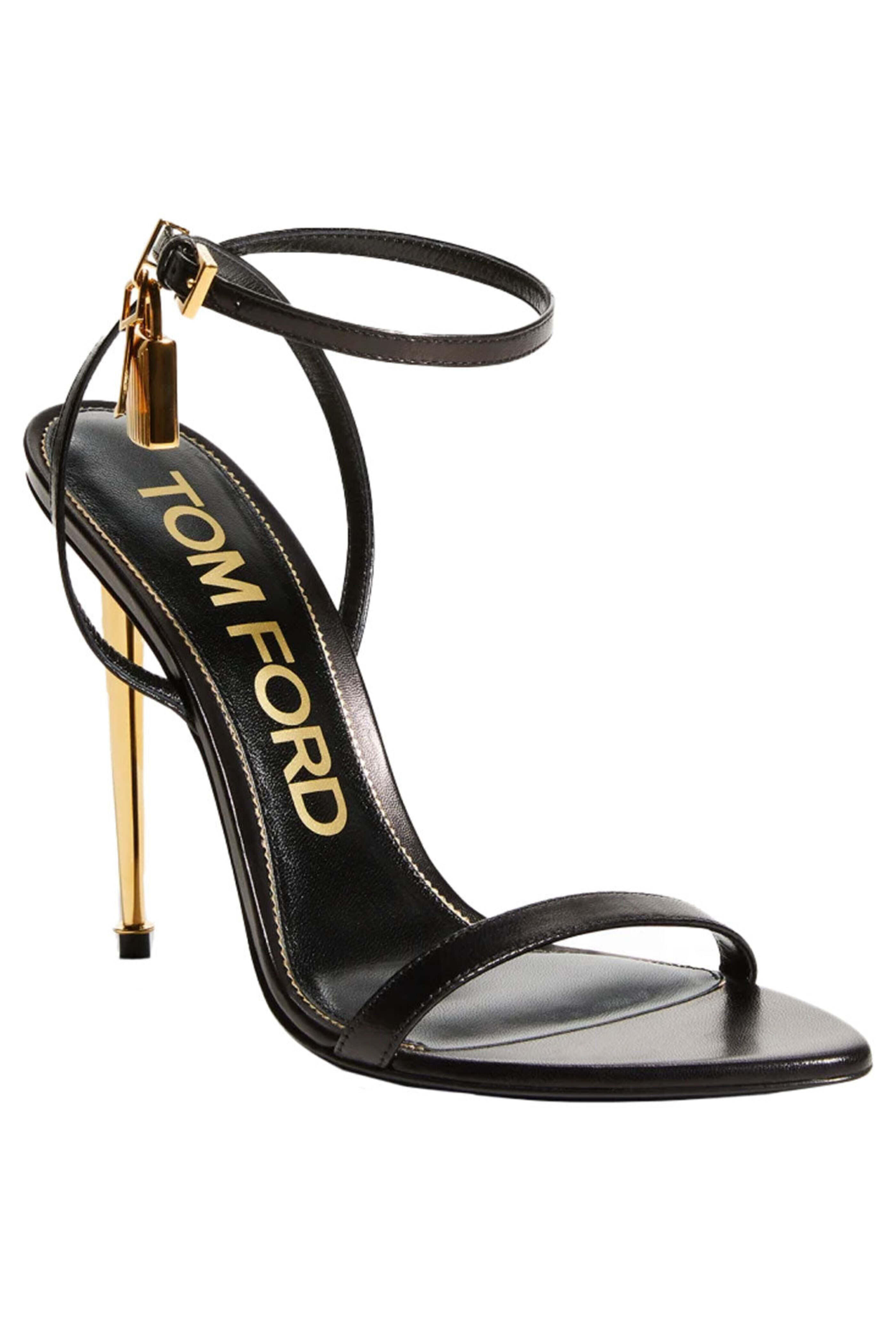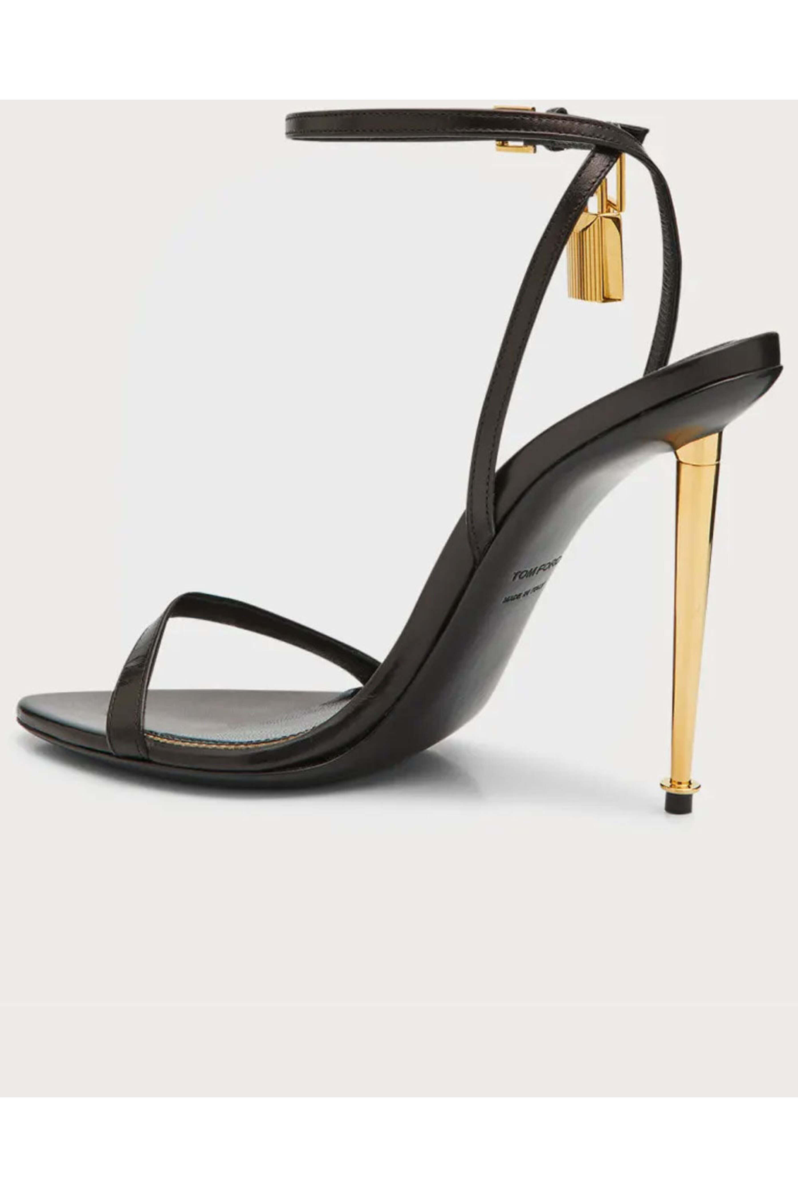 Tom Ford Lock 105 Stiletto Sandal in Black. Open pointed toe. Thin toe strap. Adjustable ankle strap with buckle closure. Padlock charm detail. 4.3 metallic stiletto heel. Gold tone hardware. Leather upper, lining and sole. Made in Italy.