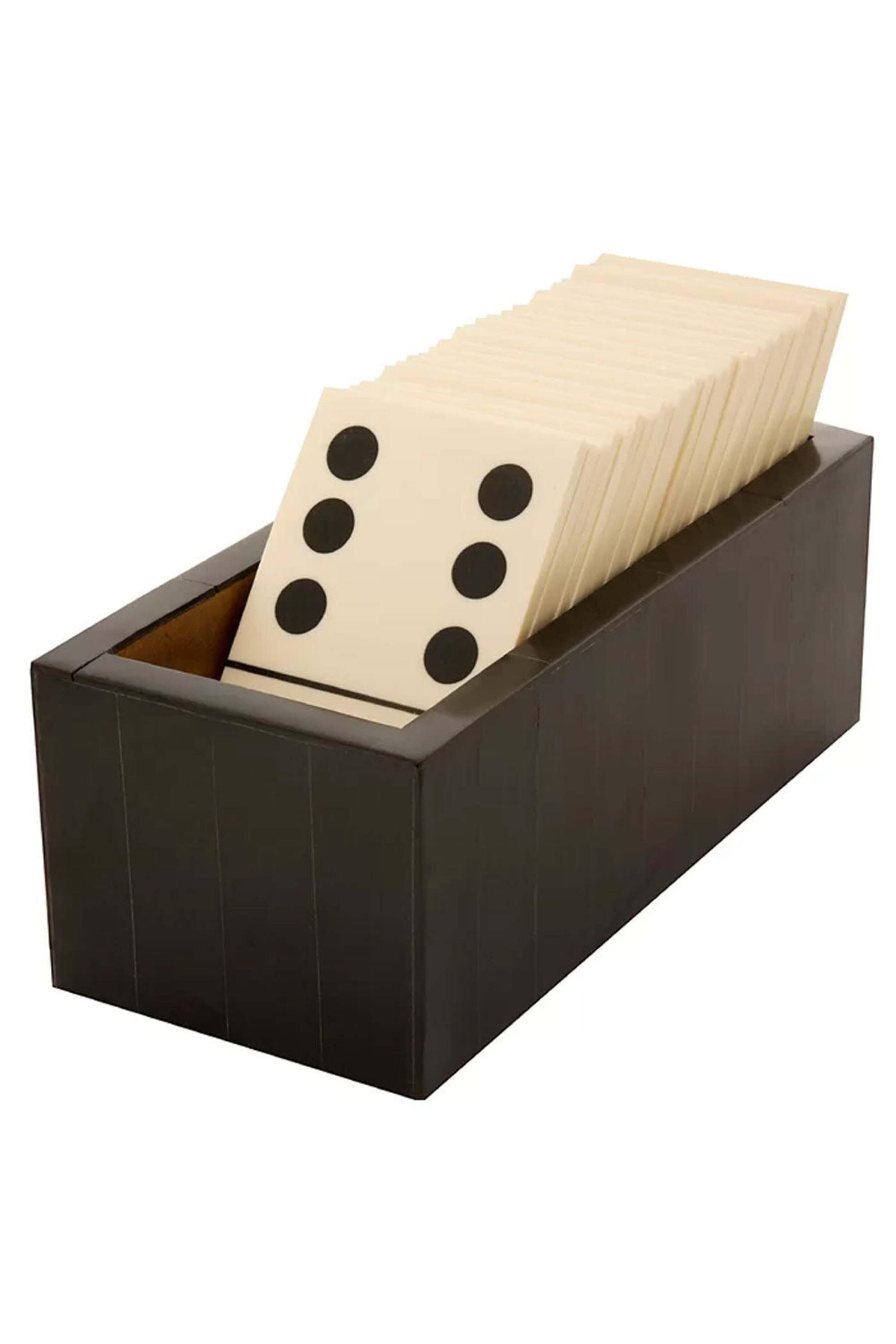 Tizo Bone Domino Set in Black. Faux-horn/ bone dominos. Oversized. Black tray. 5.5'' H x 3.75'' W x 8.25'' L.