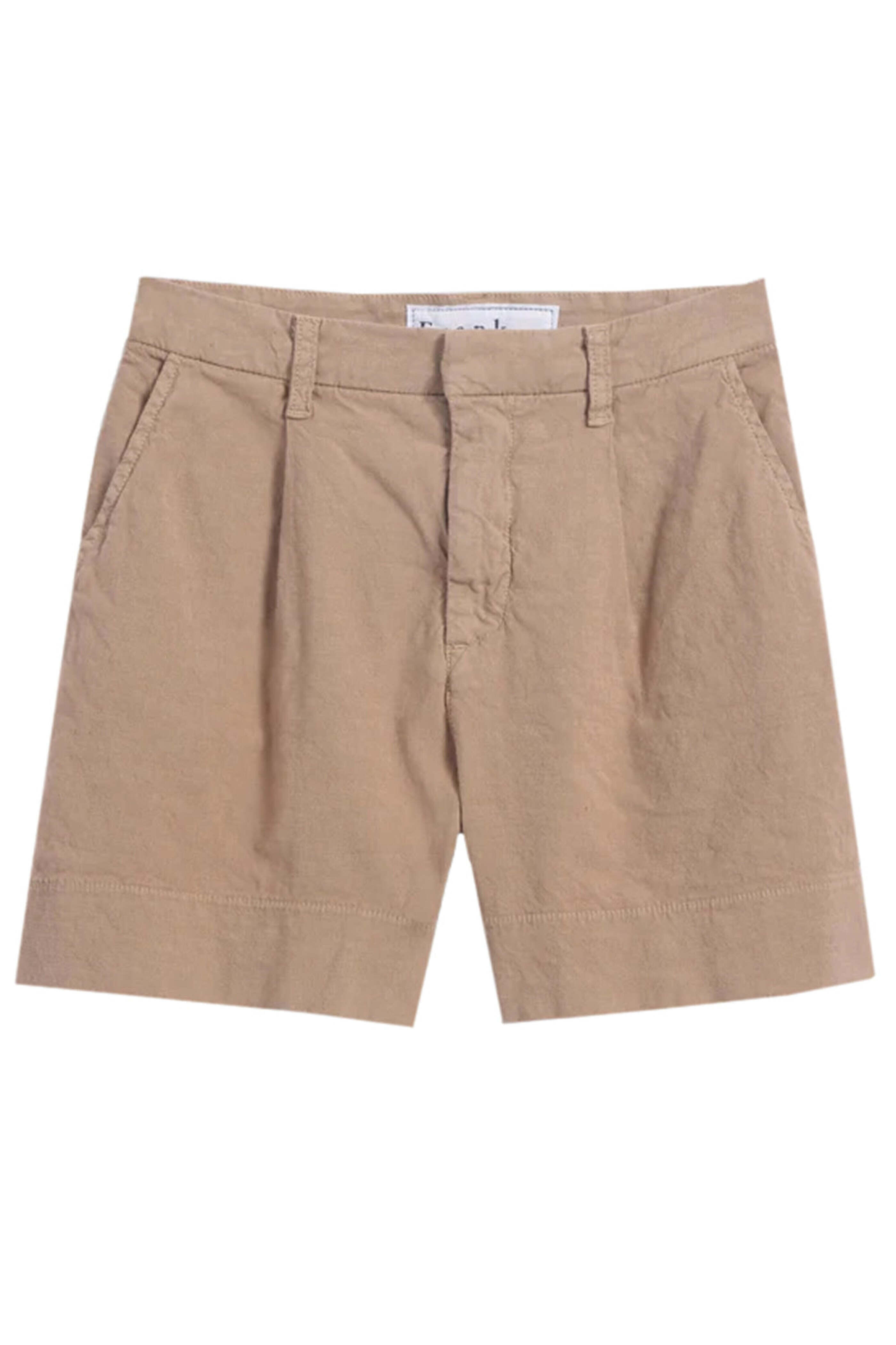 Frank & Eileen Tiramisu Linen Waterford Short. Mid rise. Hook and eye closure. Zip fly. Belt loops. Front slip pockets. Back patch pockets. Wide through leg. Short length. Linen fabrication. 50% cotton, 48% linen, 2% elastane.