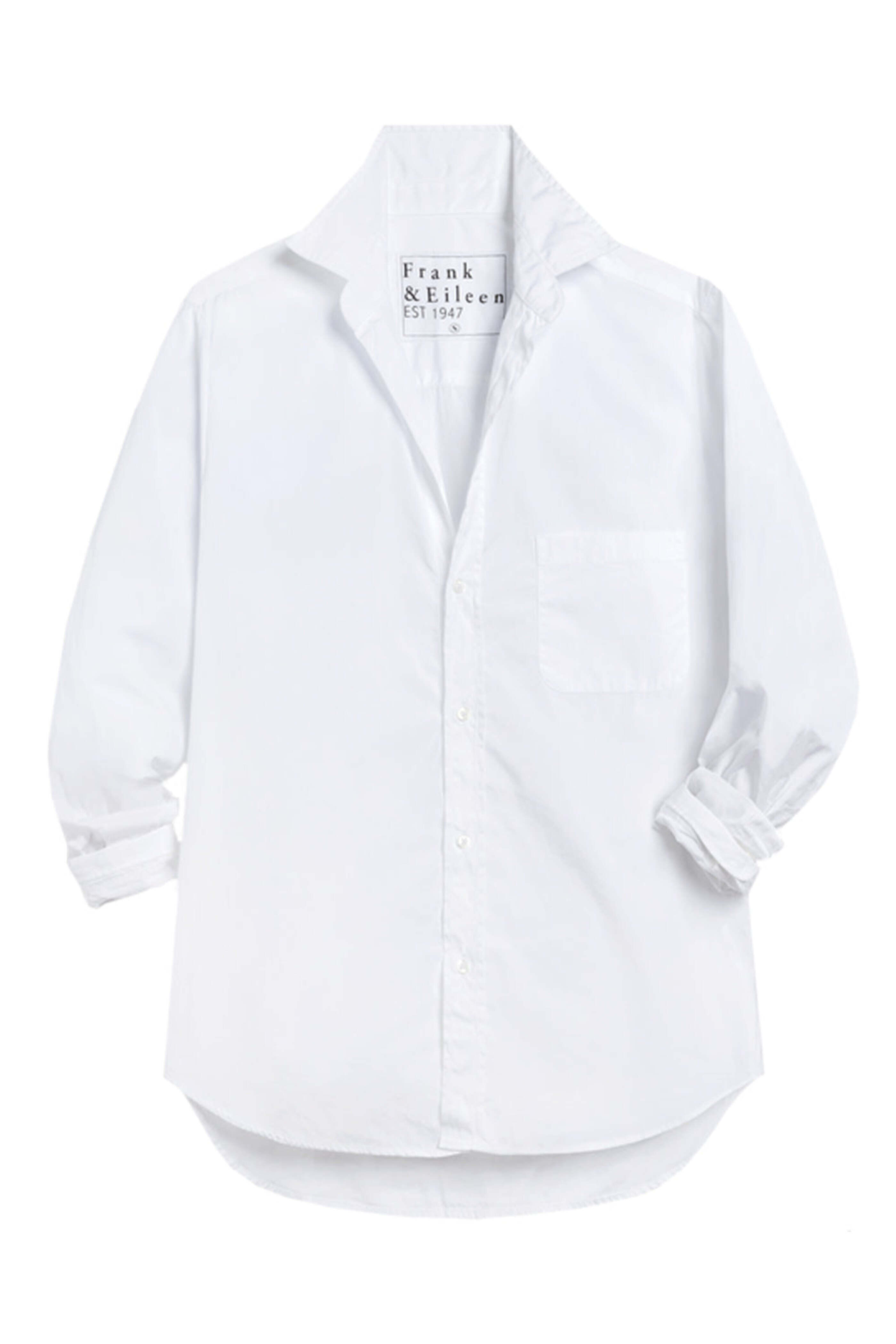 Frank & Eileen White Waverly Button Up Shirt. Collar. V neck. Long sleeves; button cuffs. Button down front closure. Single chest patch pocket. Tailored fit. Rounded high low hem. Superluxe fabrication. Frank & Eileen x Julianne Moore Collection. 100% cotton.