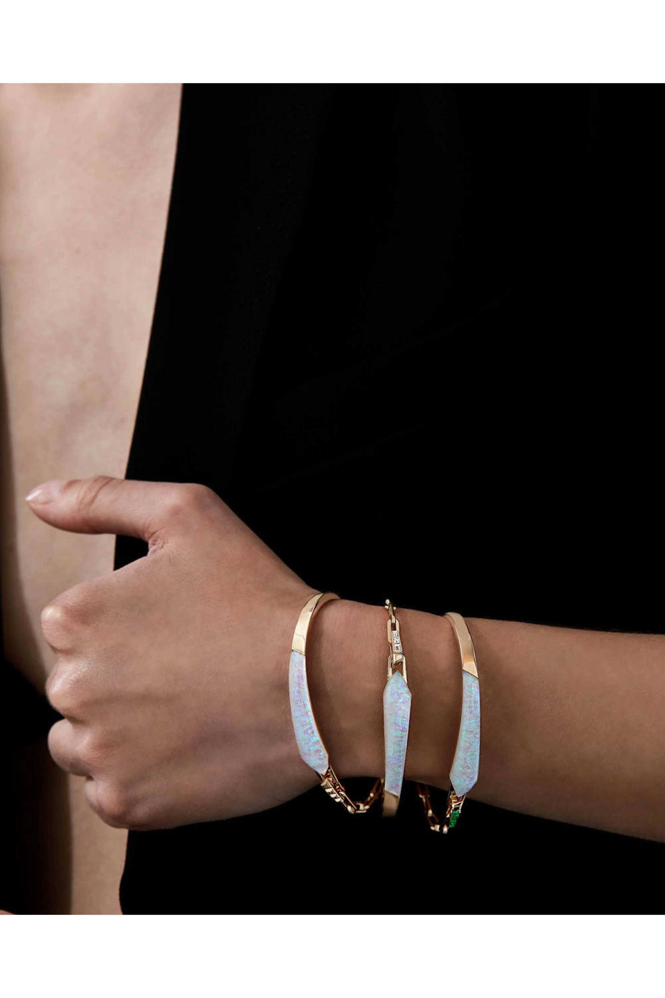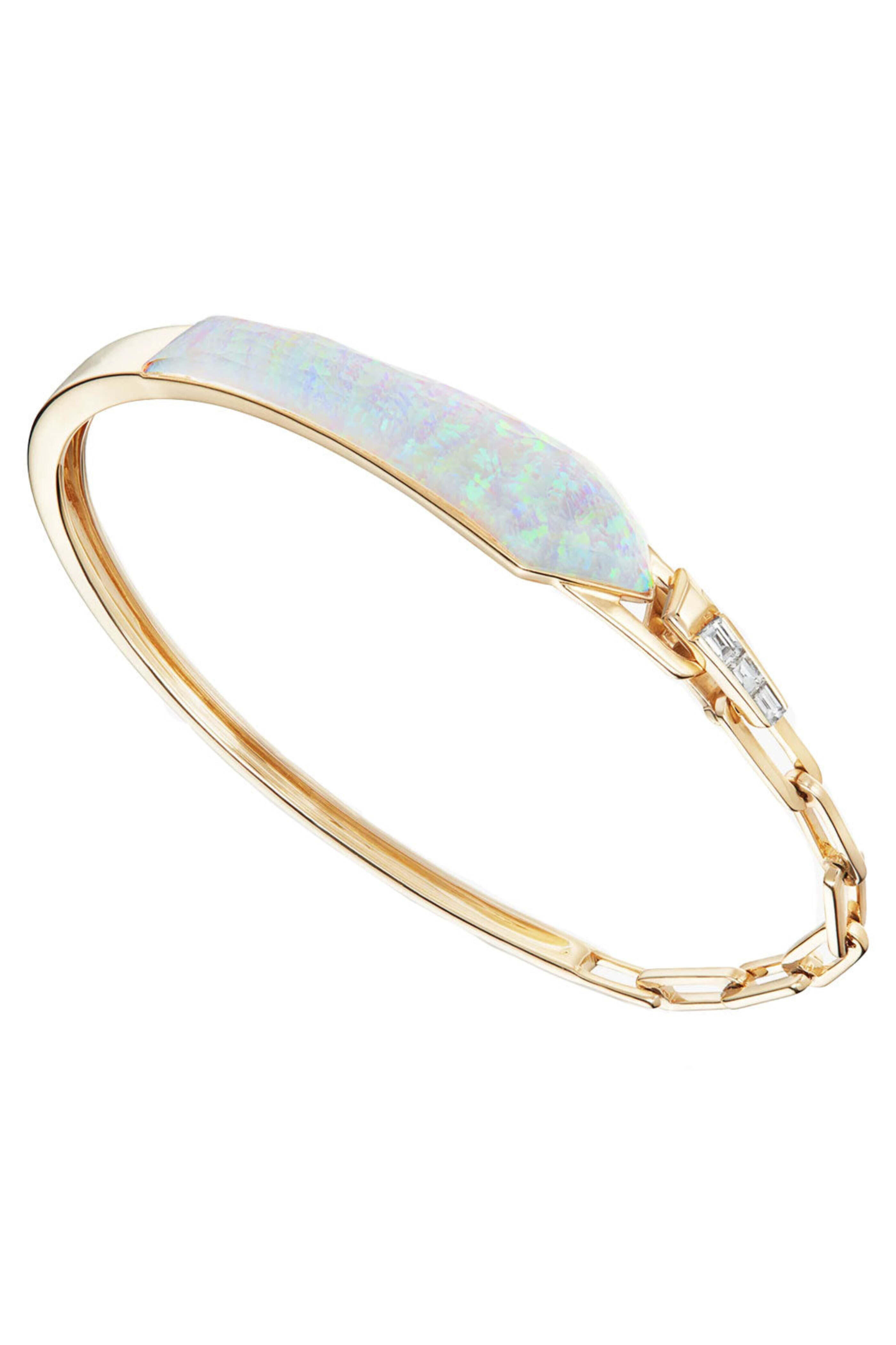Stephen Webster Crystal Haze Shard Slimline Linked Bracelet. 18k yellow gold. Crystal haze opal 9.43 total carat weight. Baguette diamond 0.17 total carat weight. Link chain. Bangle. Shard slimline with baguette diamond accent. 0.36 W x 1.45 L. Hinge clasp.