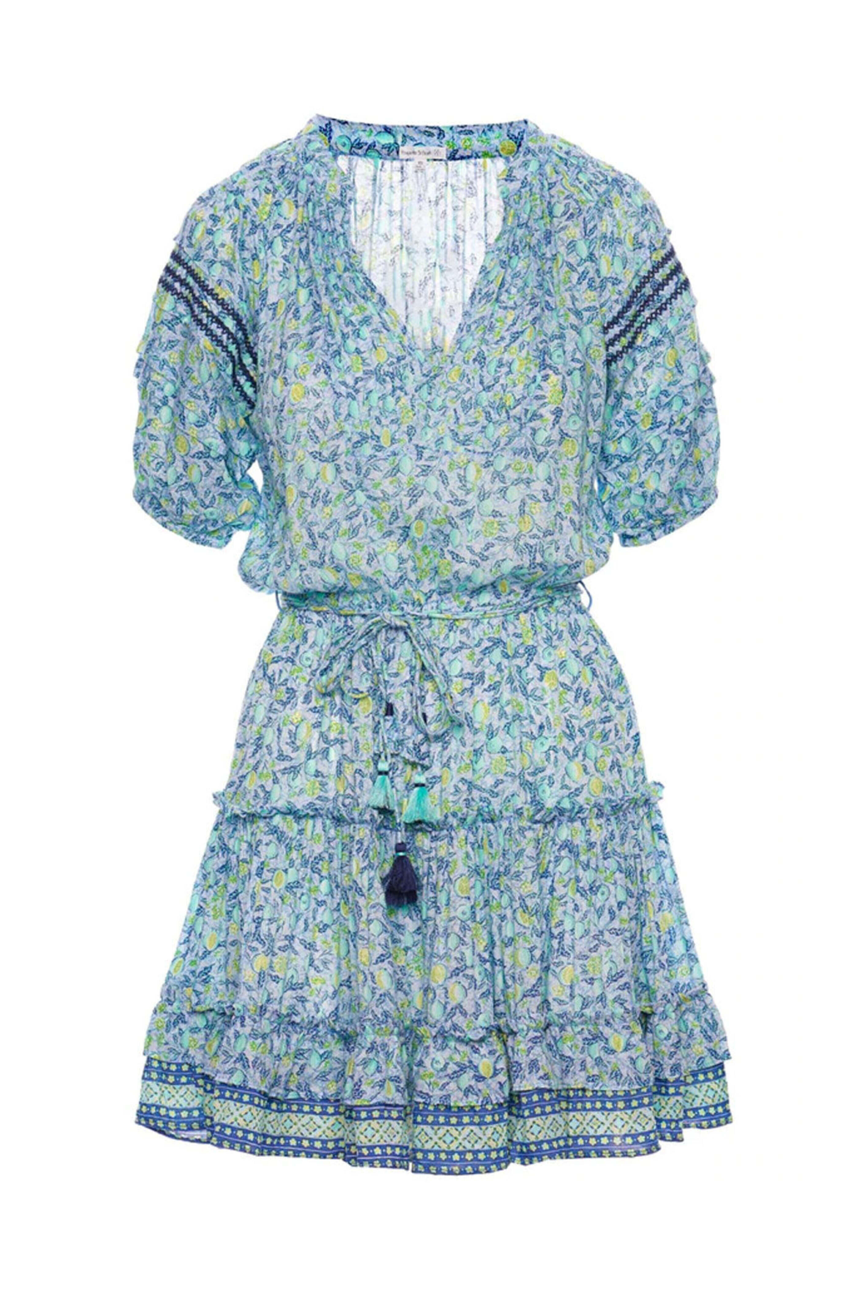 Poupette St. Barth Blue and Lemon Bona Mini Dress. V neck. Elbow length puff sleeves. Elastic waist; self-tie detail. Tiered skirt. Mini length. 100% viscose.