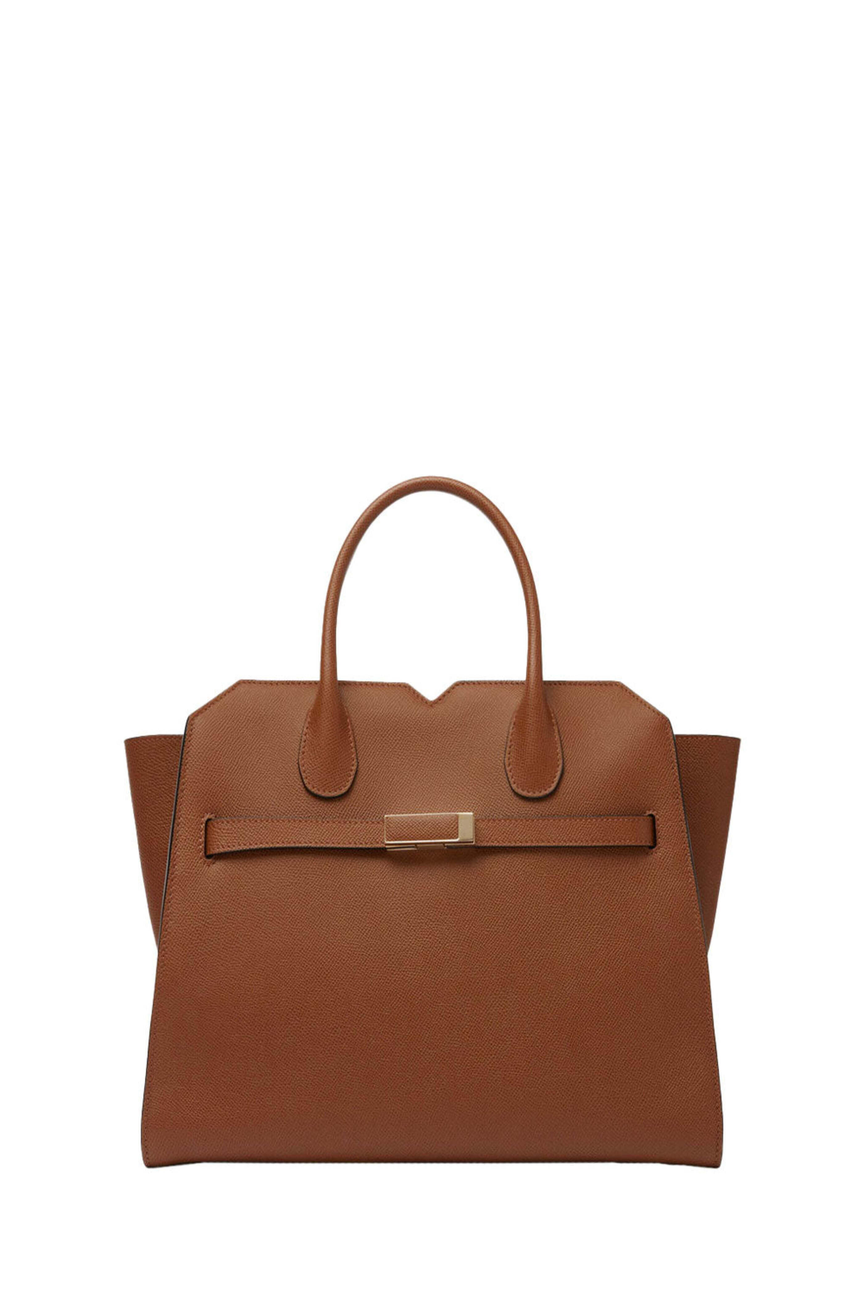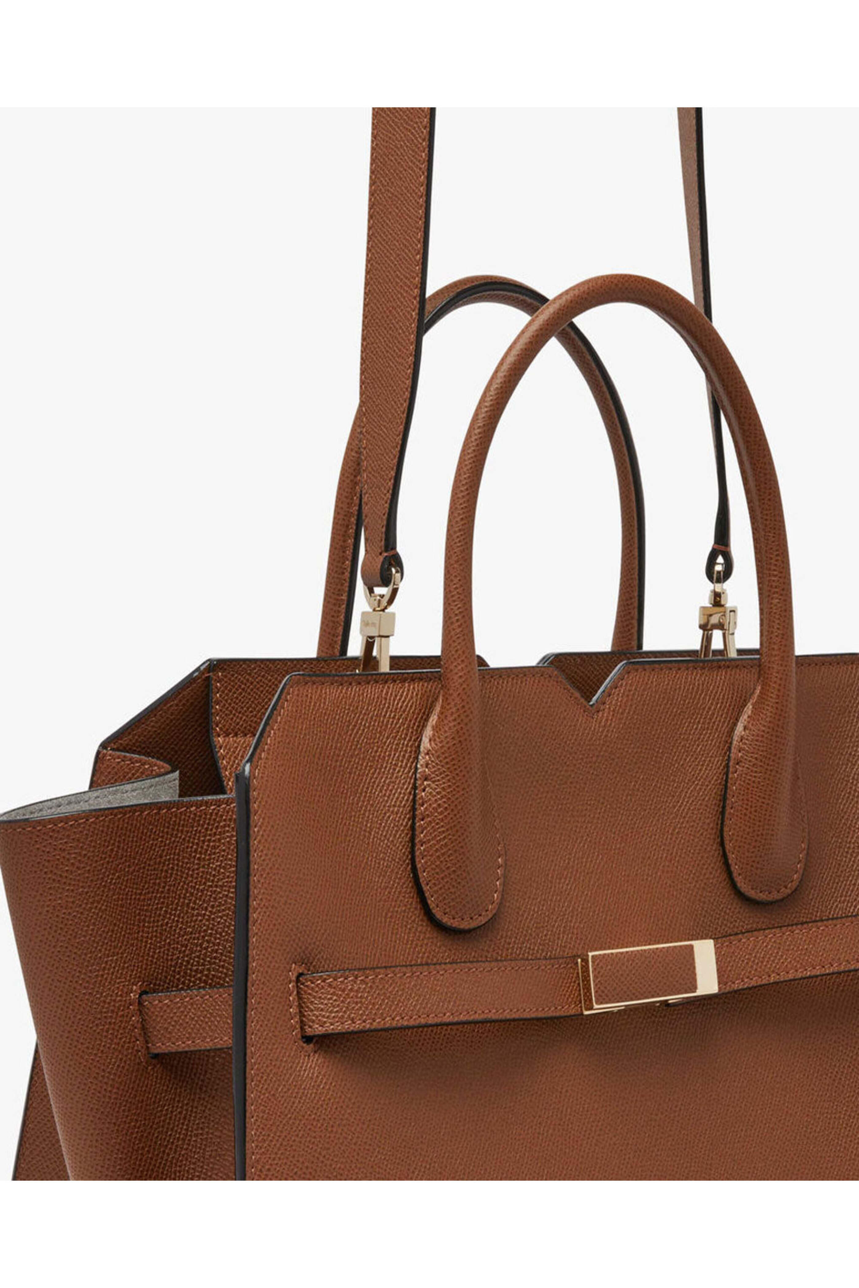 Valextra Milano Medium Bag in Chocolato. Open top with center buckler strap closure; magnetic closure. Rolled top handles. Detachable shoulder strap. Interior slip pocket. 13.2W x 10.6H x 7.1D. Made in Italy.