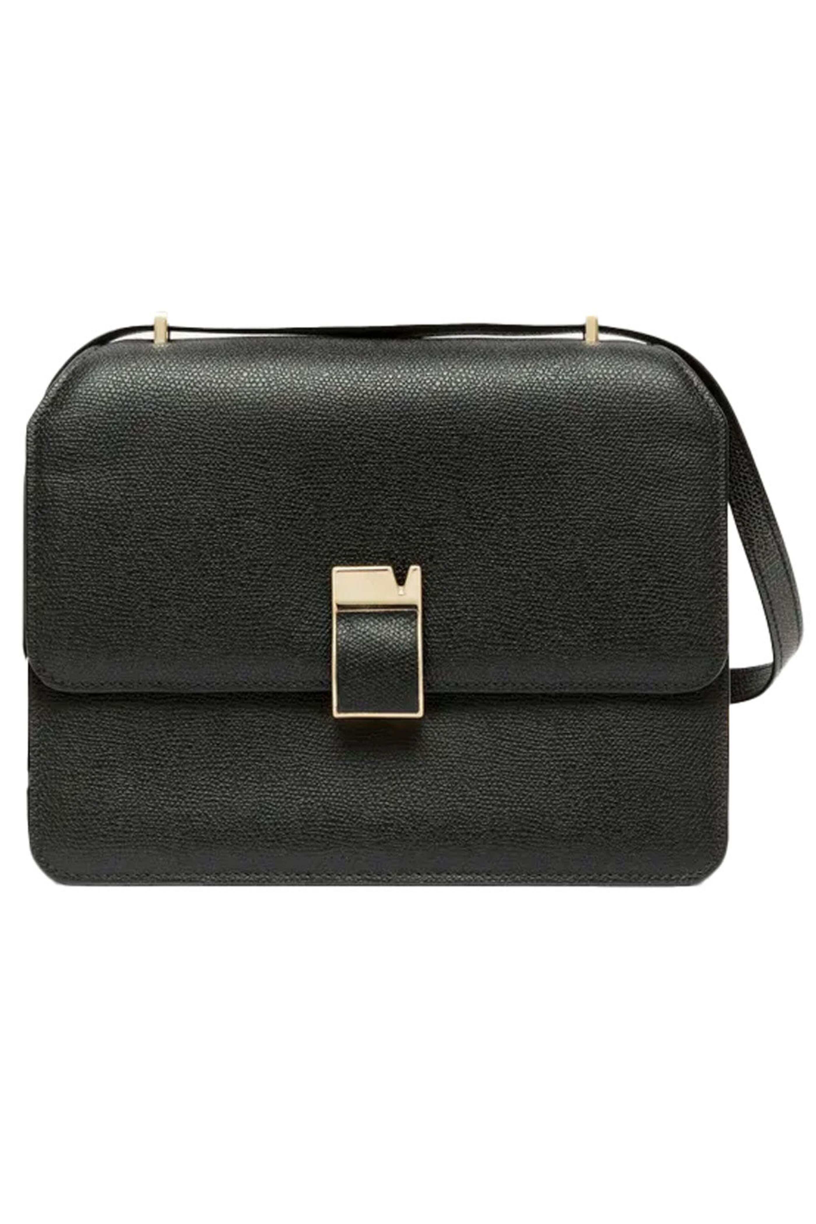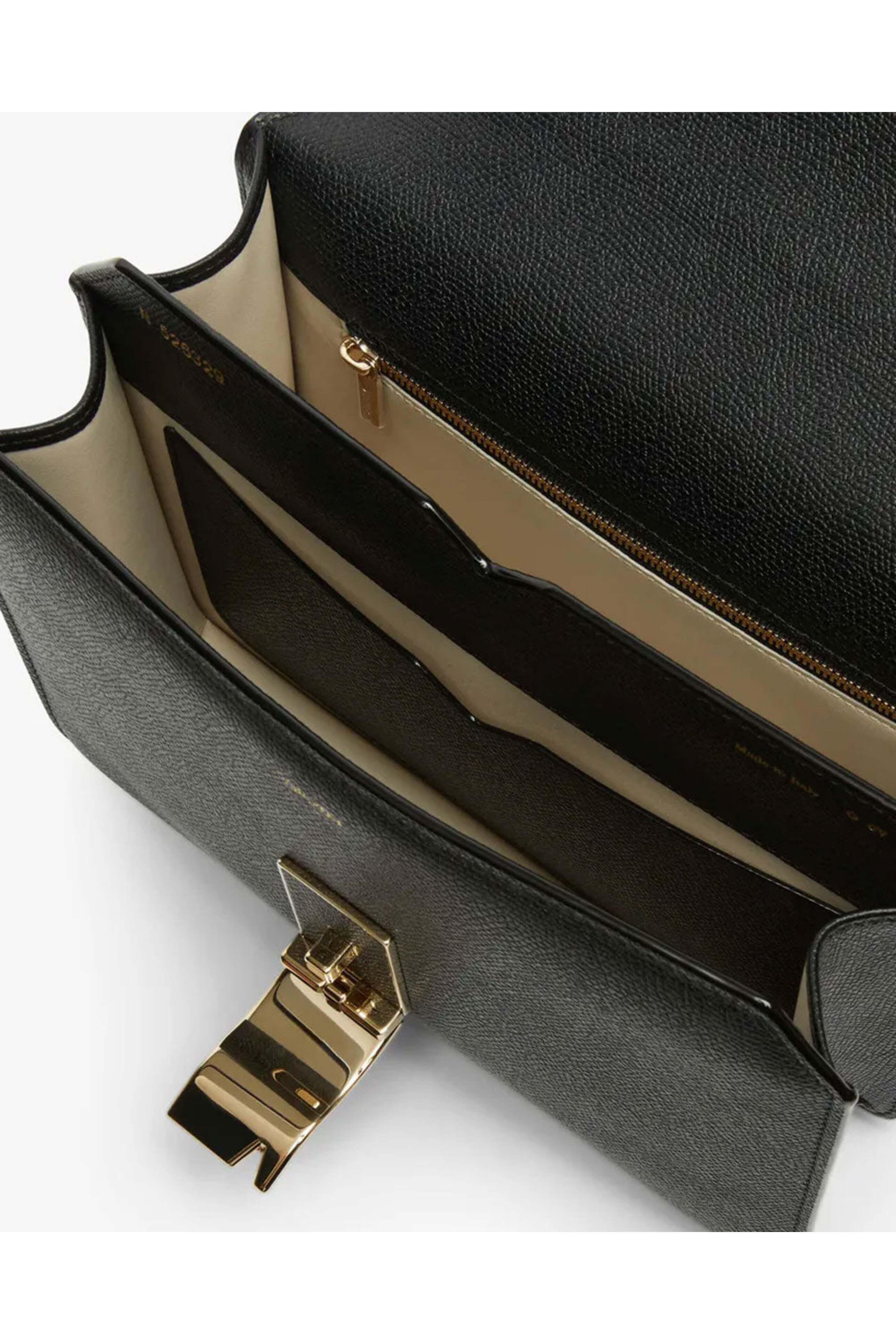 Valextra Nolo Medium Bag in Black. Flap top with twist lock closure. Adjustable shoulder strap. Two compartments. Interior zip pocket. Interior slip pocket. Exterior back pocket. Gold tone hardware. Hand painted edges. Calfskin. 9 W X 6.7 H X 3.5 D. Made in Italy.