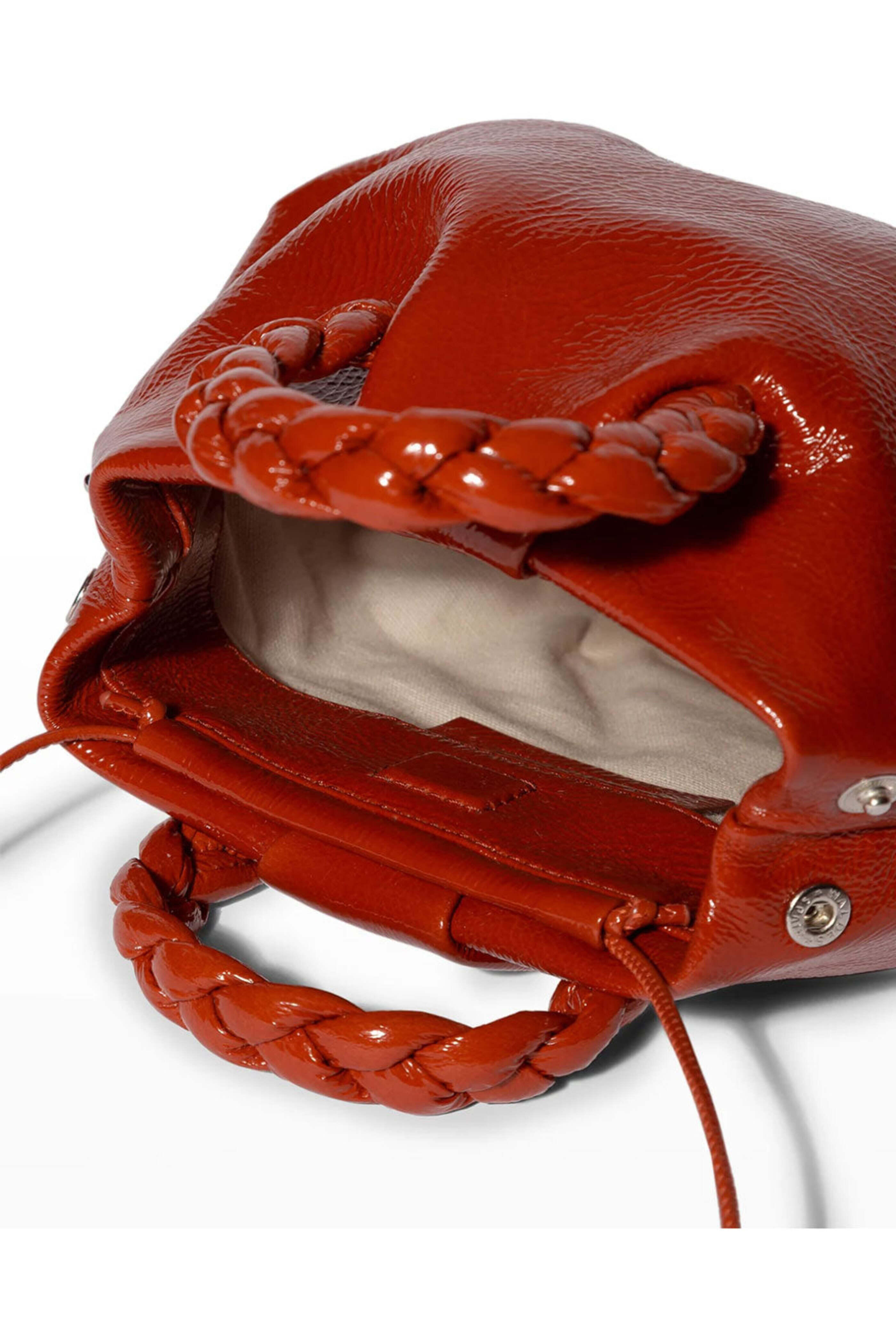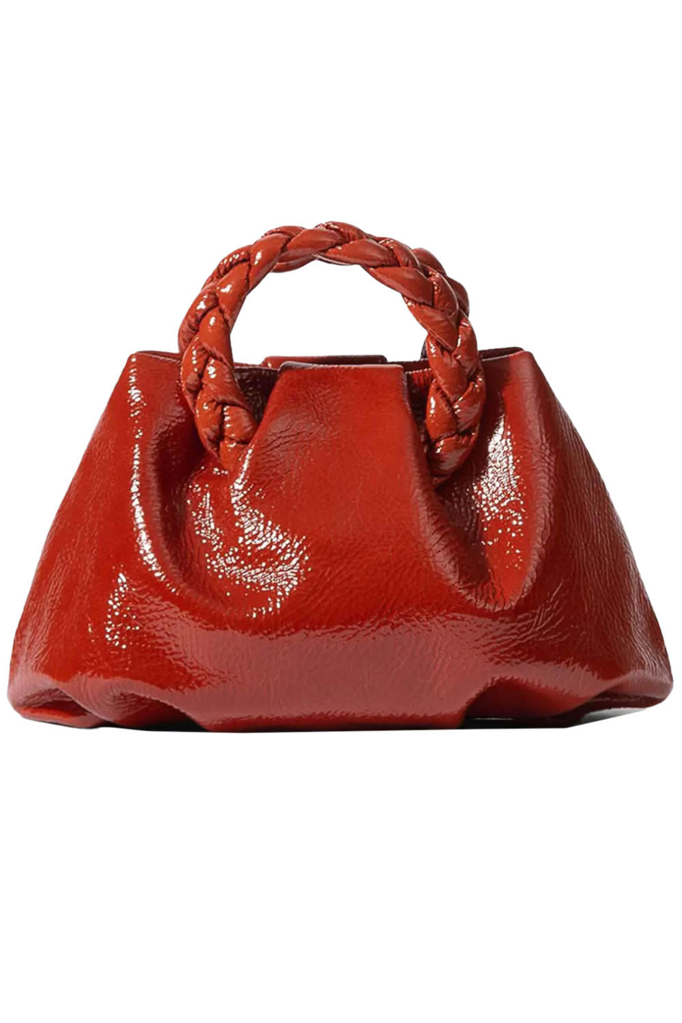 Hereu Bombon Crinkled Glossy Top Handle Bag in Red. Open top with magnetic closure. Two braided top handles. Detachable crossbody strap. One compartment. Glossy leather outer. Canvas lining. 8.3 W X 5.5 H X 3.1 D. 1.2 handle drop. 53.1 strap length. Handmade in Spain.