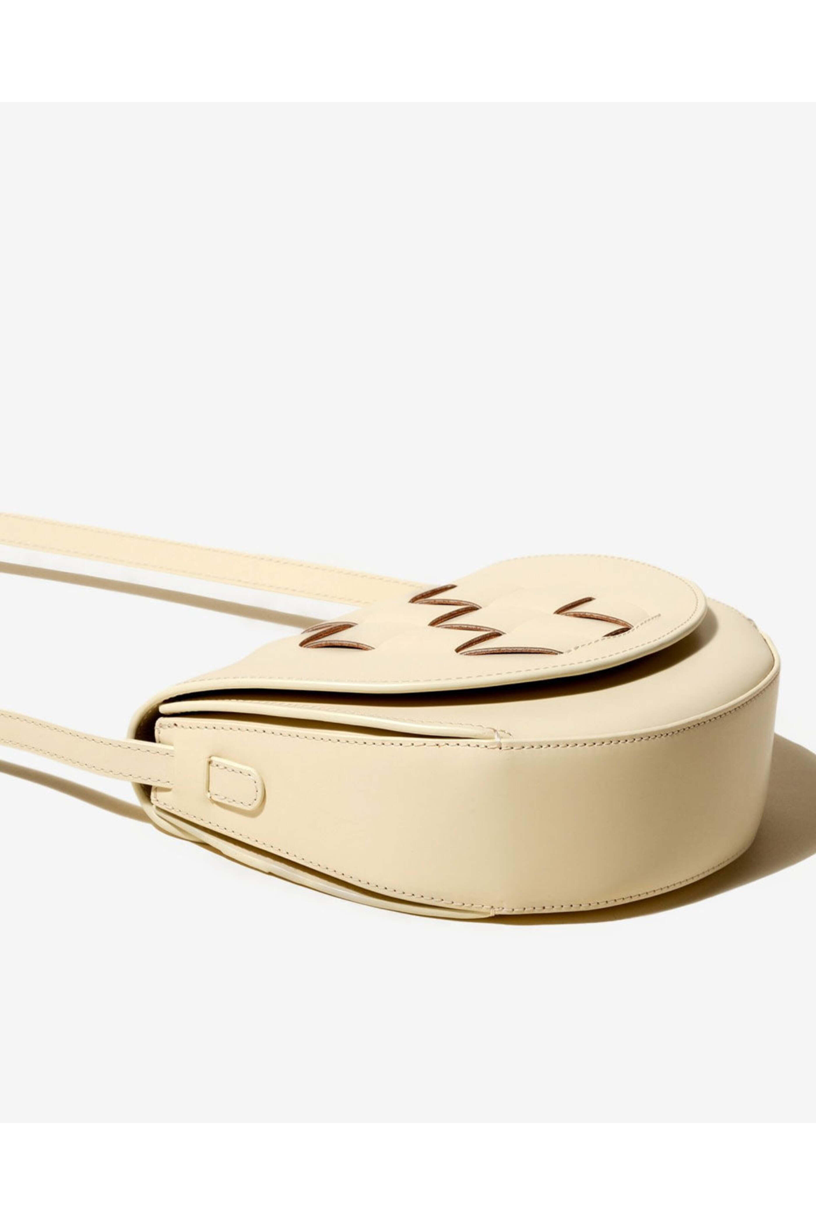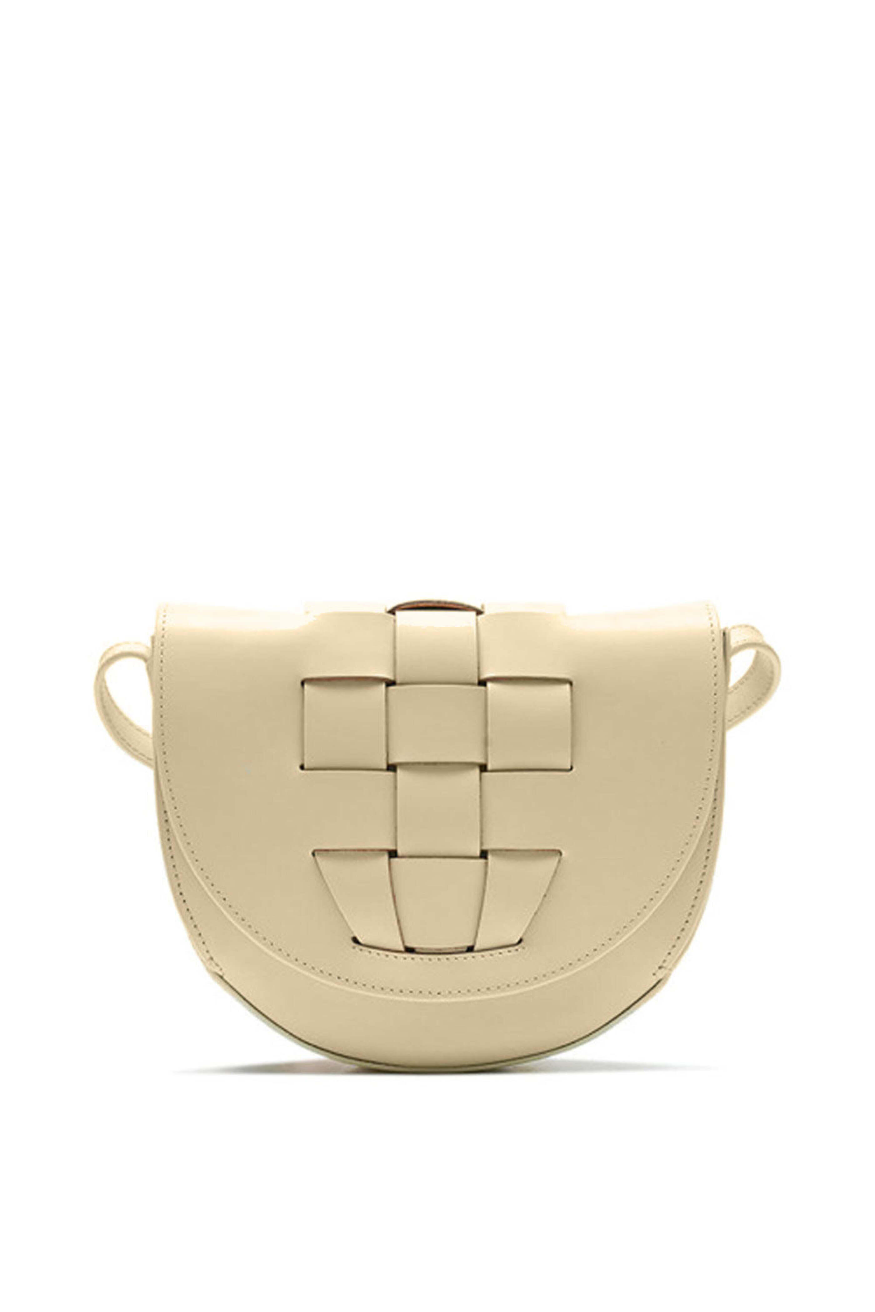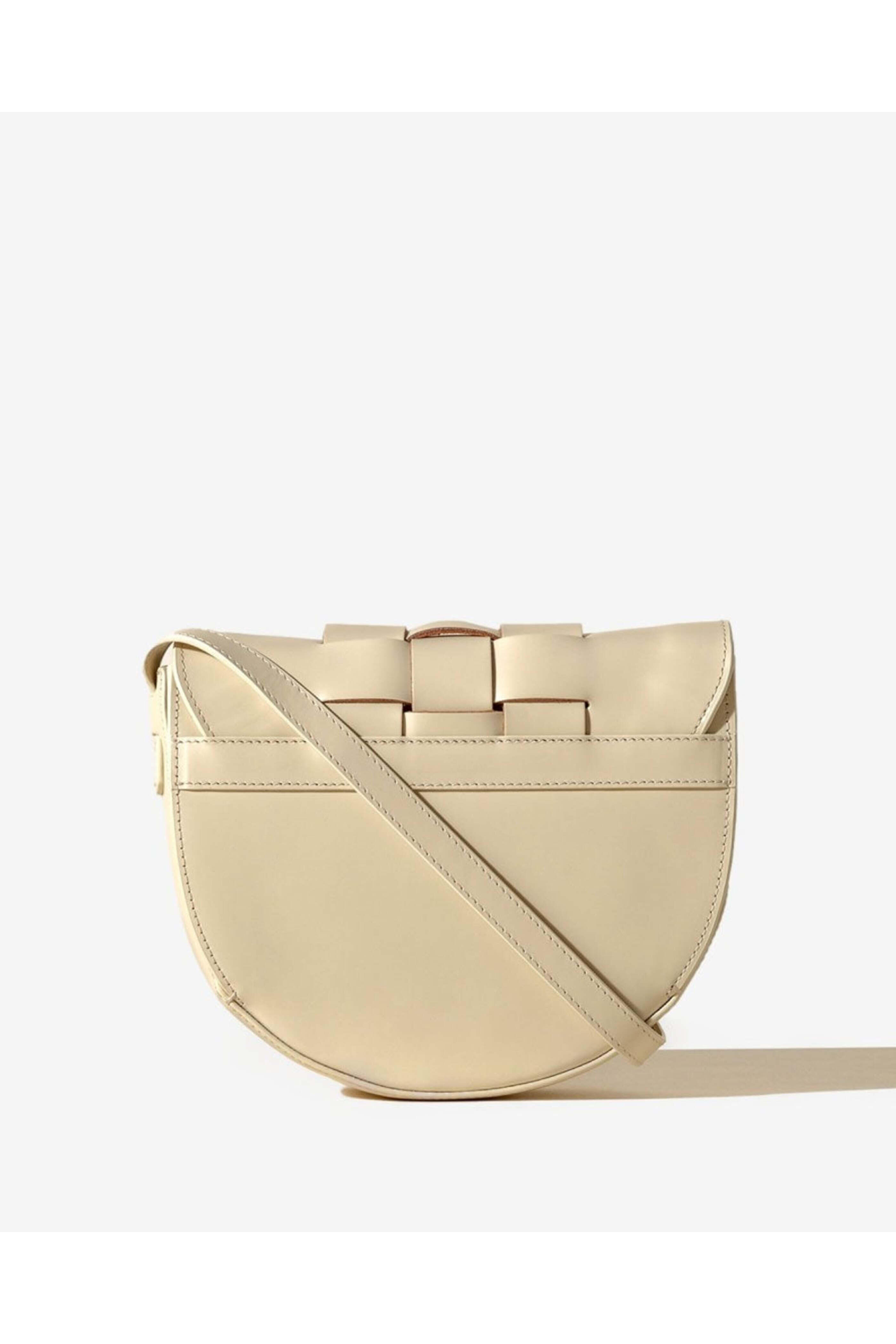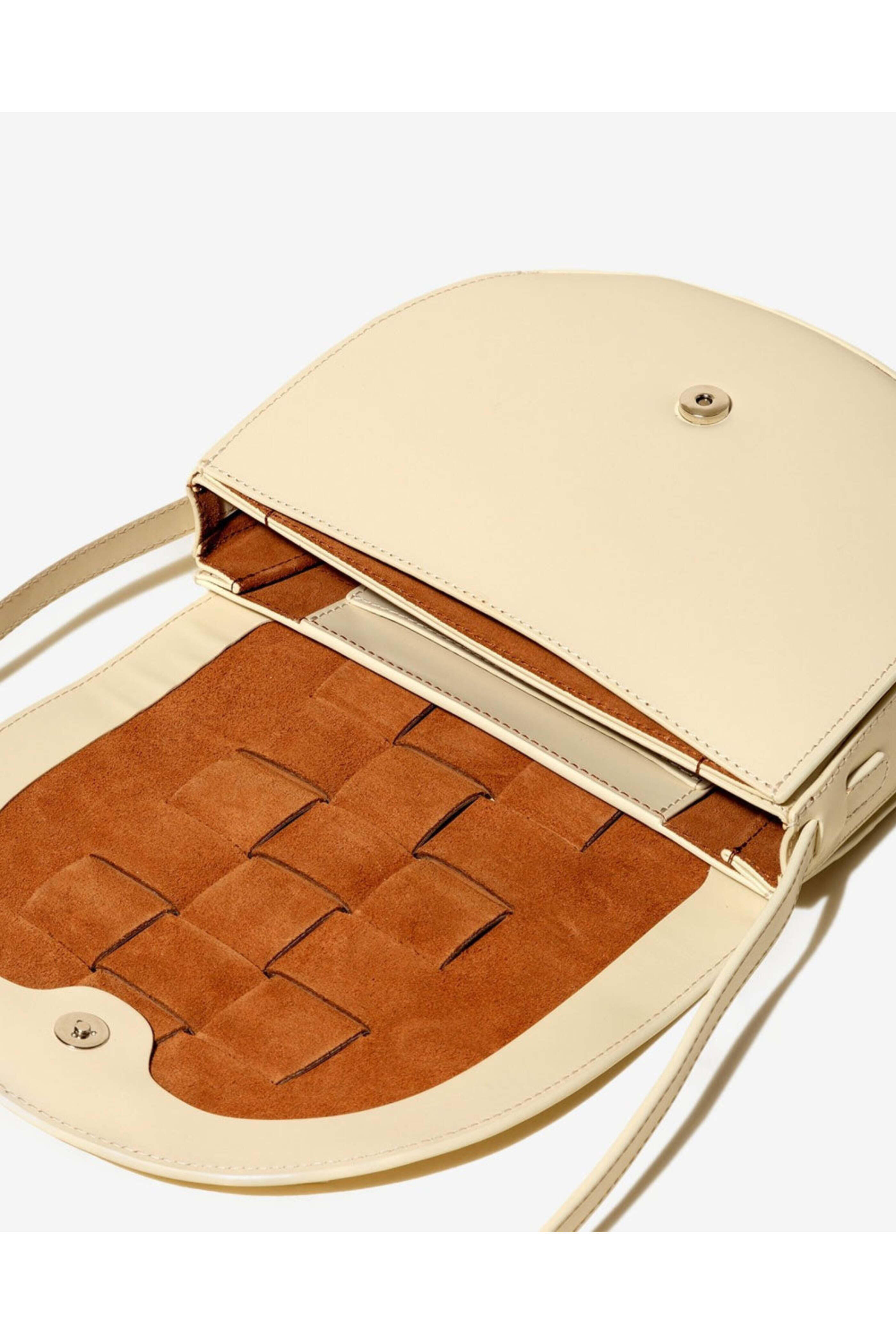 Hereu Sinia in Custard. Button flap closure. Adjustable crossbody strap. Interior flat pocket. Double compartment. Interwoven front detail. Grain leather outer. Calf suede lining. 7.5 x 8.3 x 2.4. Strap drop 47.2. Made in Spain.