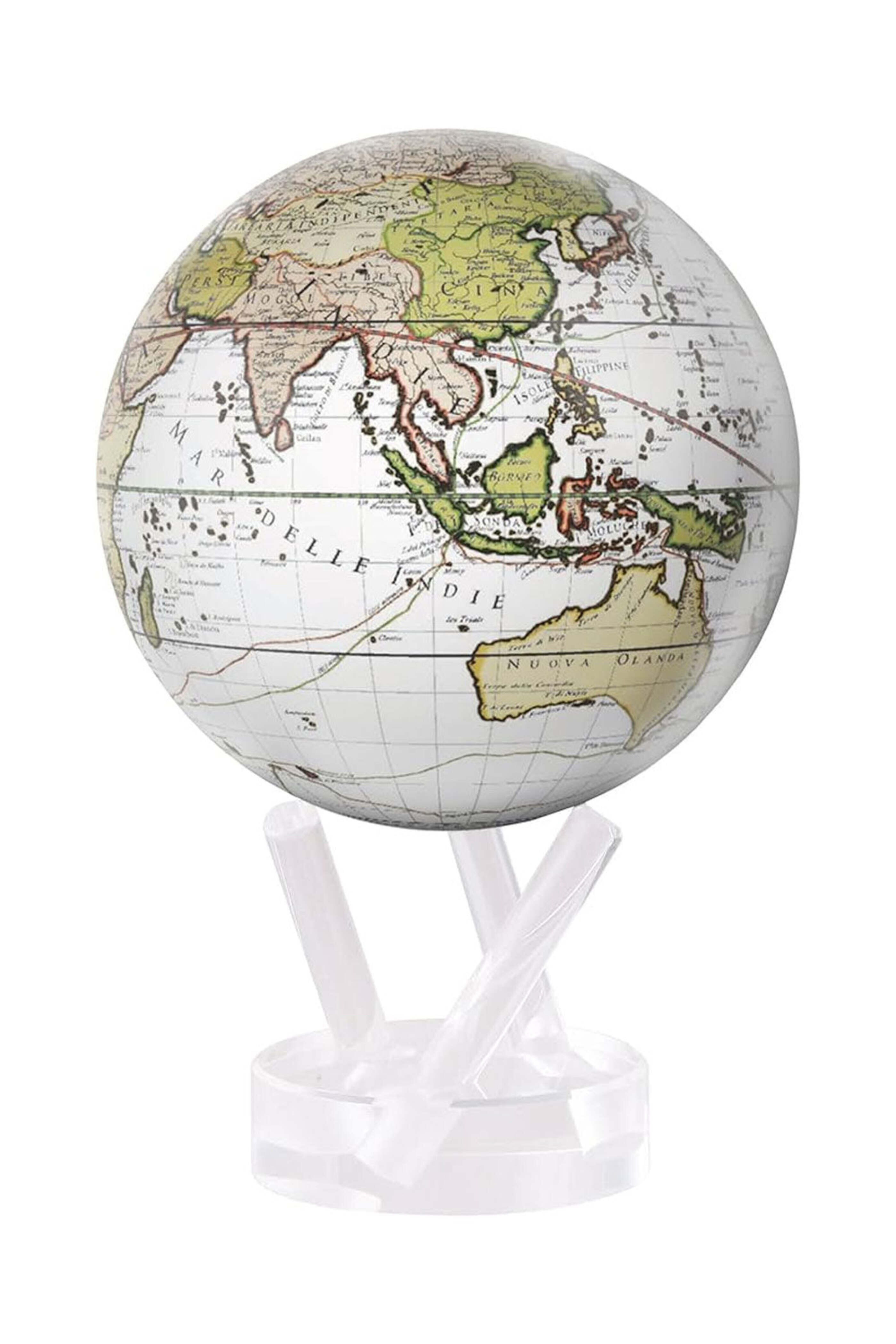 Mova Globes Antique Terrestrial White Globe. Antique map from 1790. Features latitude and longitude lines. A red ecliptic line is also present, showing the sun's position each day of the year.. Note there is no Antarctica because James Cook didn't believe it existed.. Turns using ambient light. Hidden magnets provide movement. No cords or batteries. Base included. 6.