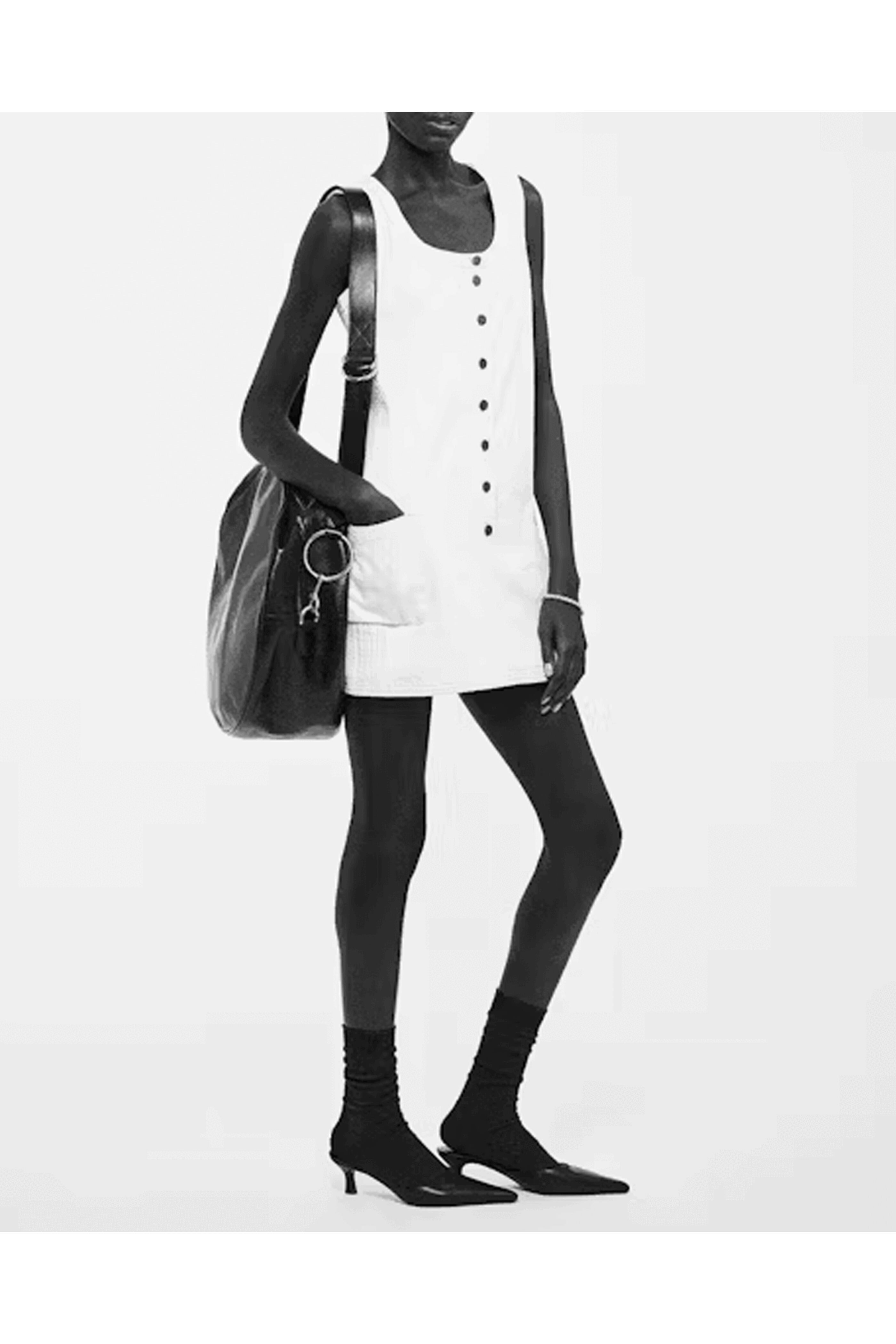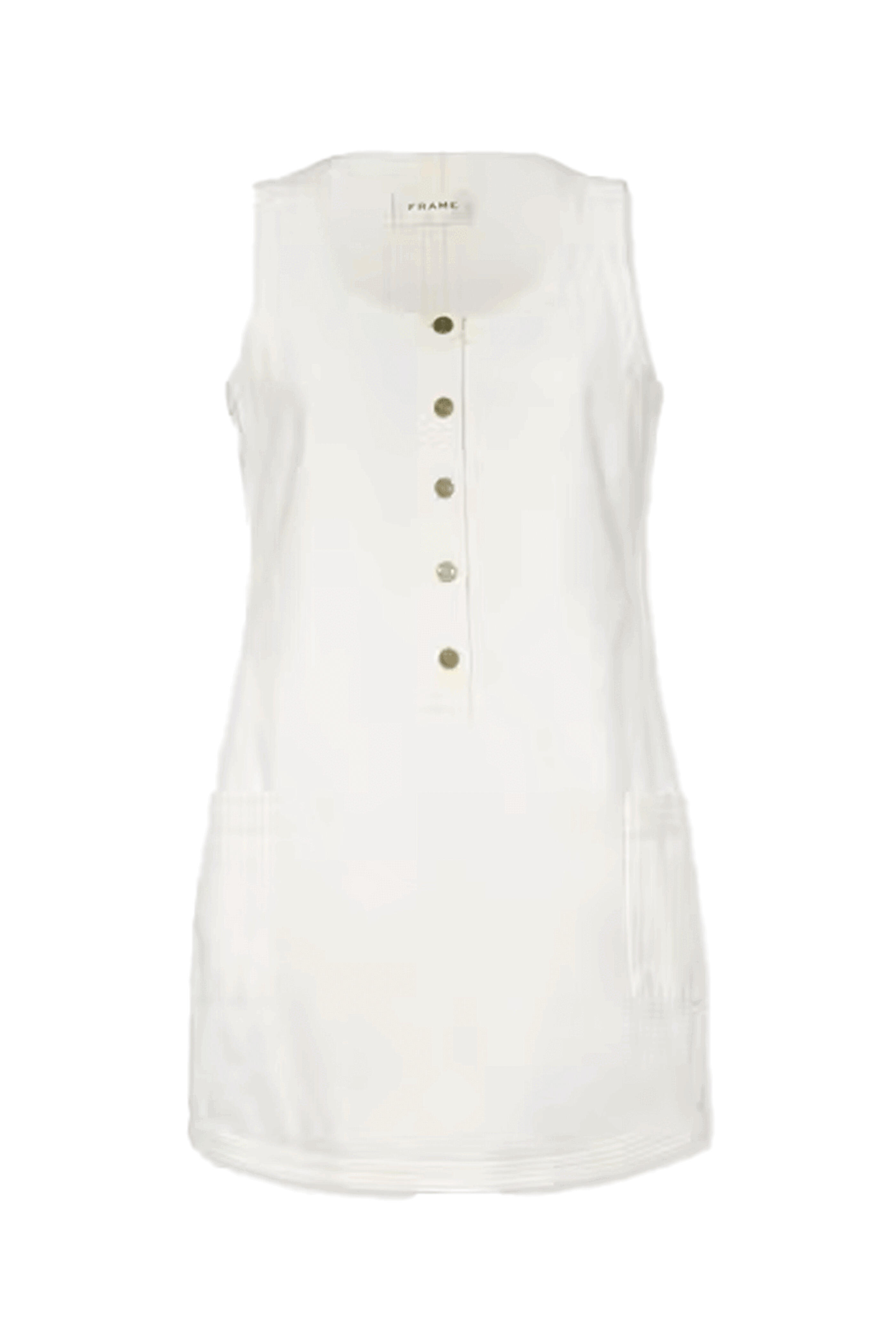 Frame Denim Trapunto Side Pocket Dress in Natural Clean. Scoop neck. Sleeveless. Brass button placket. A line silhouette. Rigid denim fabrication. Mini length.