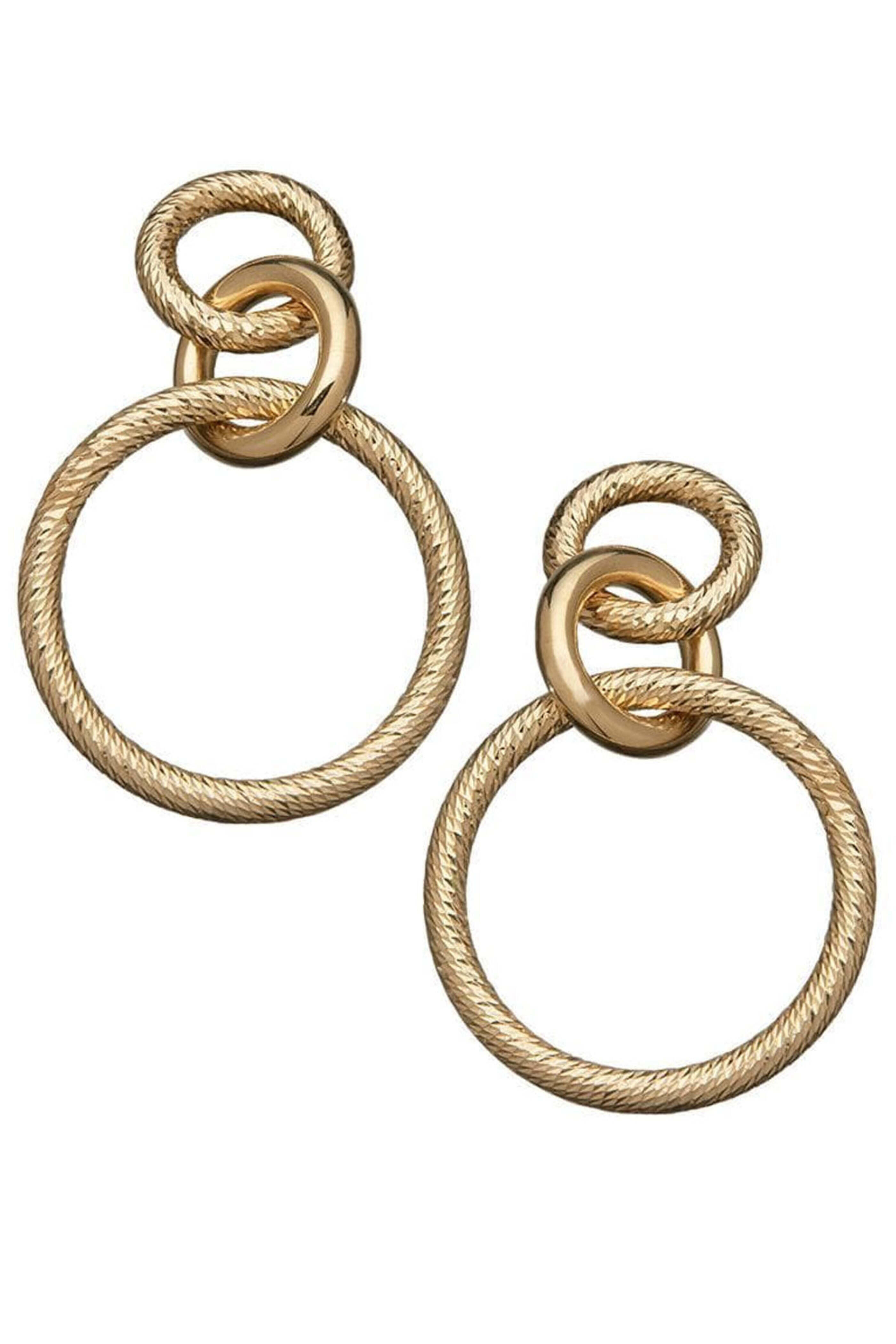 Jennifer Zeuner Jewelry Wes Earrings. 14k yellow gold plated silver. Sterling silver. Three smooth and textured interlocking circles. Glam vintage look. 3 L. Post back.
