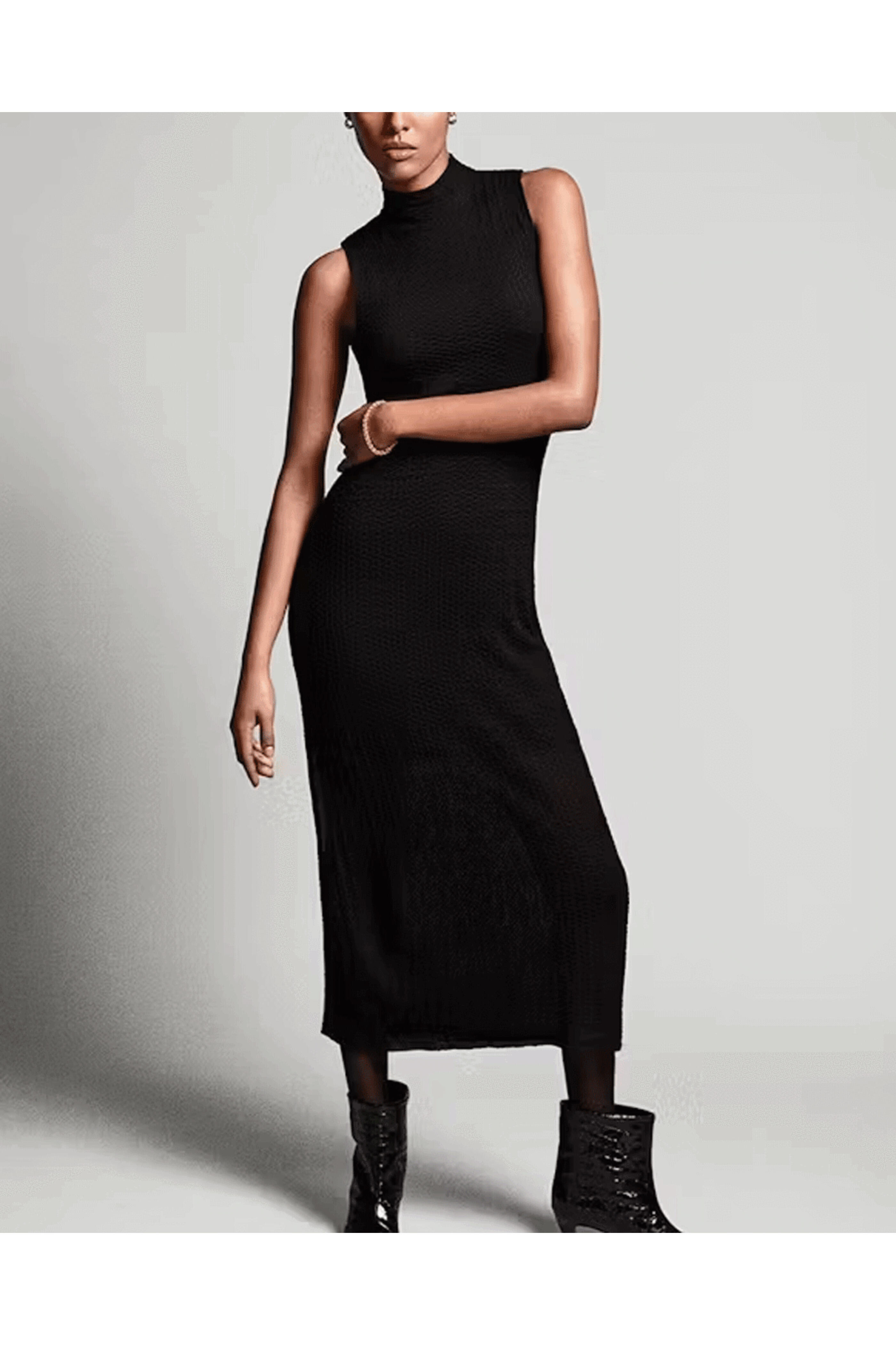Frame Black Sleeveless Mesh Dress. Mock neck. Sleeveless. Ankle length. Fitted silhouette. Knee length slip. Mesh lace detailing. 11% Elastane, 89% Nylon.