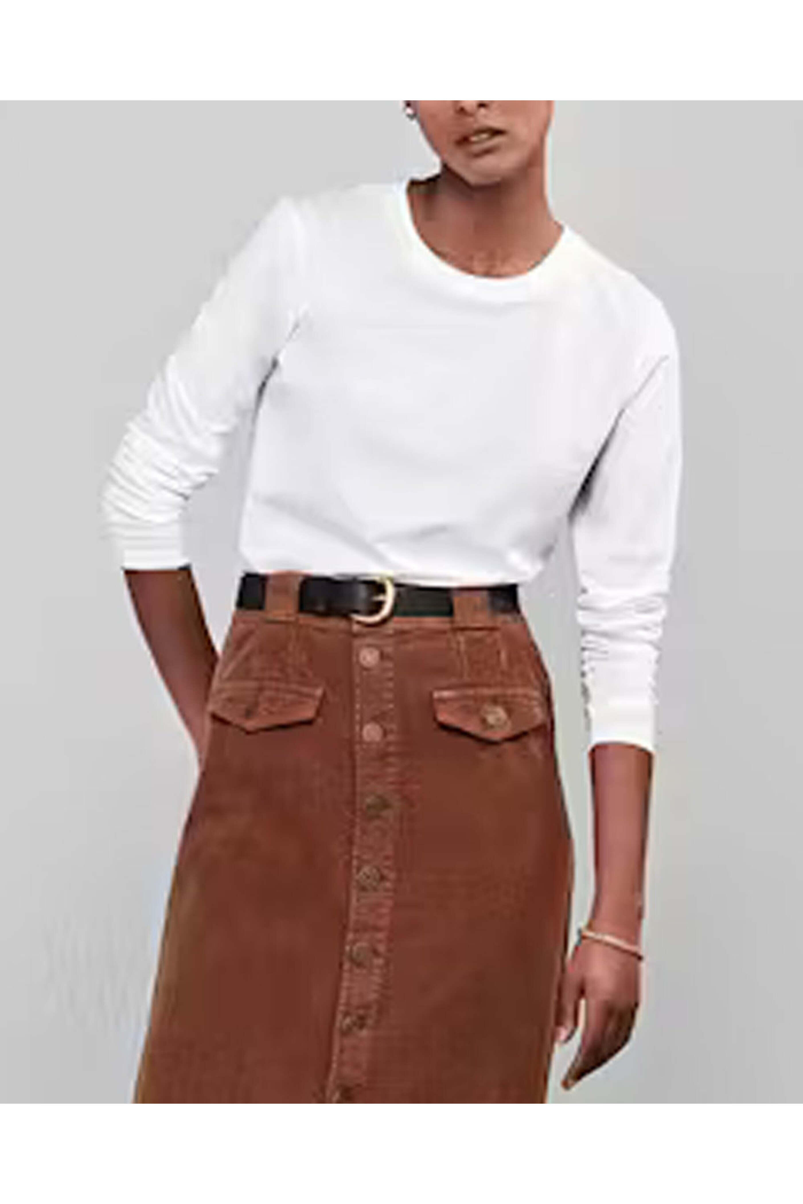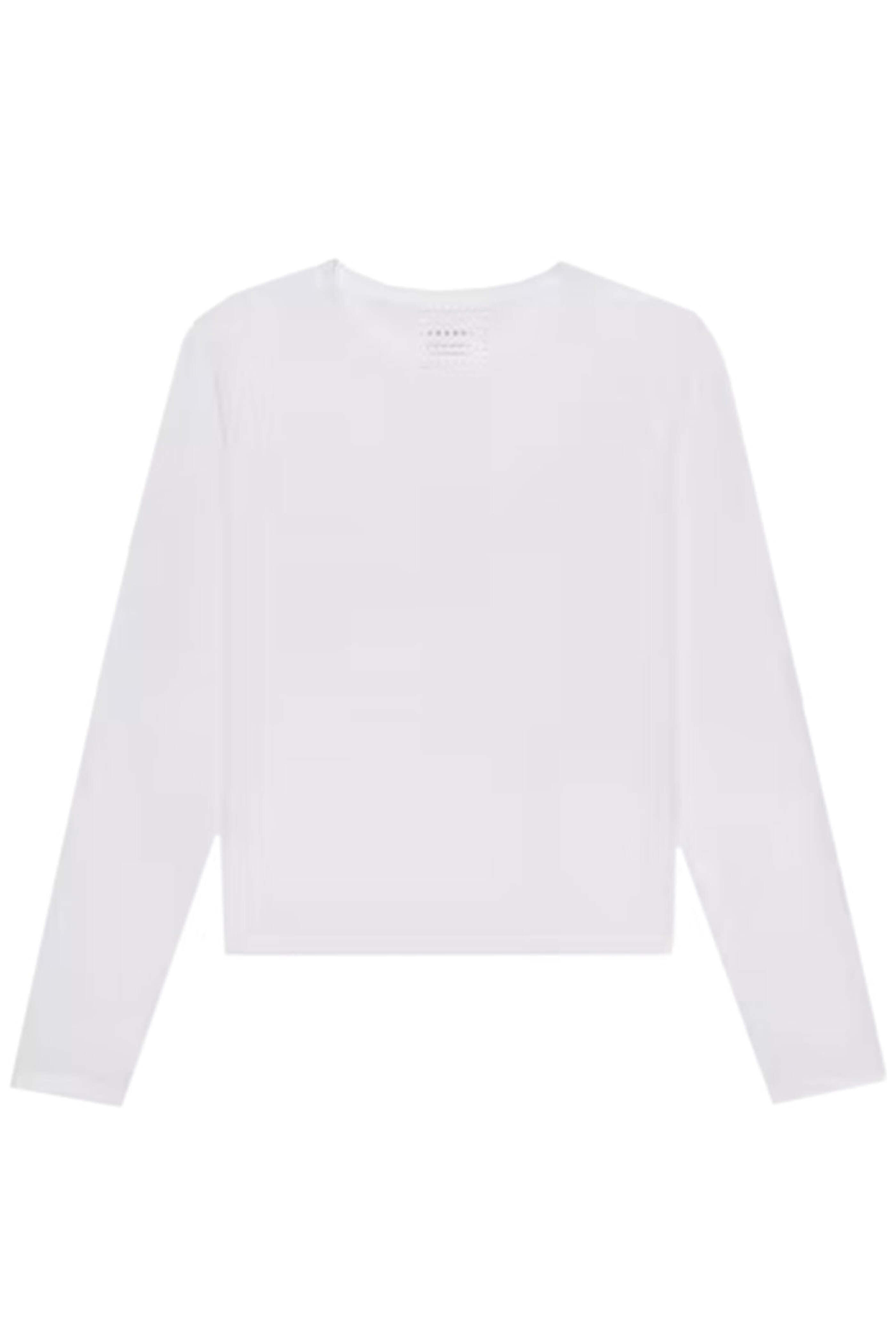Frame White Long Sleeve Baby Tee. Crewneck. Long sleeves. Shrunken fit. Straight hem. 100% supima cotton.