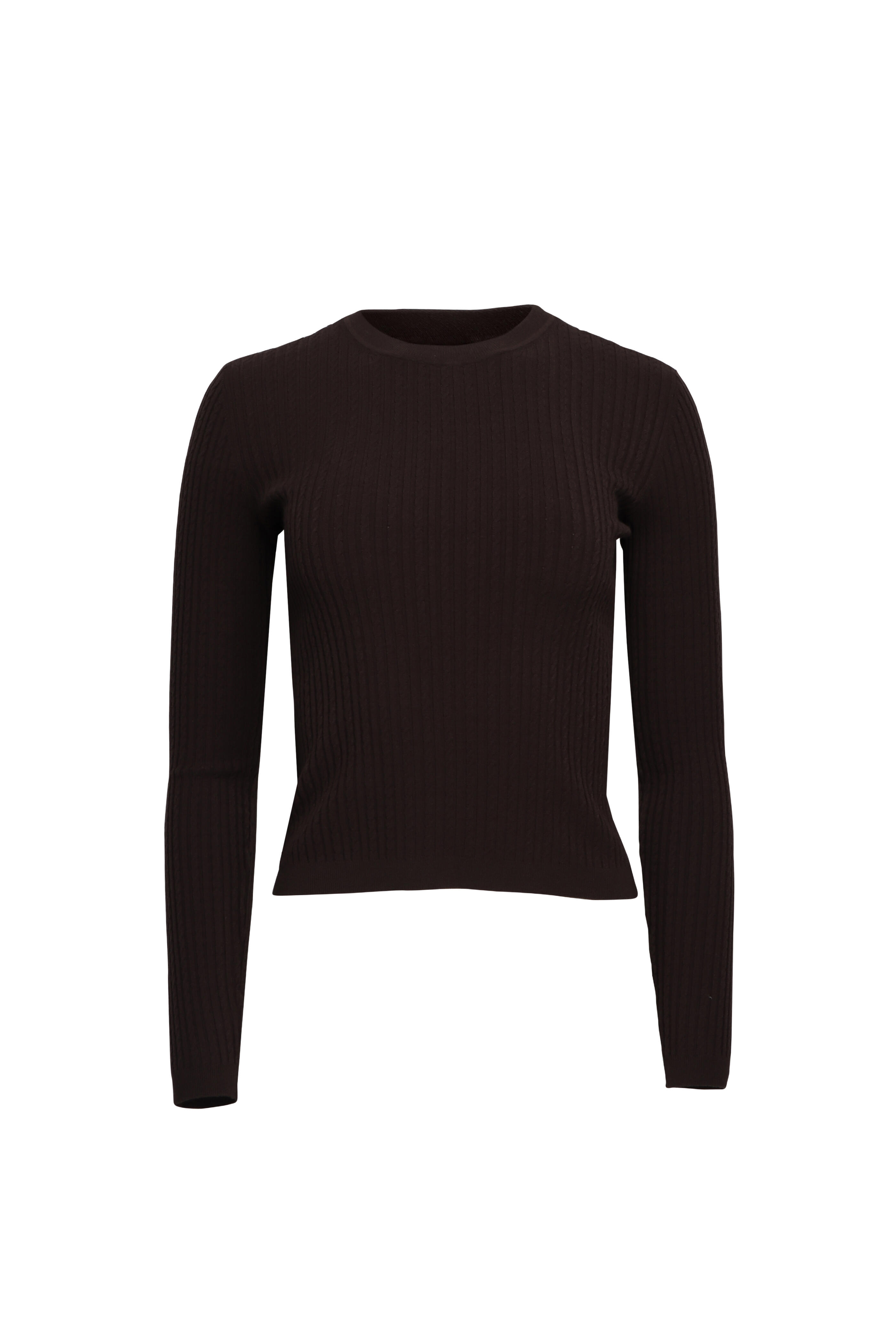 Crewneck. Long sleeves. Slim silhouette. Ribbed throughout. Straight hem. Imported. Length 20.5” (Size S). 77% viscose, 23% polyester. Dry clean.