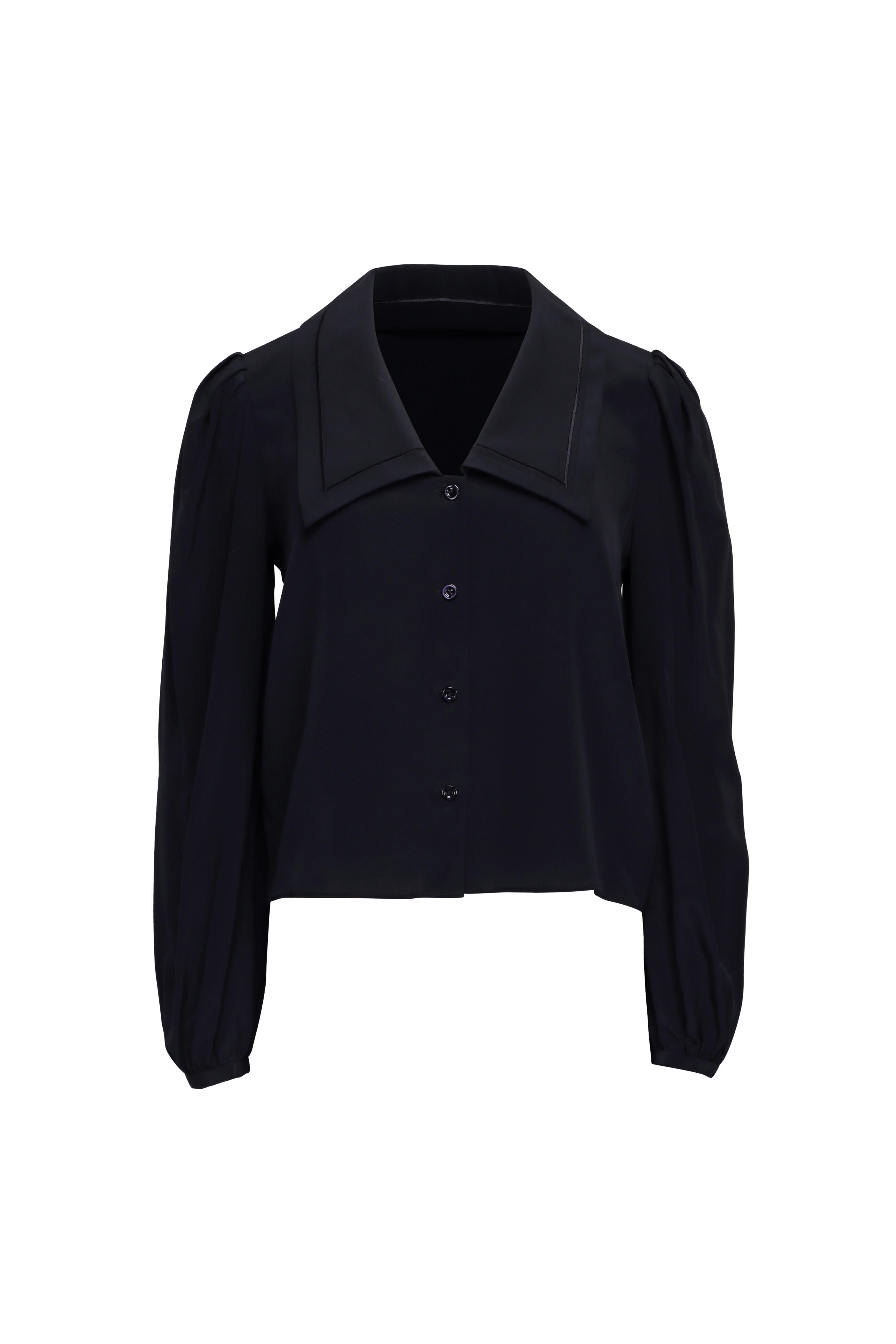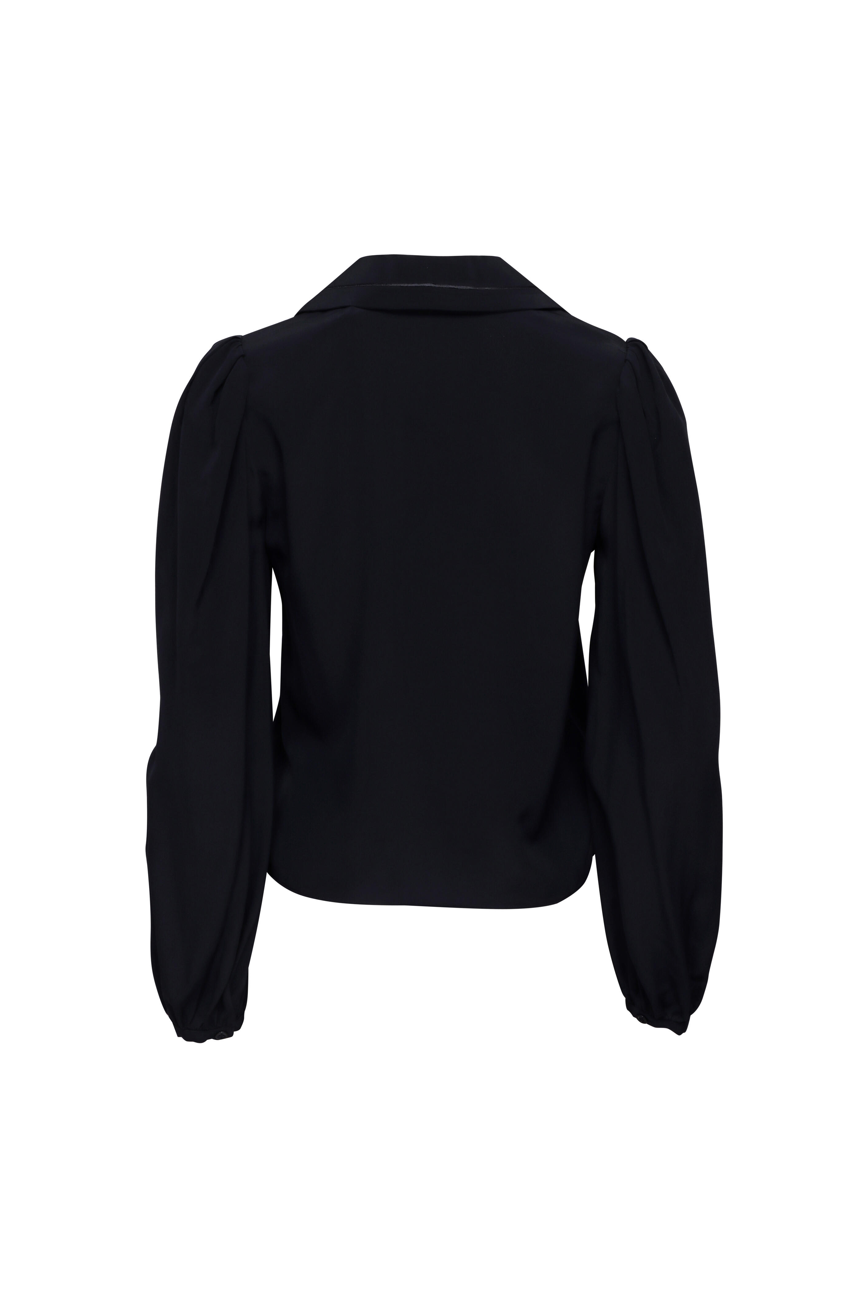 V neck. Collar. Puff shoulders. Long sleeves; banded cuffs. Button up front closure. Straight hem. Imported. Length 22.375” (Size S). 100% silk. Dry clean.