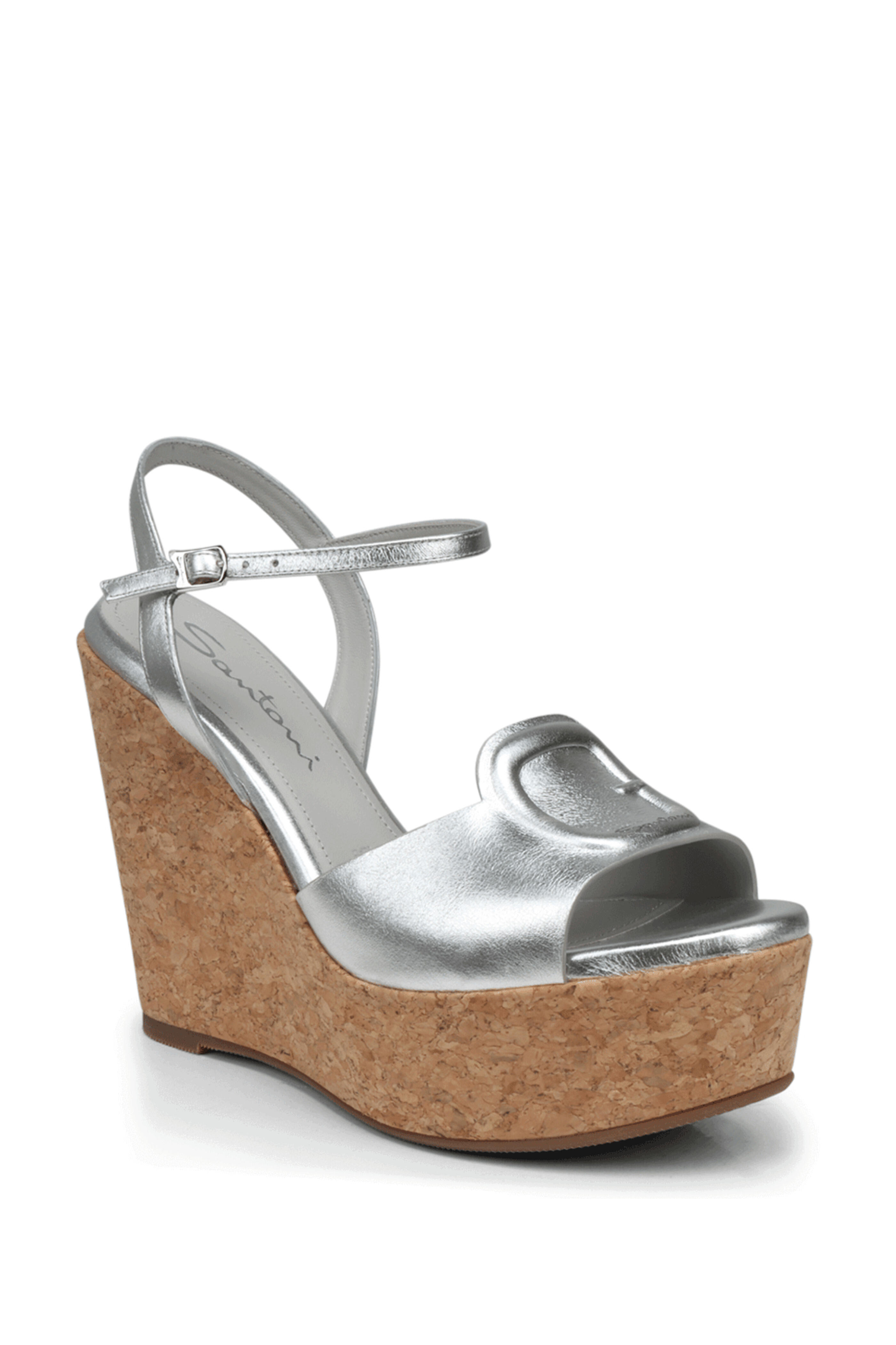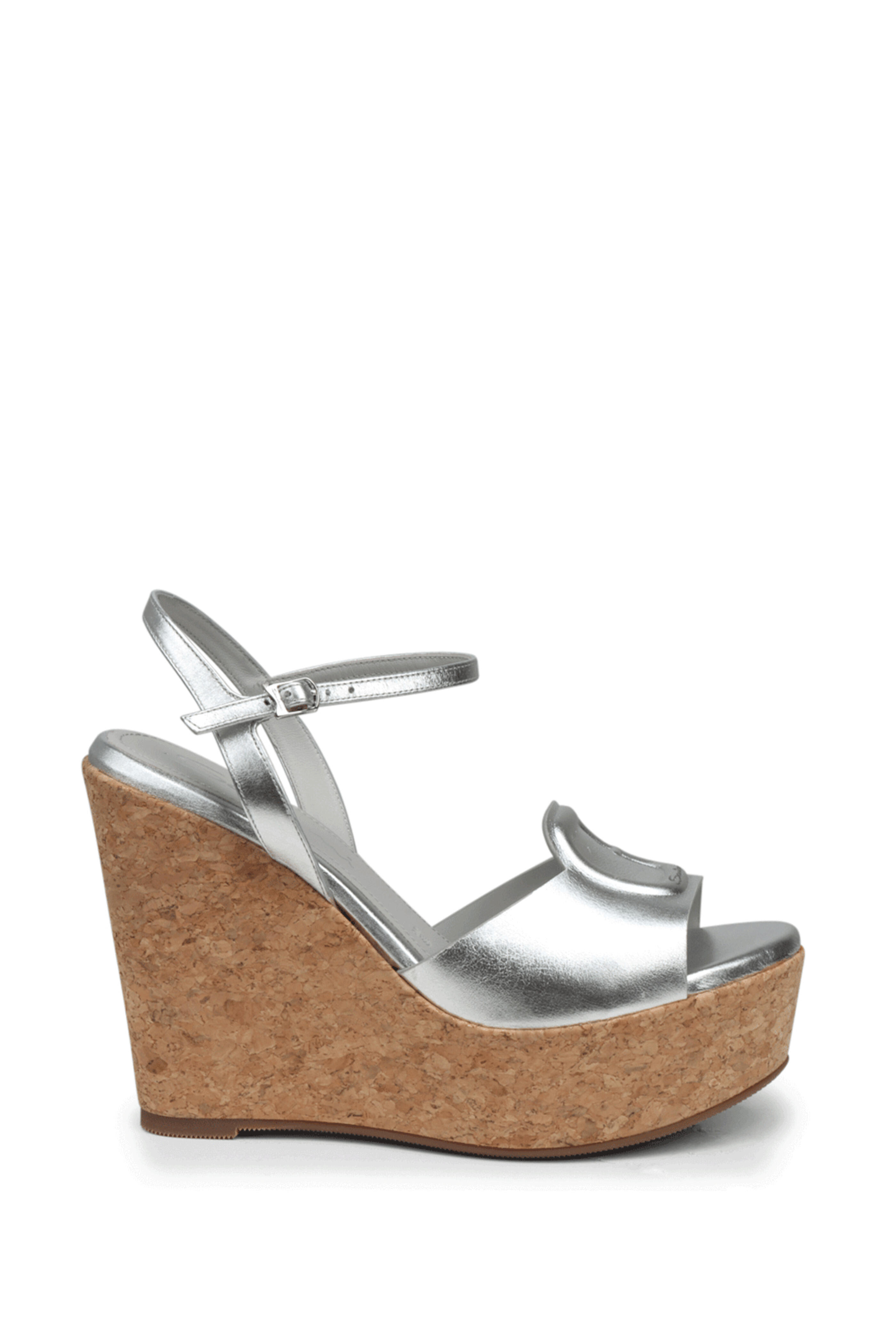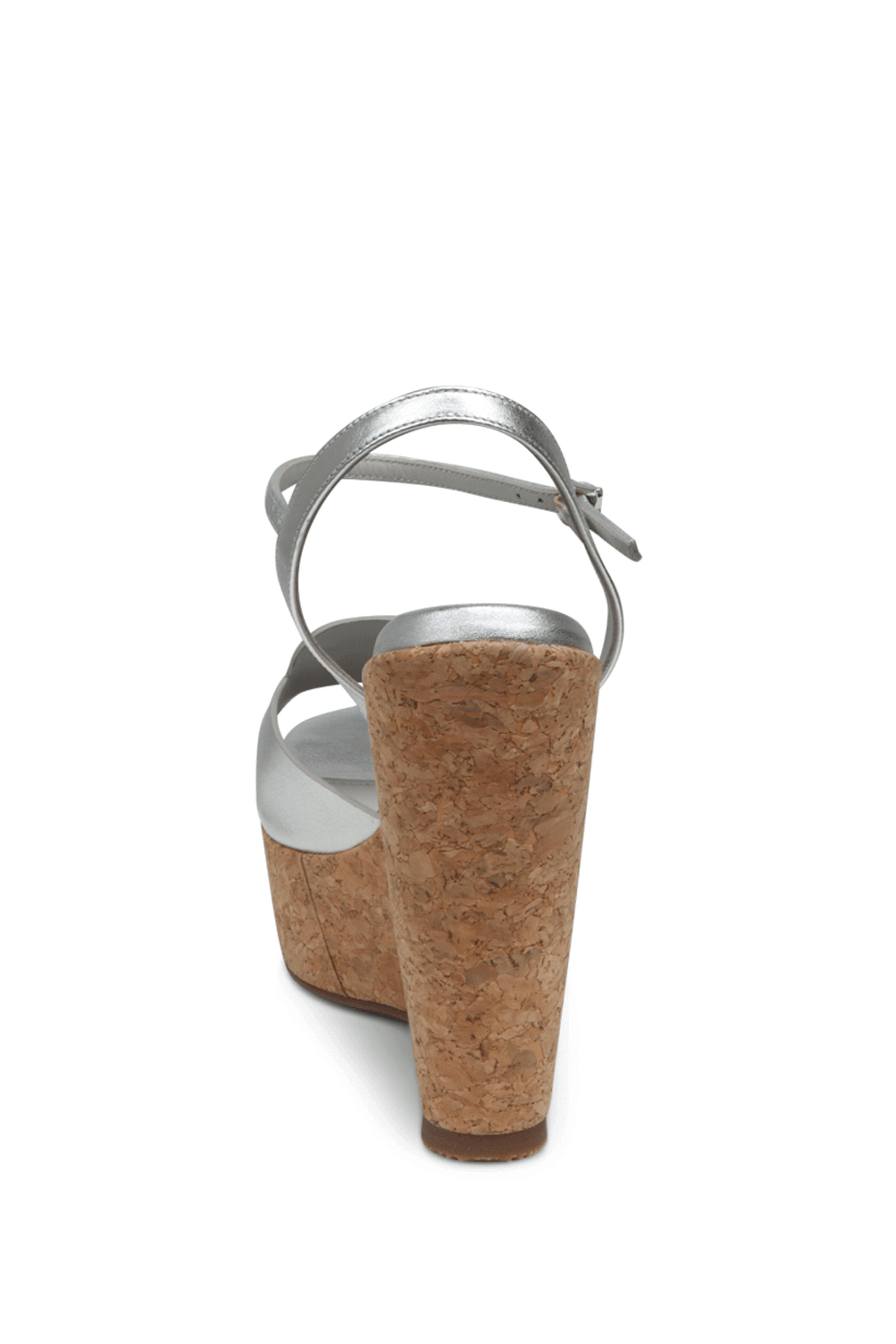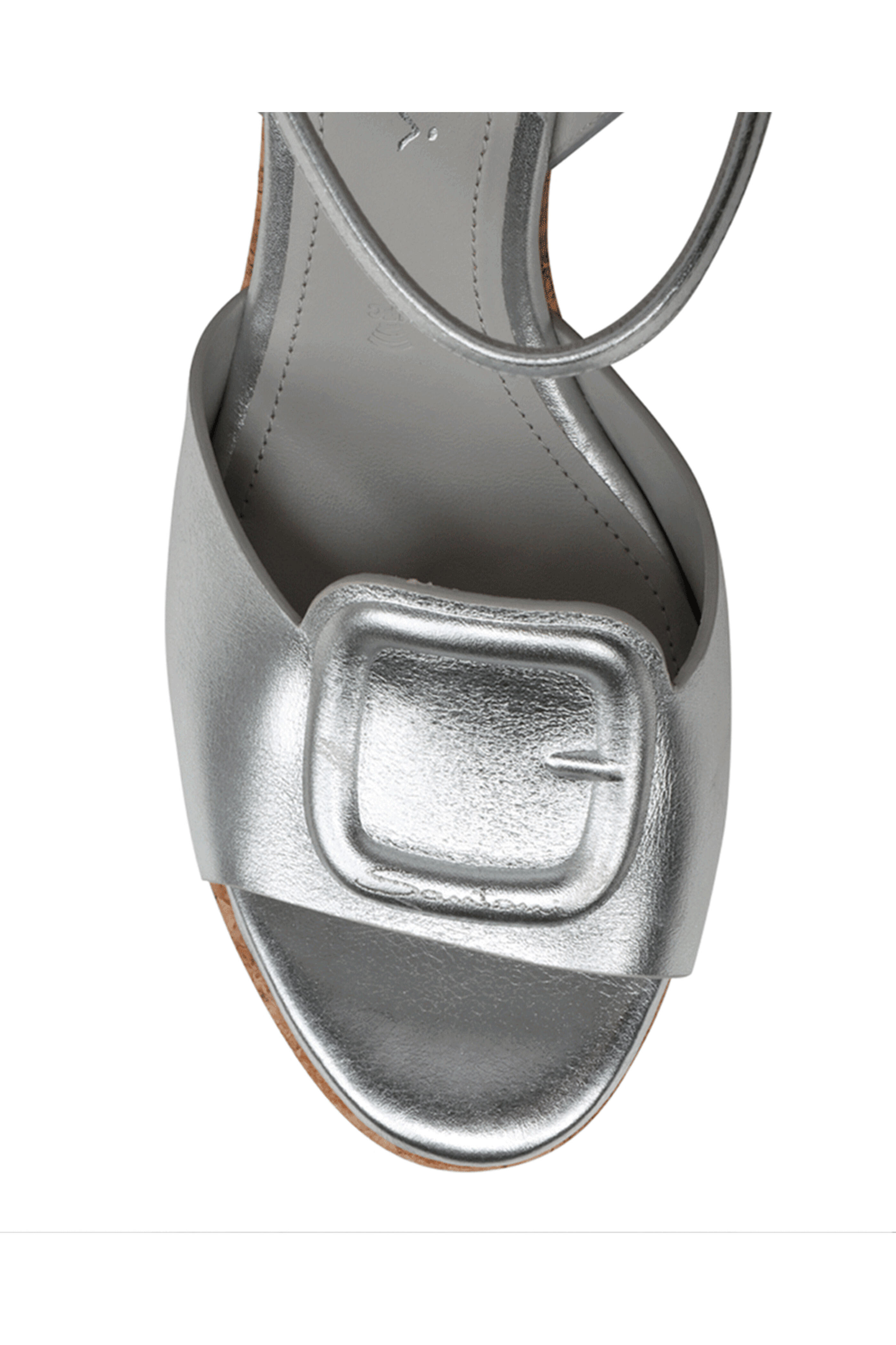 Metallic leather upper and lining. Open round toe. Adjustable ankle strap. Leather buckle detail. Cork wedge. Rubber sole. 5 wedge heel. Made in Italy.