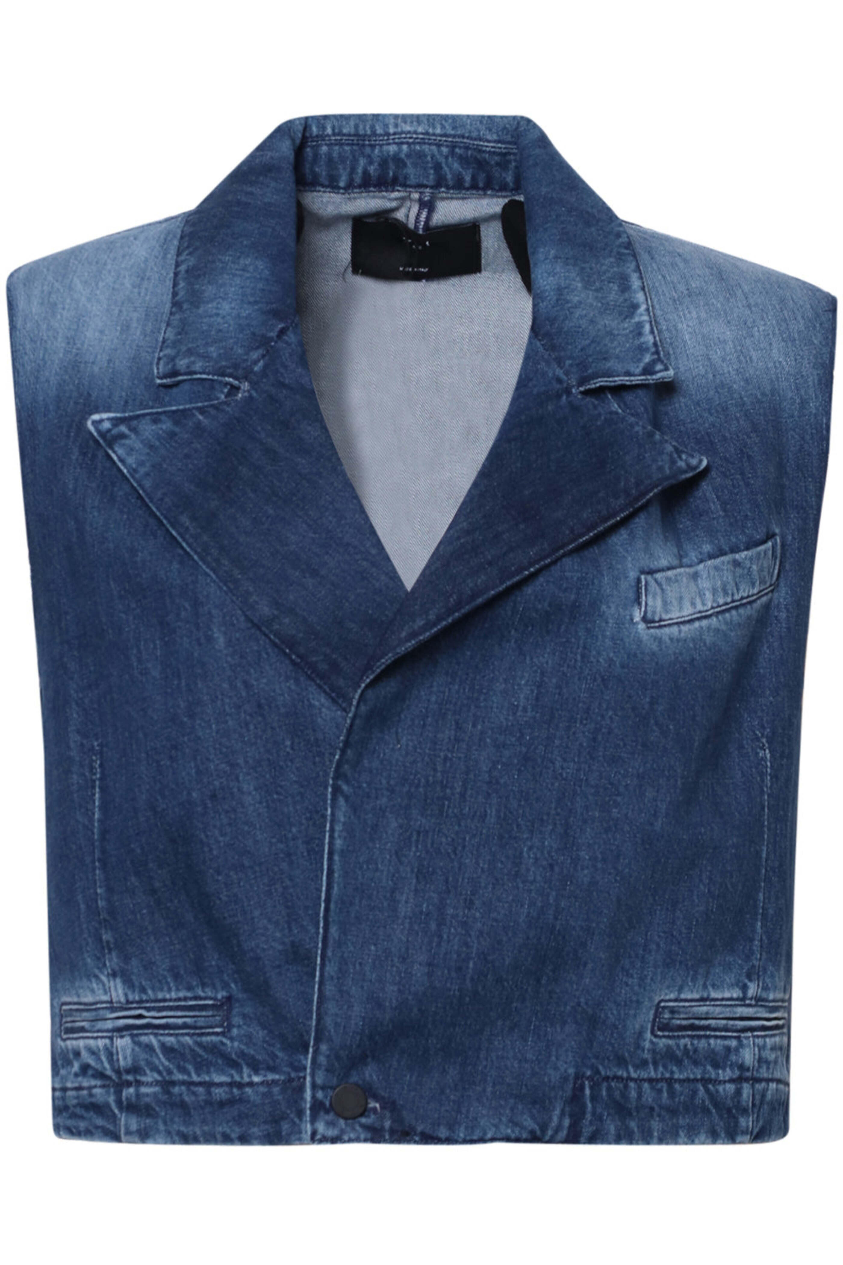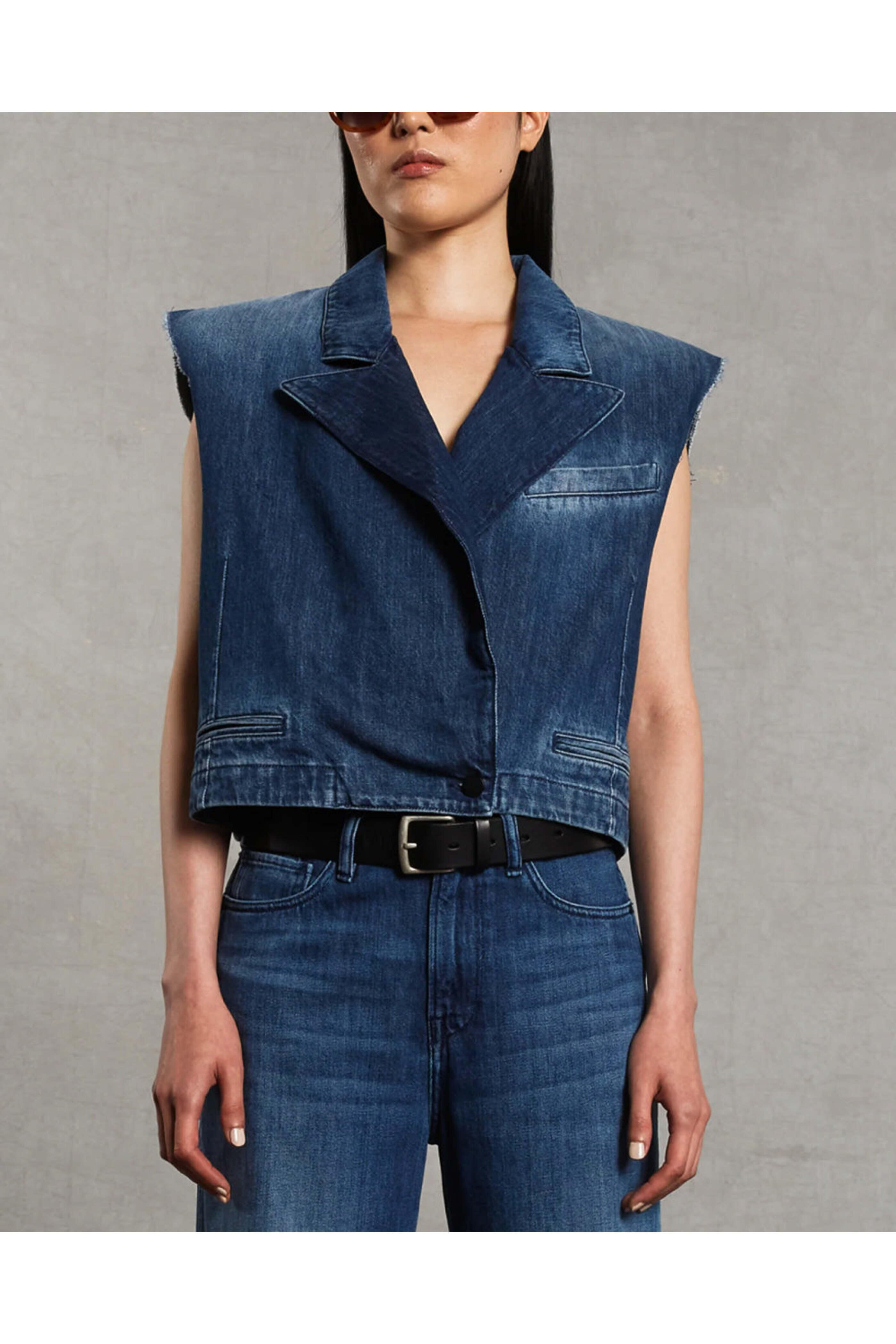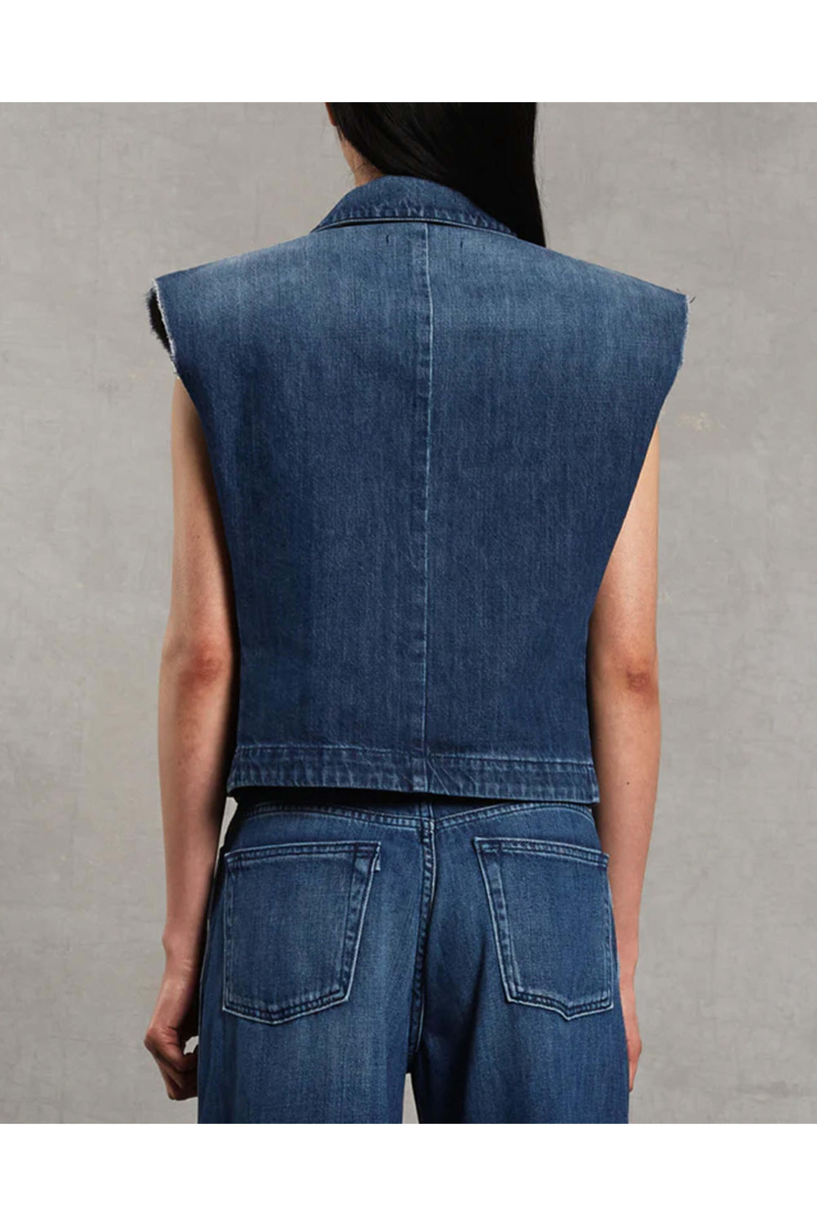 3x1 Mary Denim Vest in Bright Night. Peak lapel. V neck. Padded shoulders. Sleeveless. Single chest welt pocket. Hip welt pockets. Button closure at hem. Boxy fit. Denim fabrication. 100% cotton.