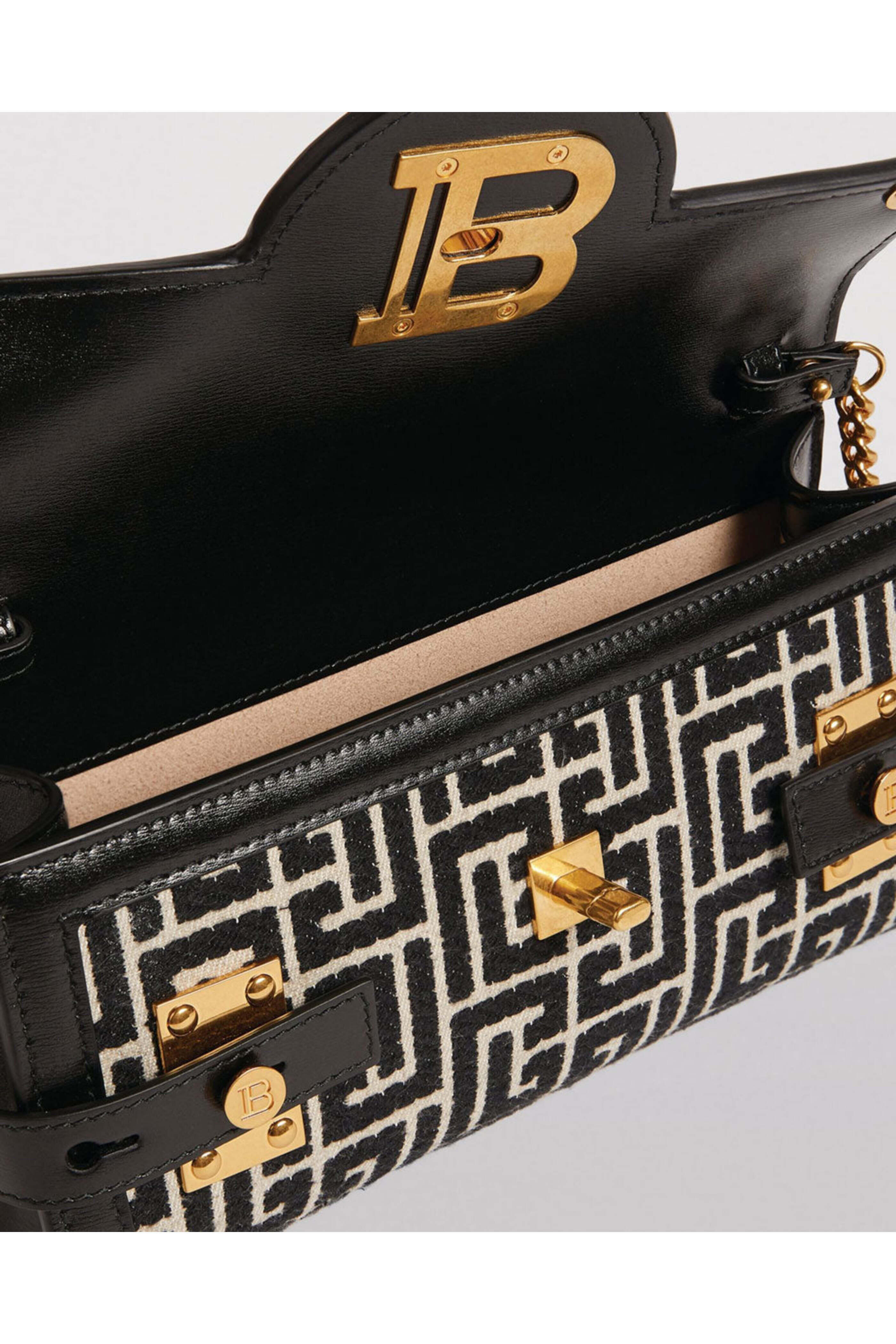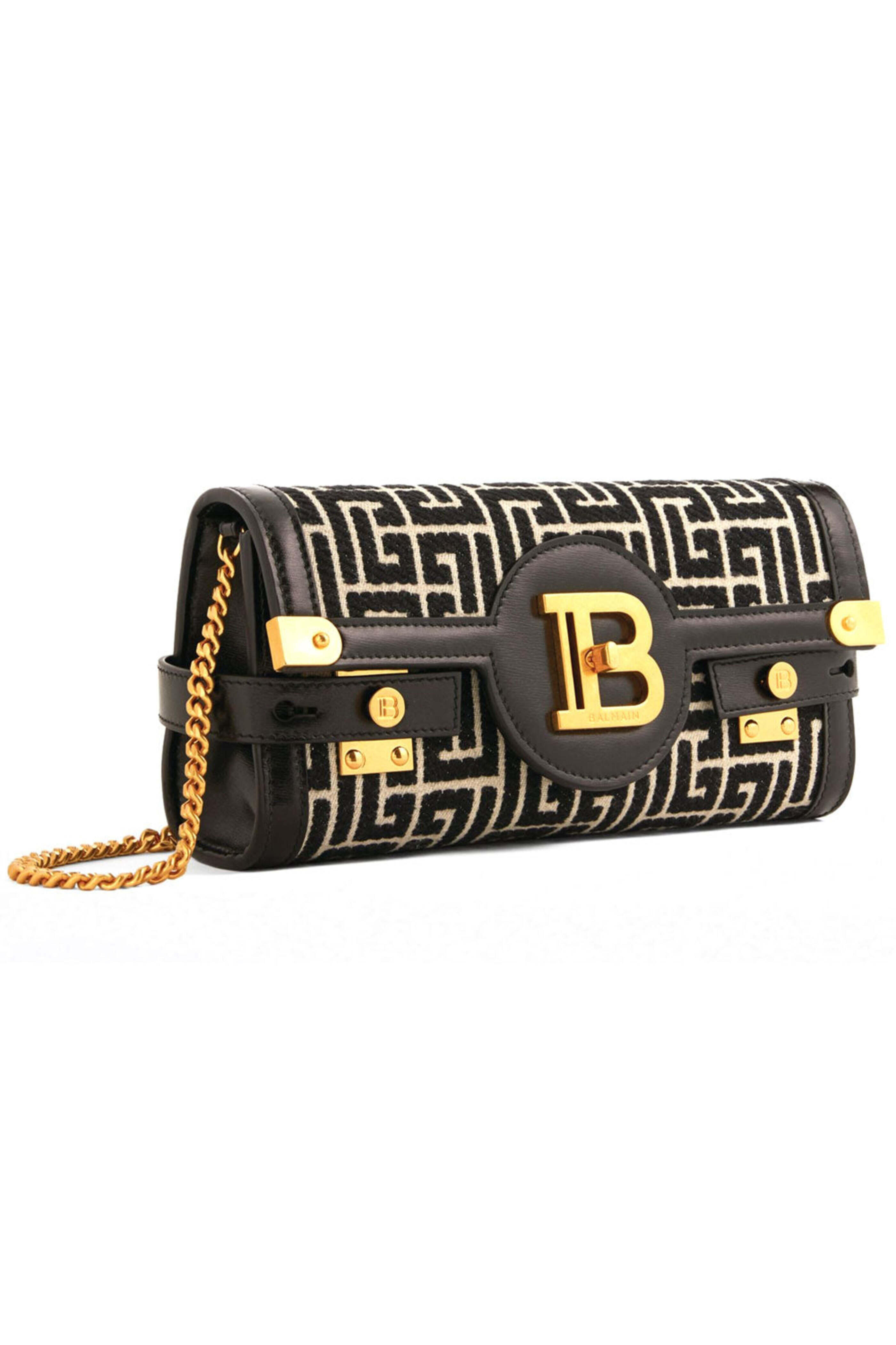 - Balmain Jacquard Monogram BBuzz 23 Clutch bag Fabric and leather clutch bag Flap front with twist lock closure Detachable chain strap Gold tone hardware Suede lined interior Tonal stitching One slip pocket 9 W X 4.5 T X 2 D Made in Italy