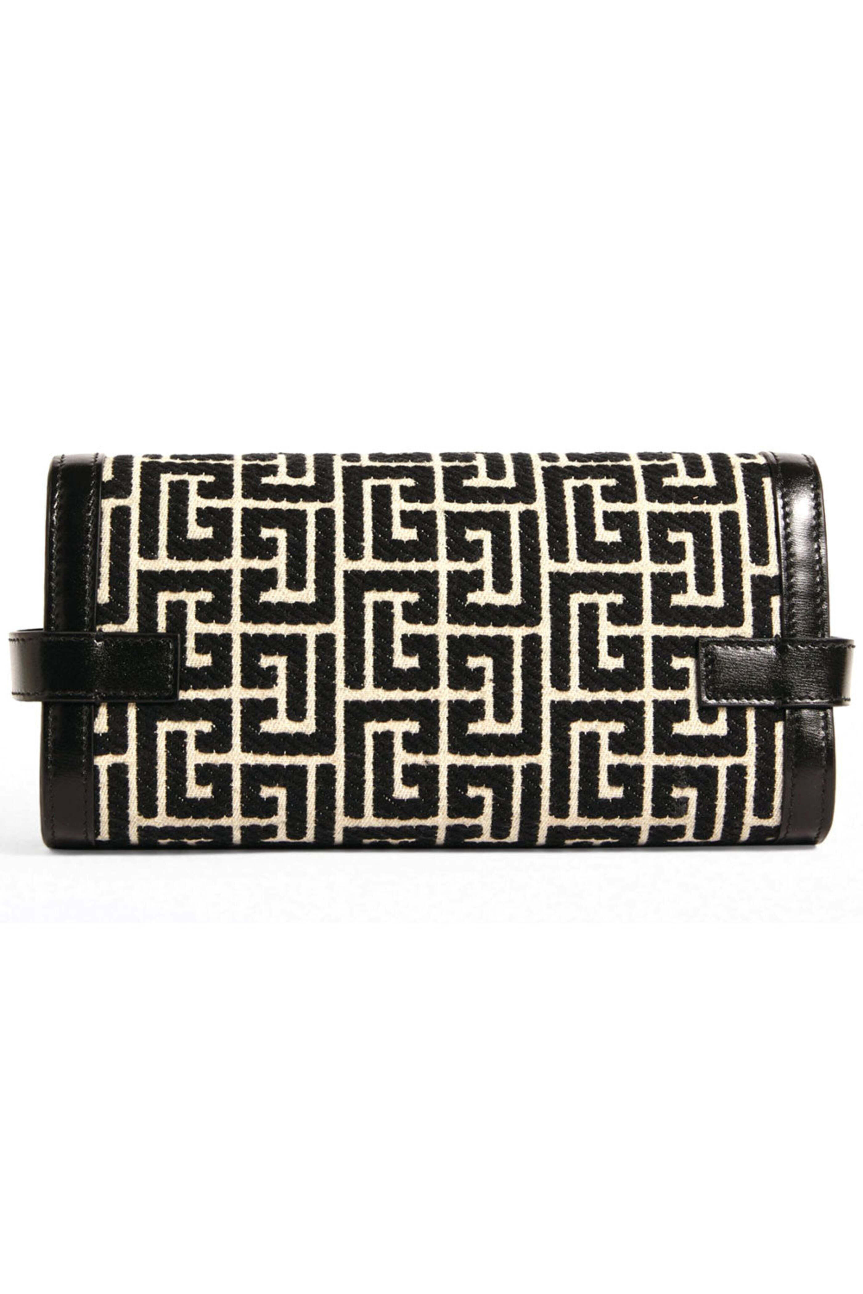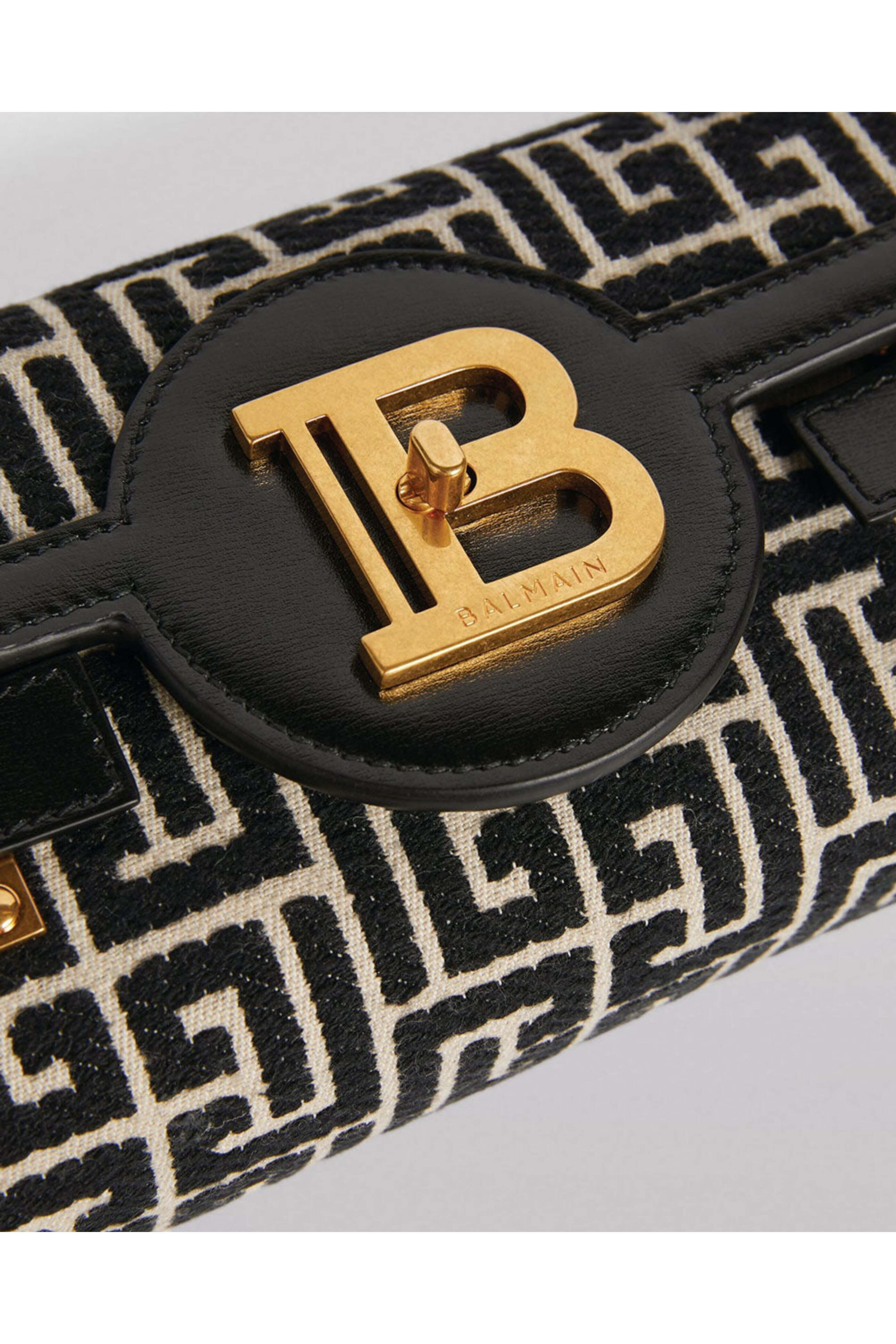 Balmain Jacquard Monogram BBuzz 23 Clutch bag Fabric and leather clutch bag Flap front with twist lock closure Detachable chain strap Gold tone hardware Suede lined interior Tonal stitching One slip pocket 9 W X 4.5 T X 2 D Made in Italy.