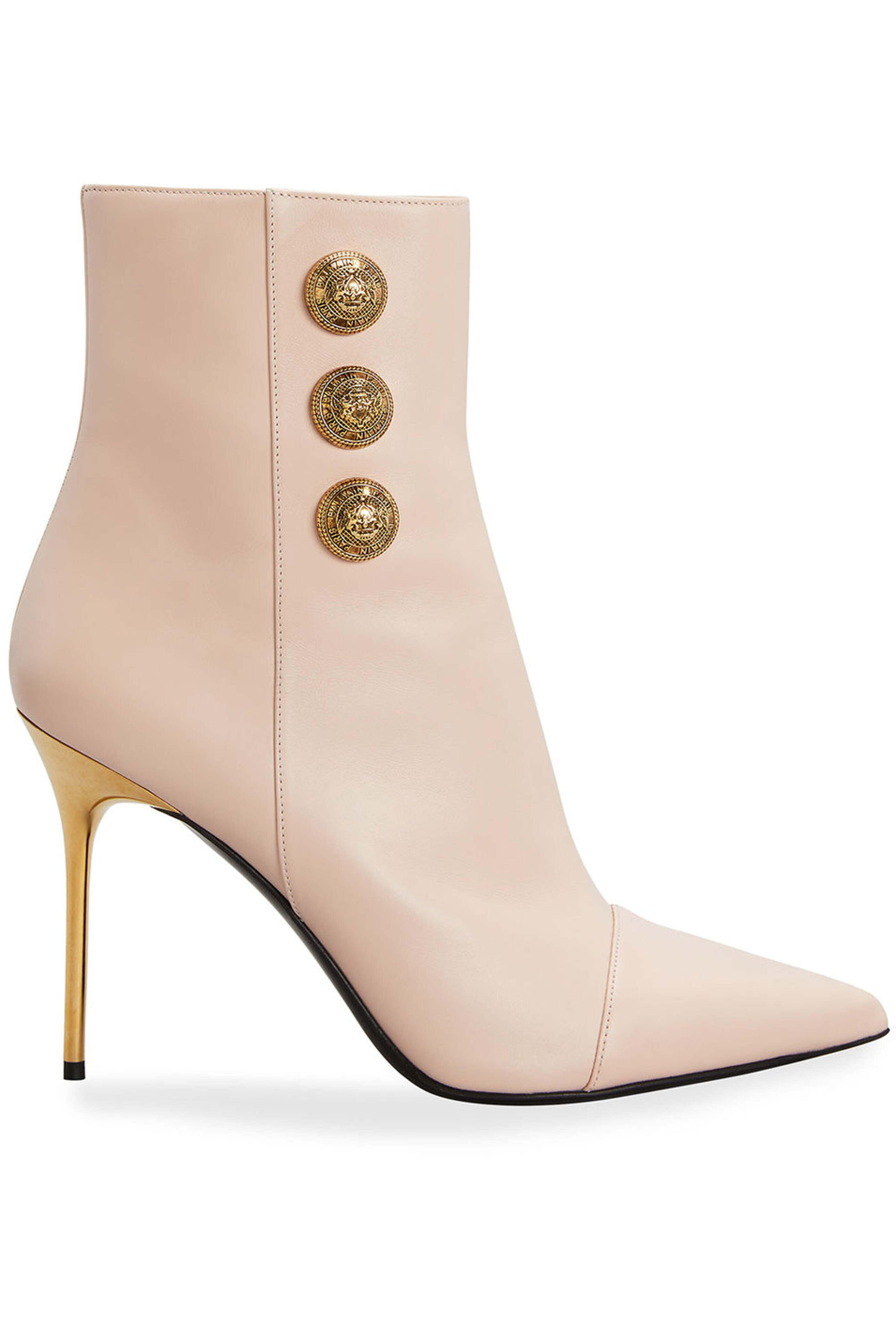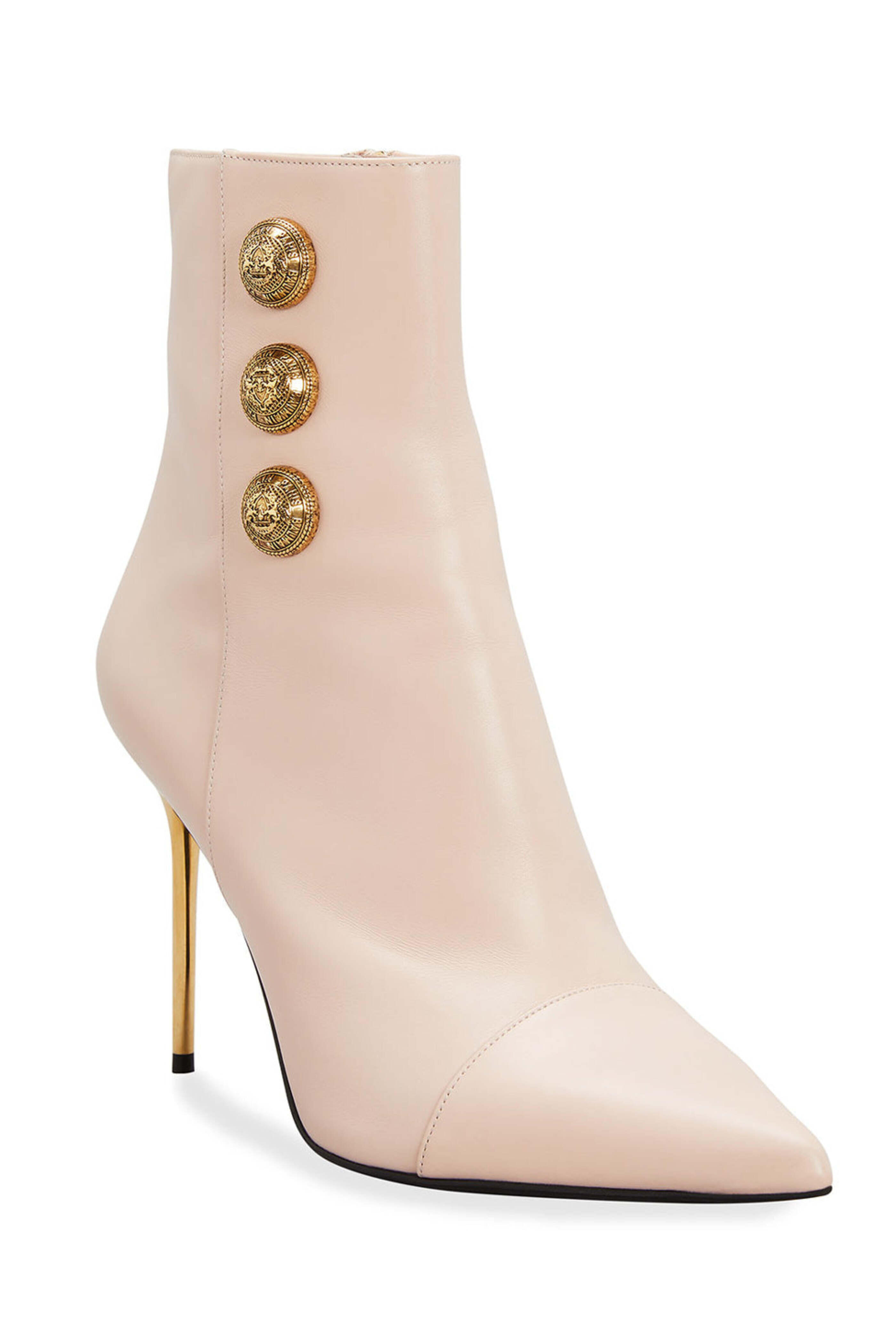 - Balmain Nude Roni-Calfskin Booties 4 metallic stiletto heel Pointed cap toe Golden logo button detailing Side zip eases dress Calfskin leather lining Smooth sole Made in Italy