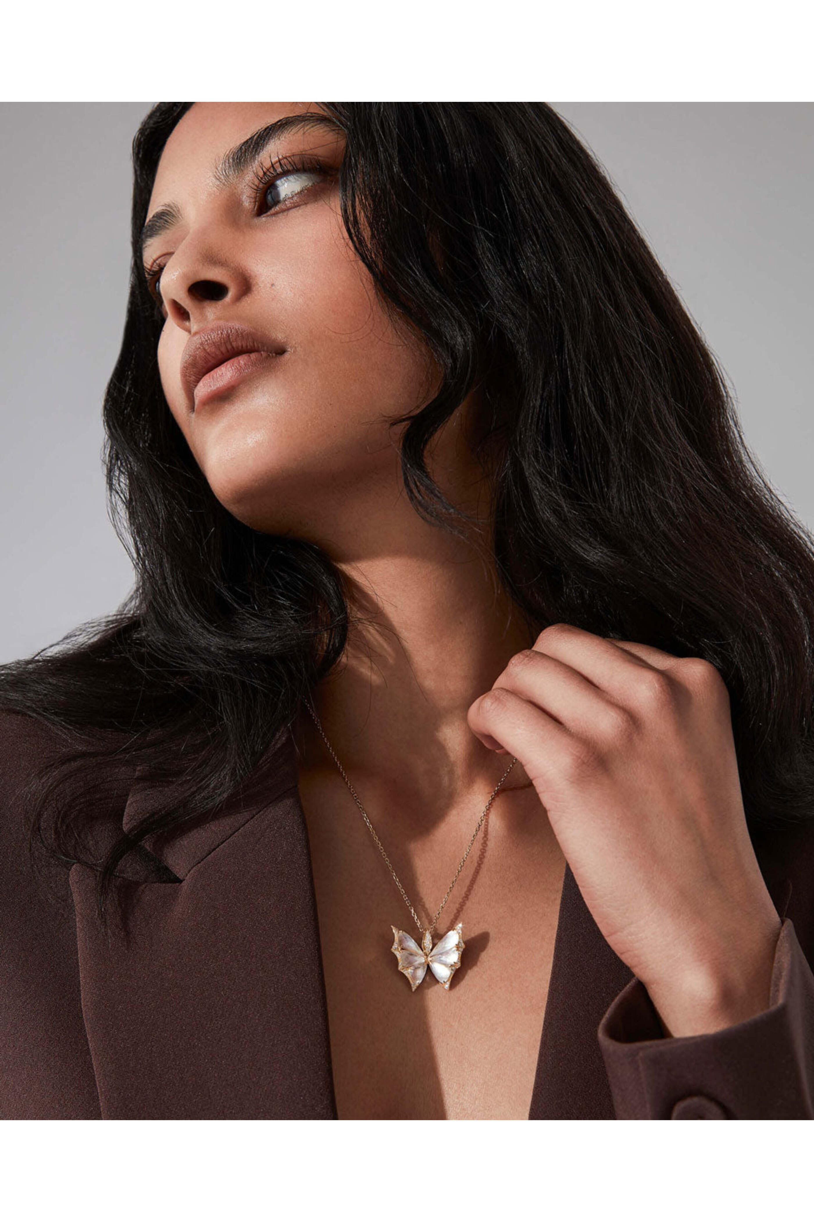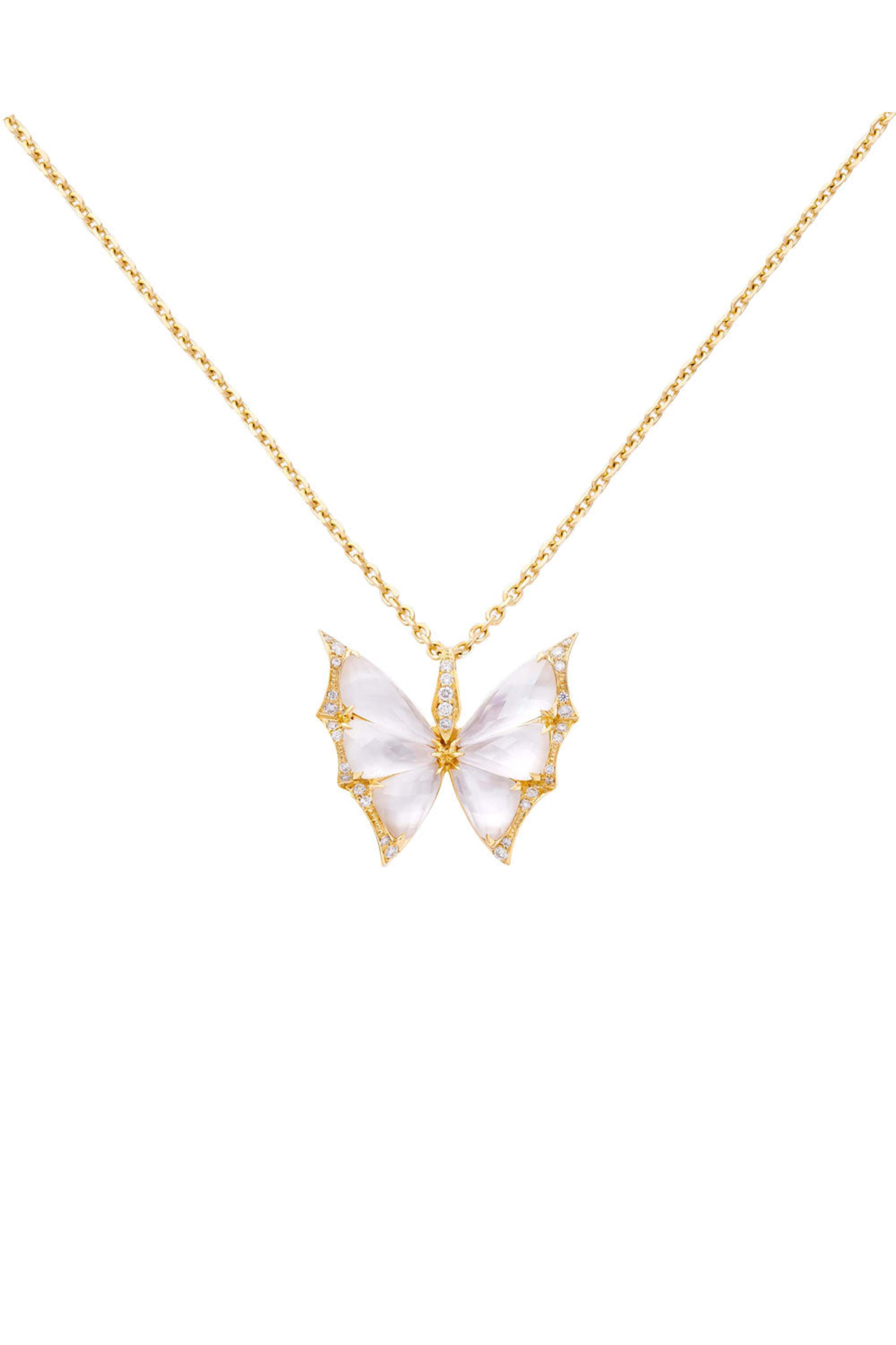 Stephen Webster Crystal Haze Butterfly Pendant Necklace. 18k gold. Pavé diamond 0.24 total carat weight. Mother of pearl. Quartz crystal haze. Butterfly design. Fly By Night Collection. 17 L. Lobster claw clasps.