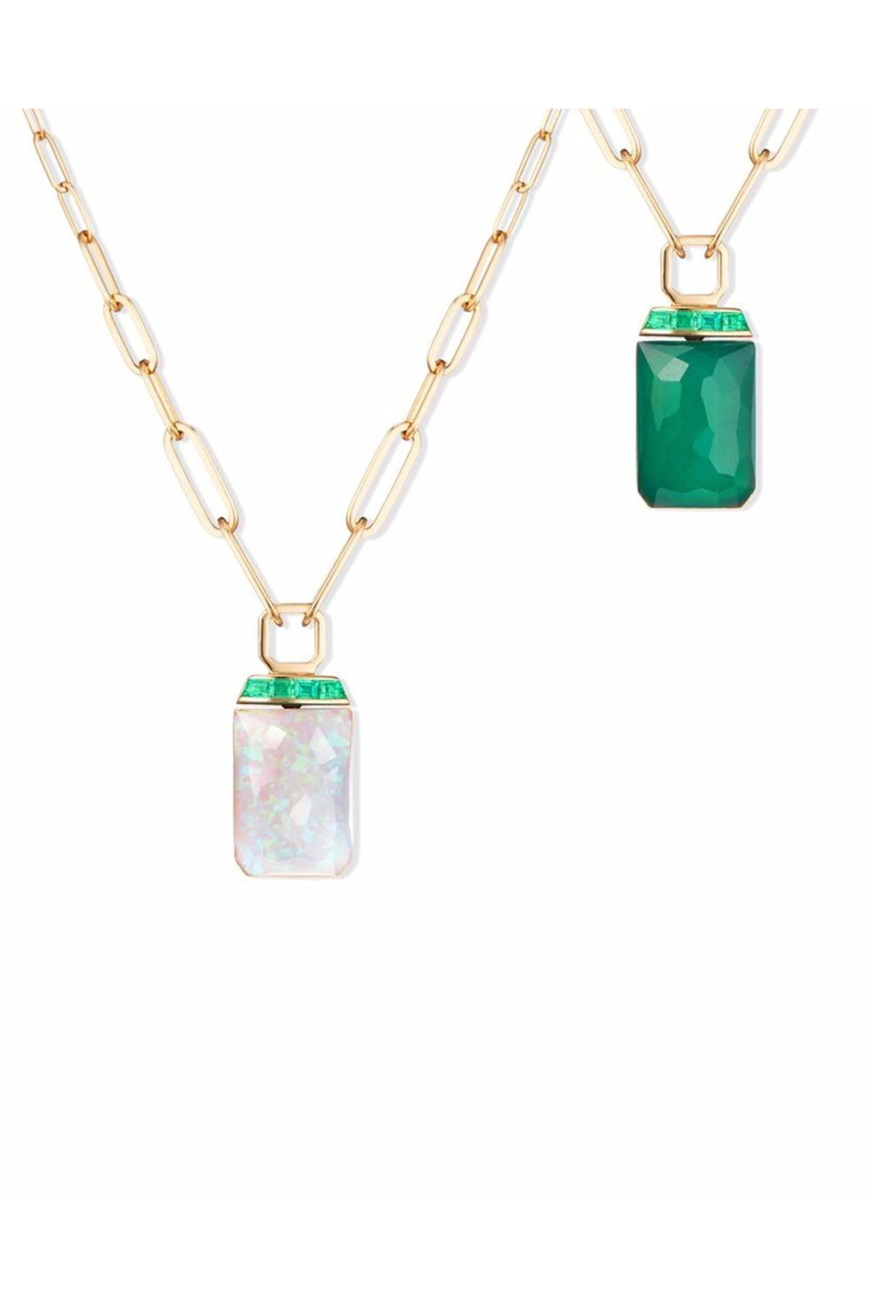 Stephen Webster Crystal Haze Tablet Twister Pendant. 18k yellow gold. Green agate 8.73 total carat weight. White opal 7.84 total carat weight. Emerald 0.19 total carat weight. Link chain. Baguette emeralds set at the top of the opal. Tablet design. Double sided. Pendant 0.73 L. Chain 18 L. Lobster claw clasp.