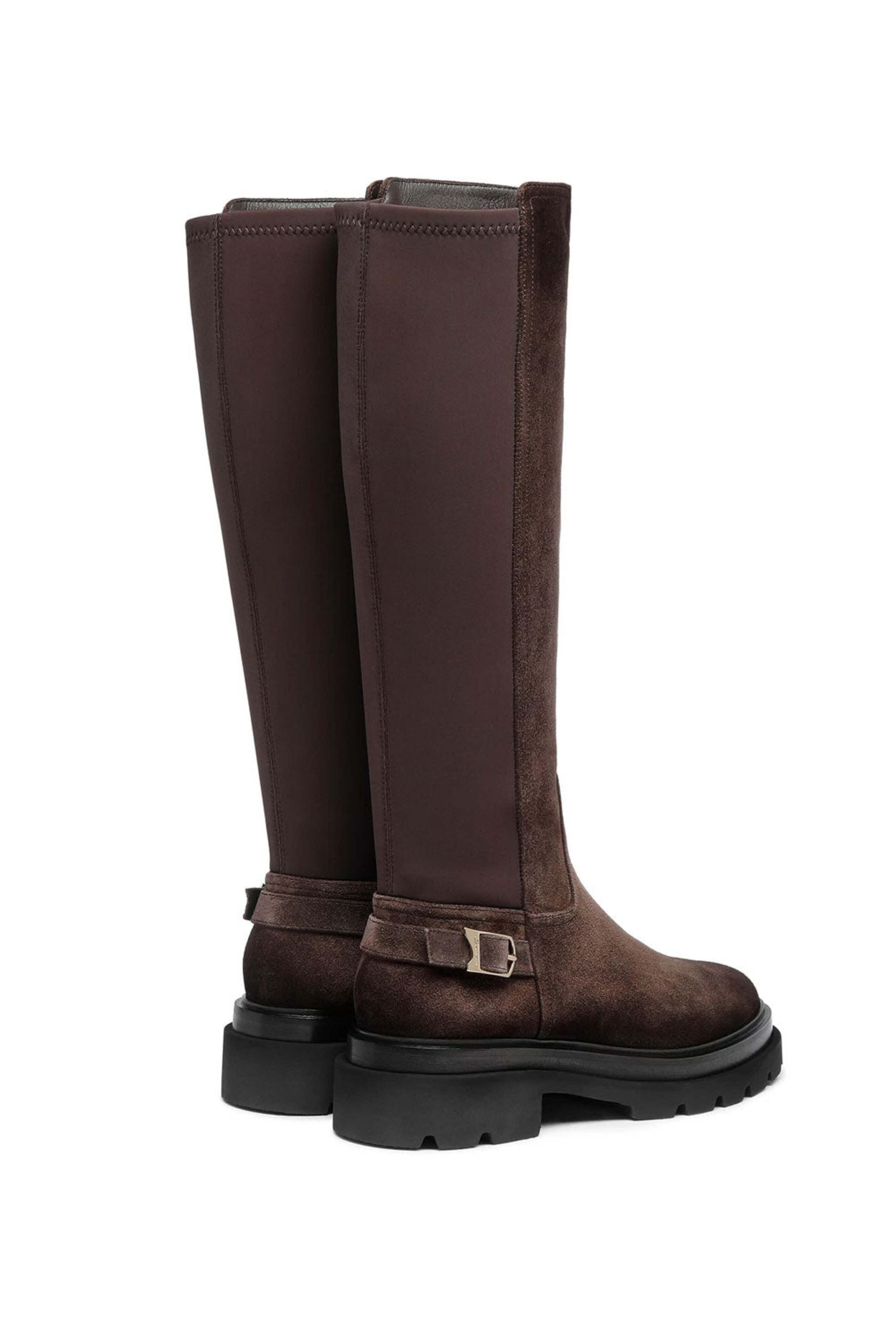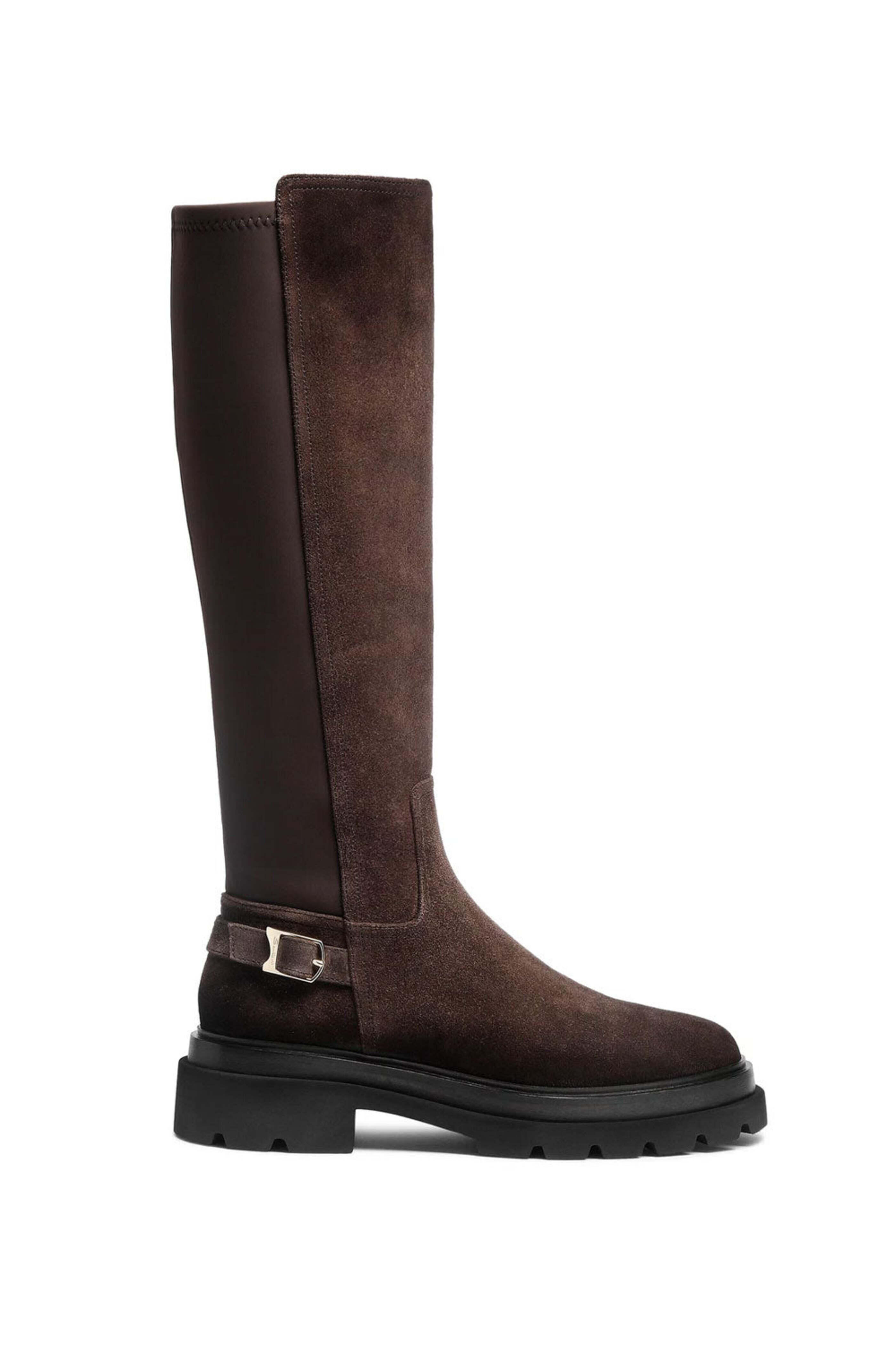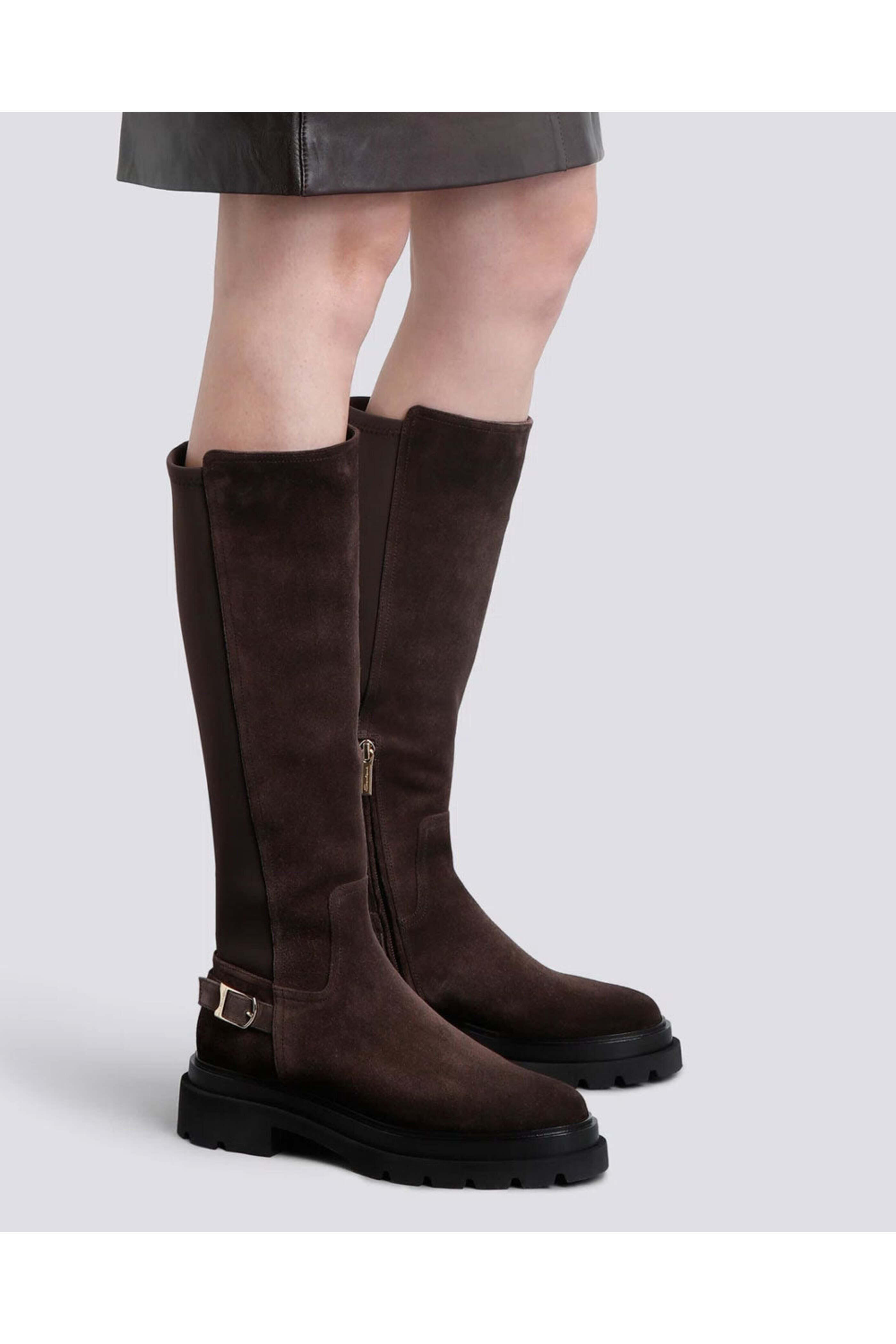 Santoni Tall Erin Flat Boot in Dark Brown. Closed round toe. Functional inside zip. Neoprene back. Decorative buckle strap. Suede upper. Leather lining. Chunky rubber sole. Made in Italy.