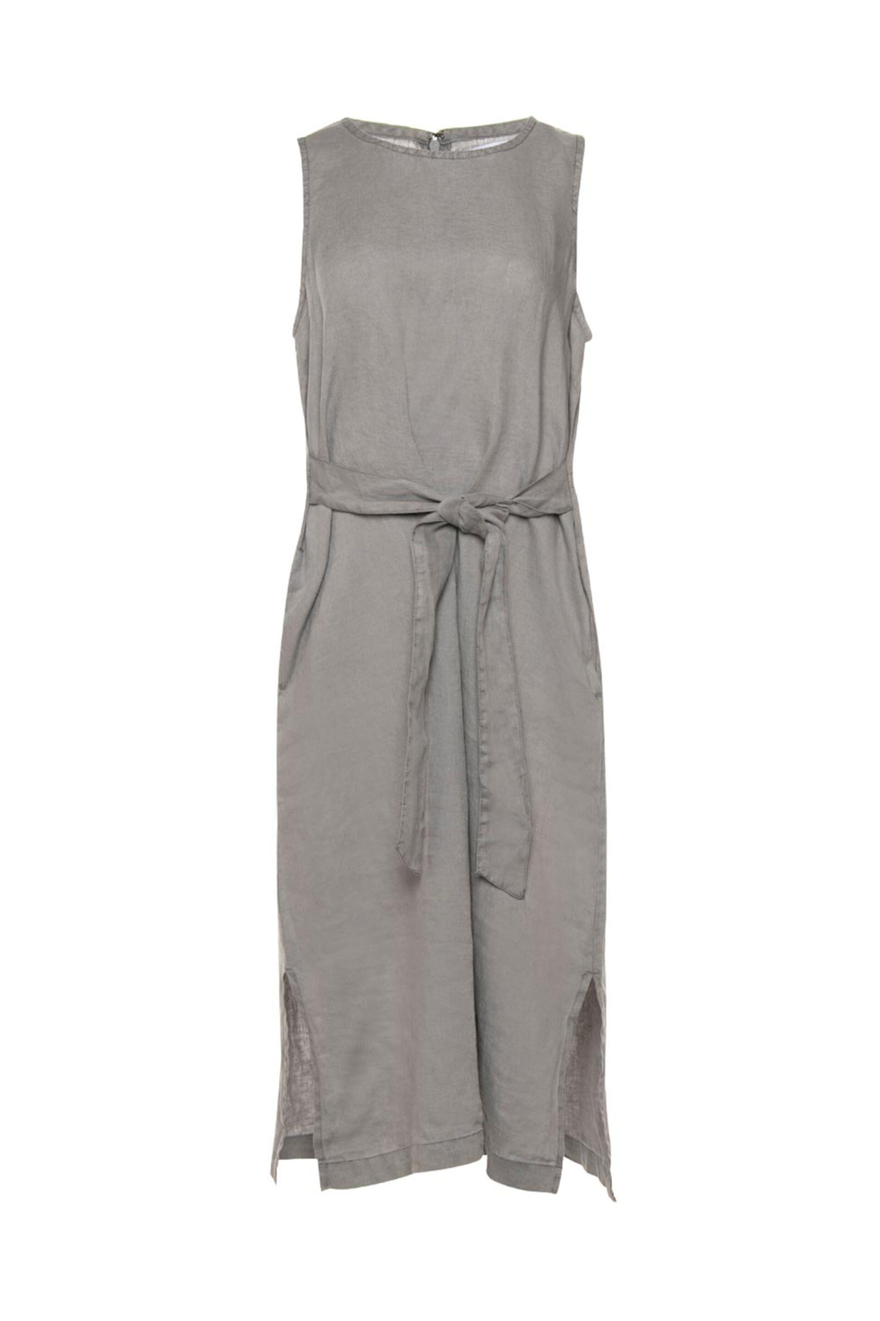 Michael Stars Galvanized Tie Front Margie Midi Dress Round neck Sleeveless Hidden back zip closure Relaxed fit Attached self-tie belt Midi length Unlined 100% linen Made in USA.
