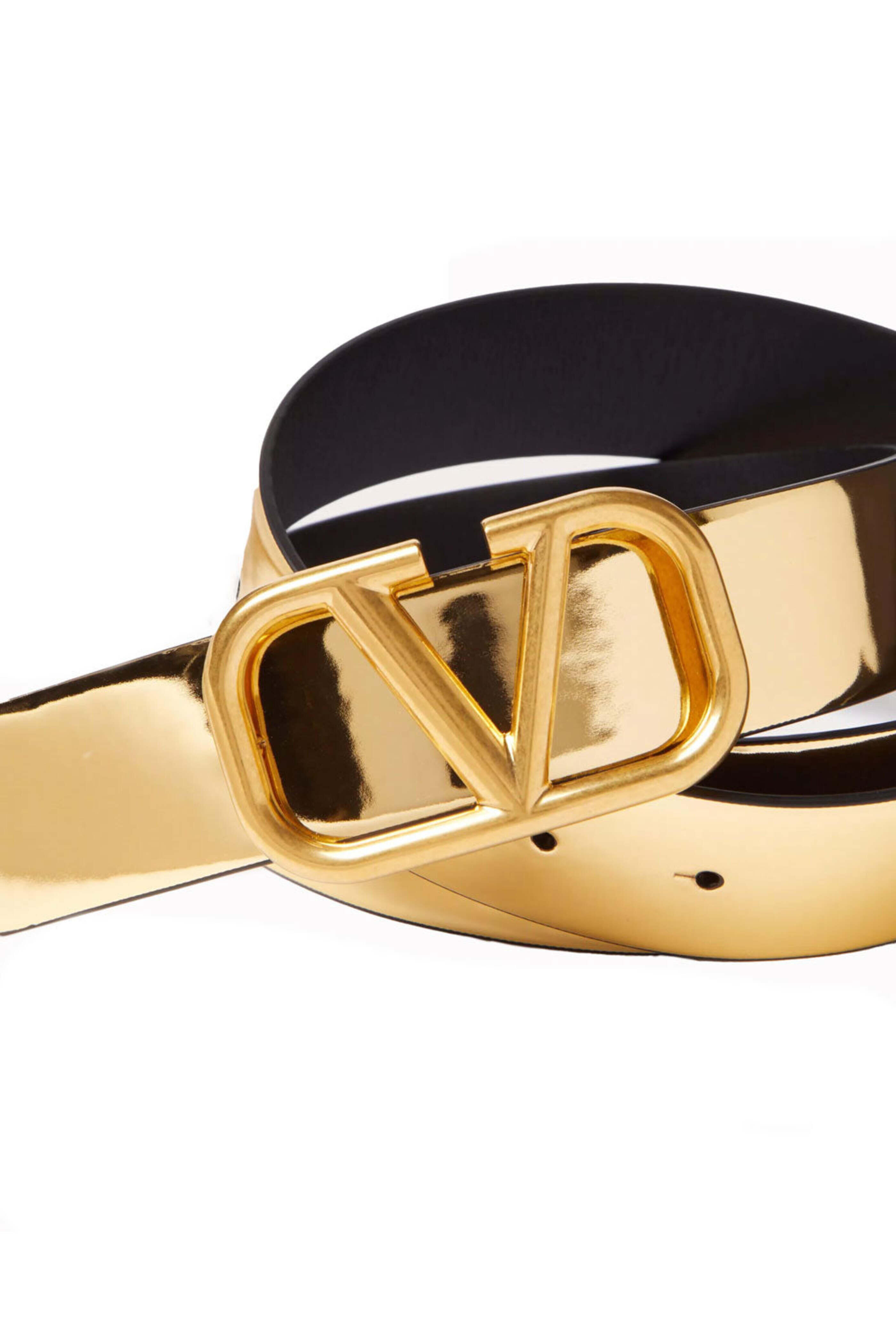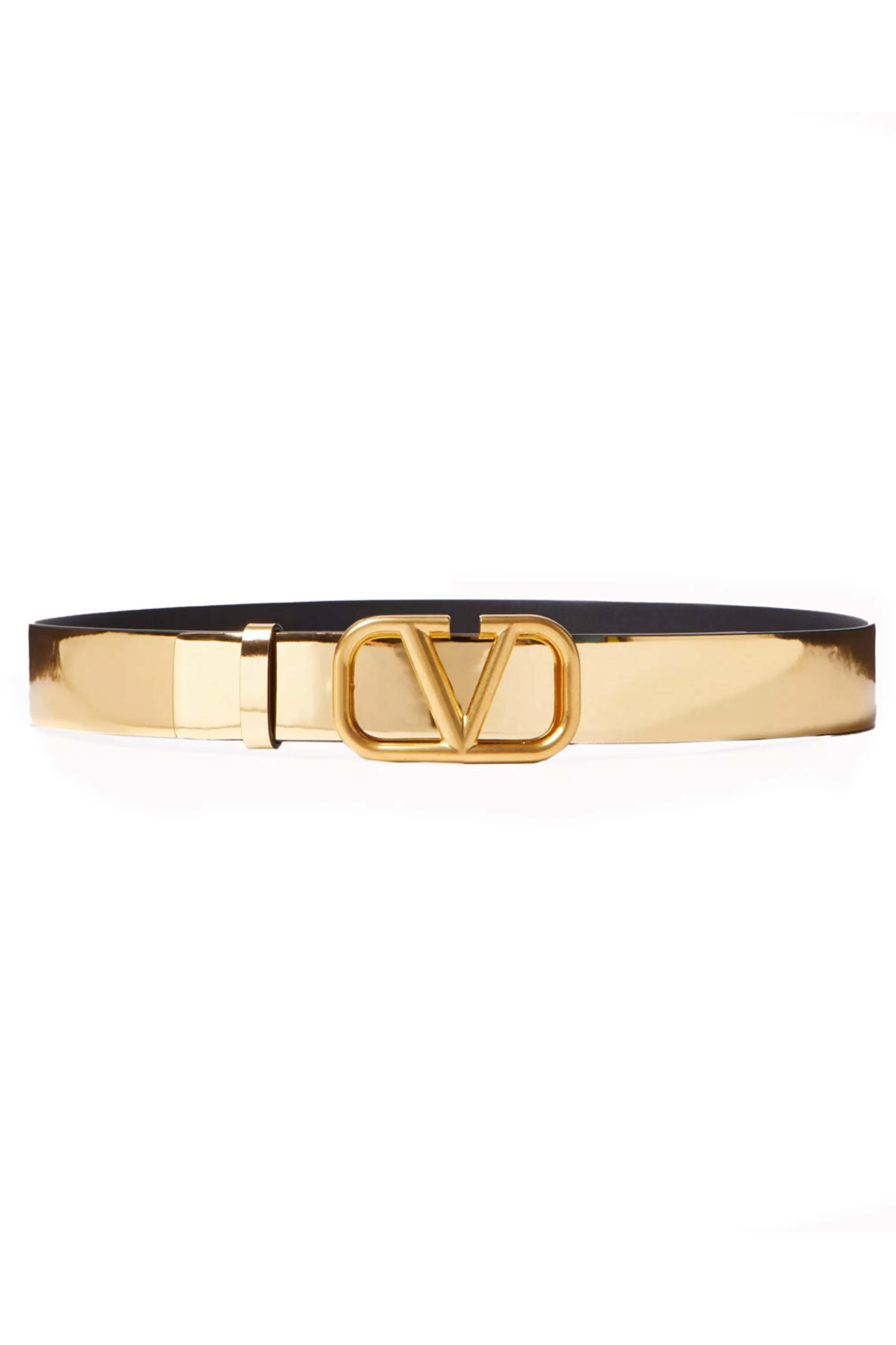 Valentino Garavani V Logo Belt in Gold. VLogo Signature Buckle. Tone on tone finish hardware. 1.4 height. Made in Italy.