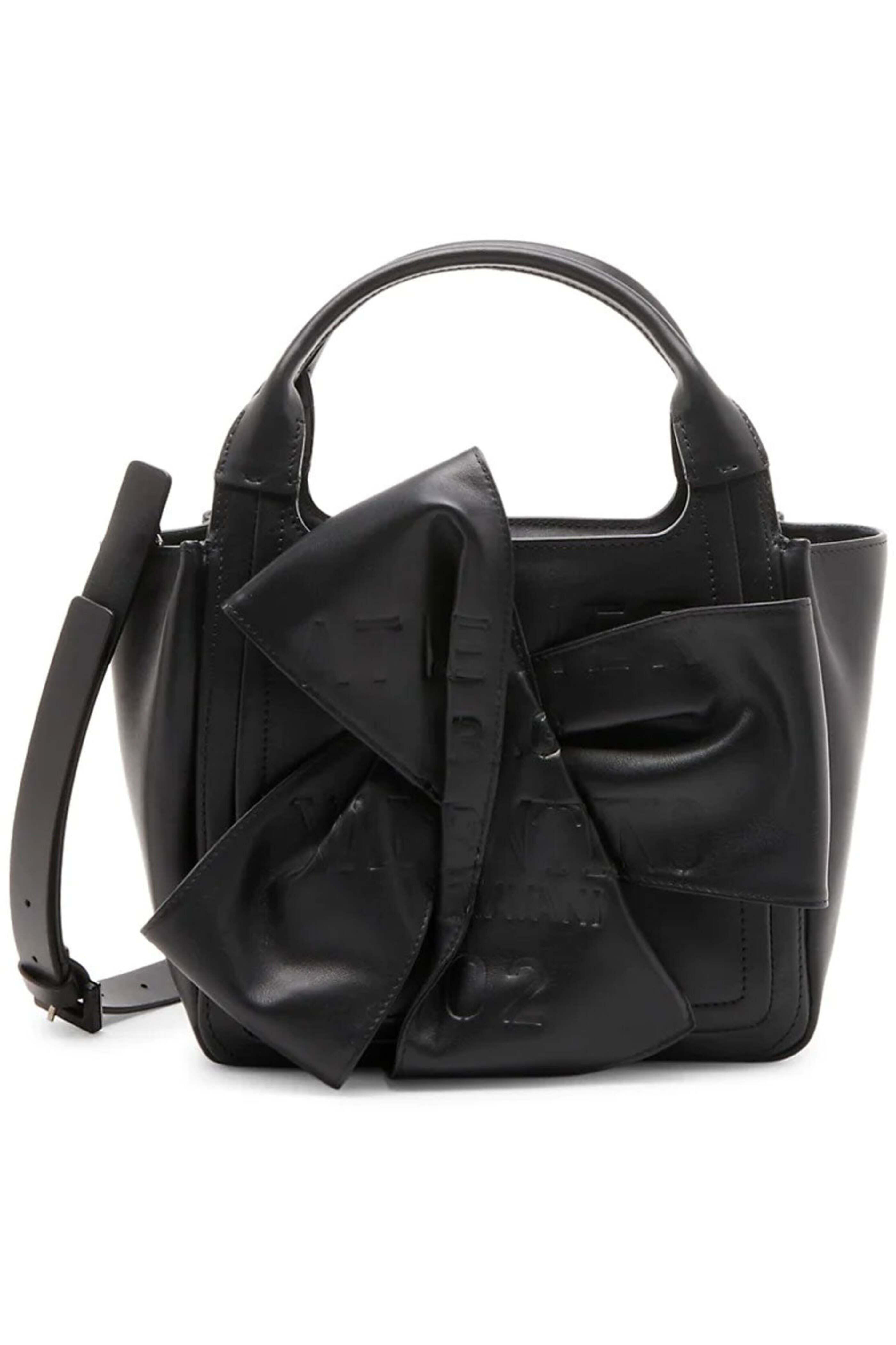 Valentino Garavani Small Atelier Leather Tote in Nero. Top zip closure. Double top handles. Detachable adjustable shoulder strap. Interior zip pocket. Logo print and bow detail. Calfskin outer and lining. Made in Italy.