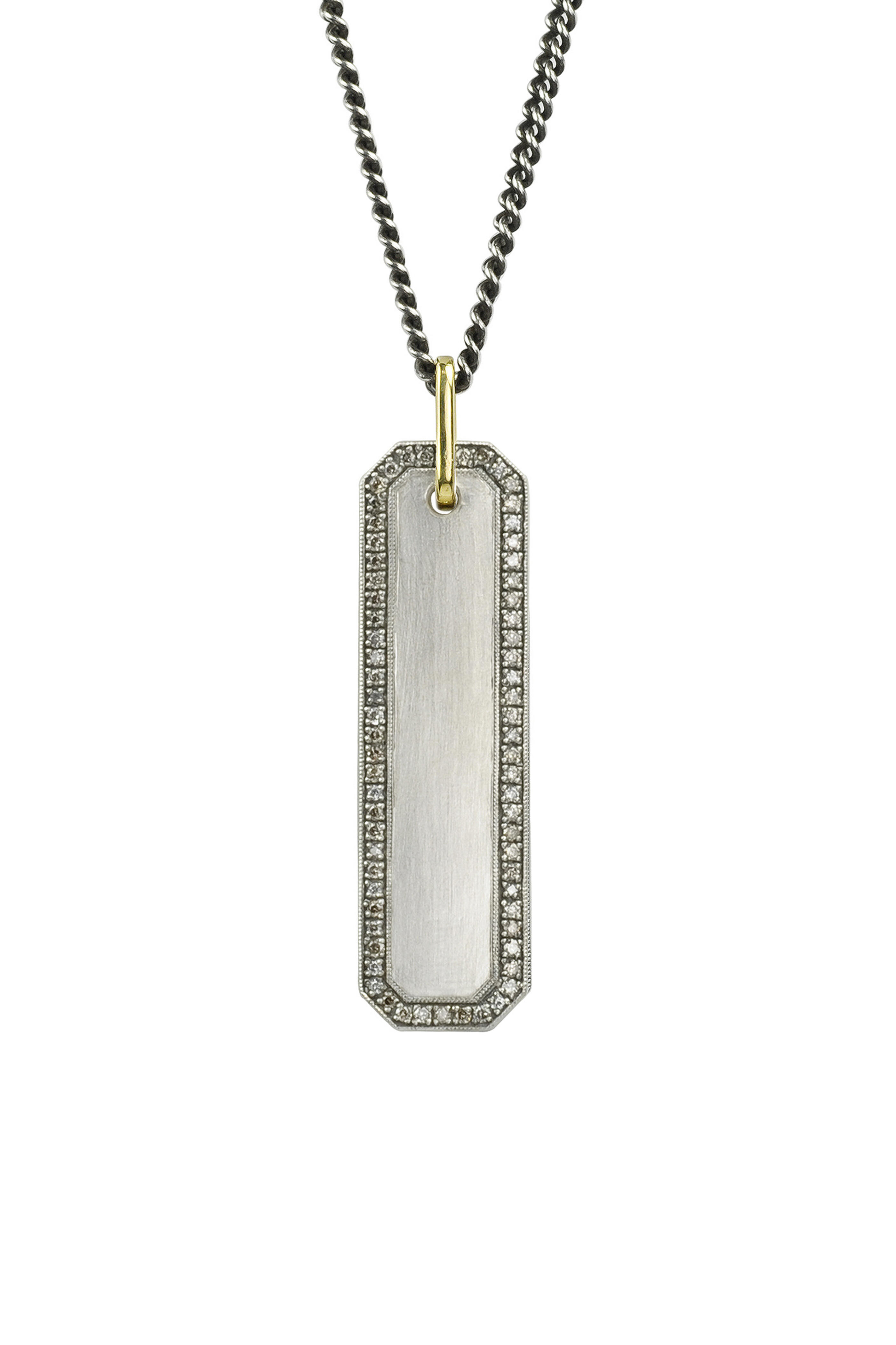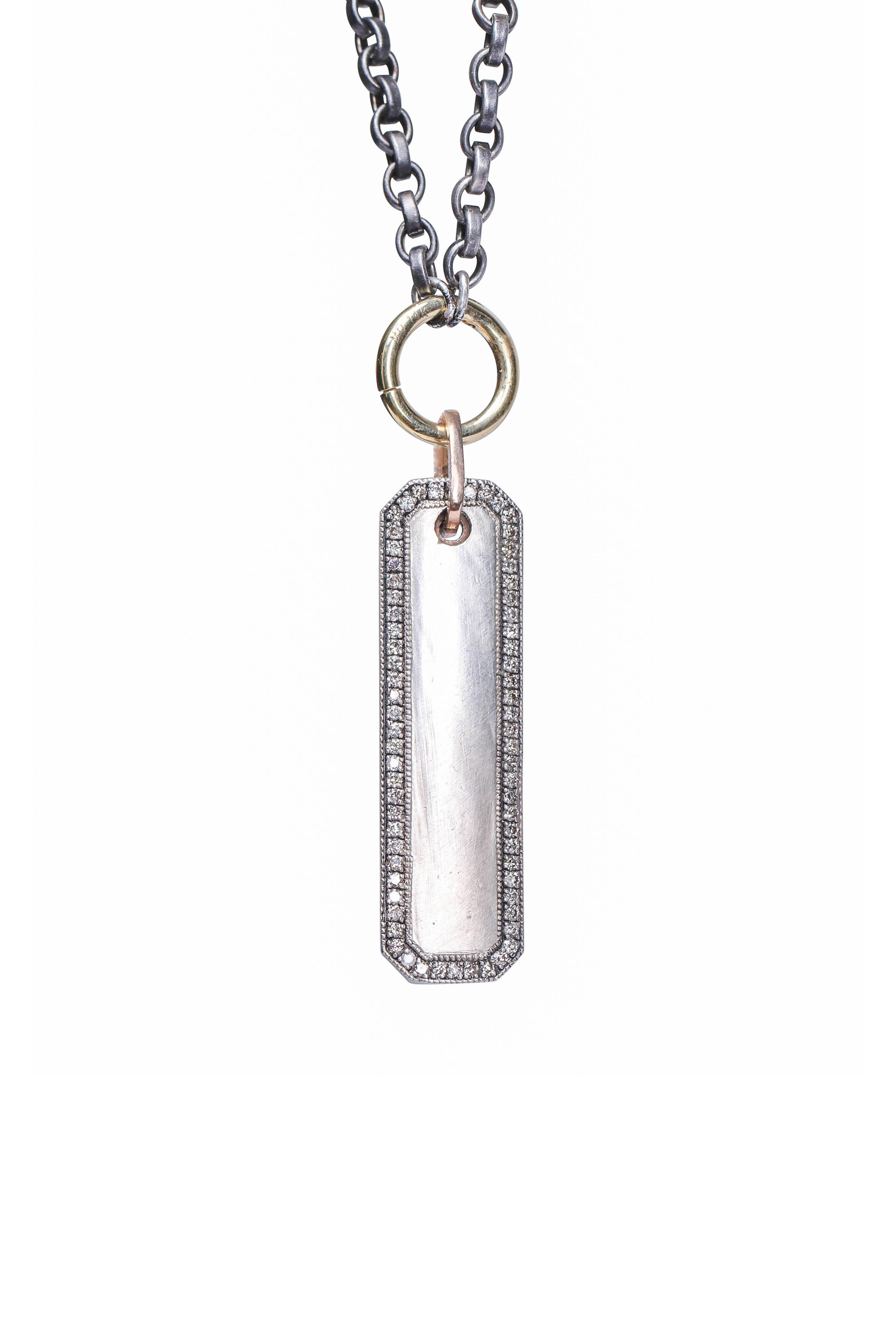 14k gold. Sterling silver. Diamond 1.00 total carat weight. Bar design. Diamond halo. Prong setting. Gold bail. Handcrafted in L.A.. 12mm x 41mm.