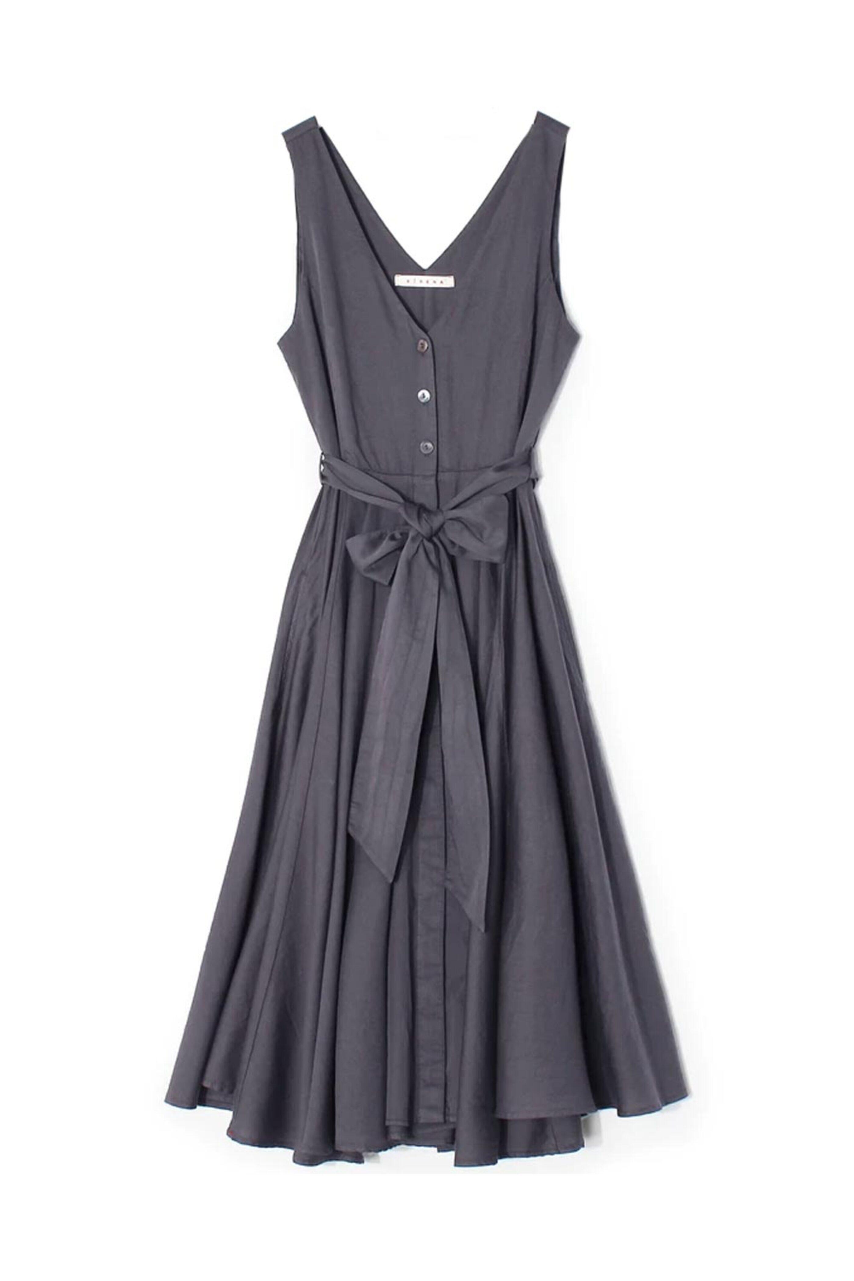 - Xirena Ash Gray Bell Dress V neck and back Sleeveless Front button down closure Removable self-tie belt at waist A line silhouette Regular fit Midi length Unlined 100% cotton Made in LA