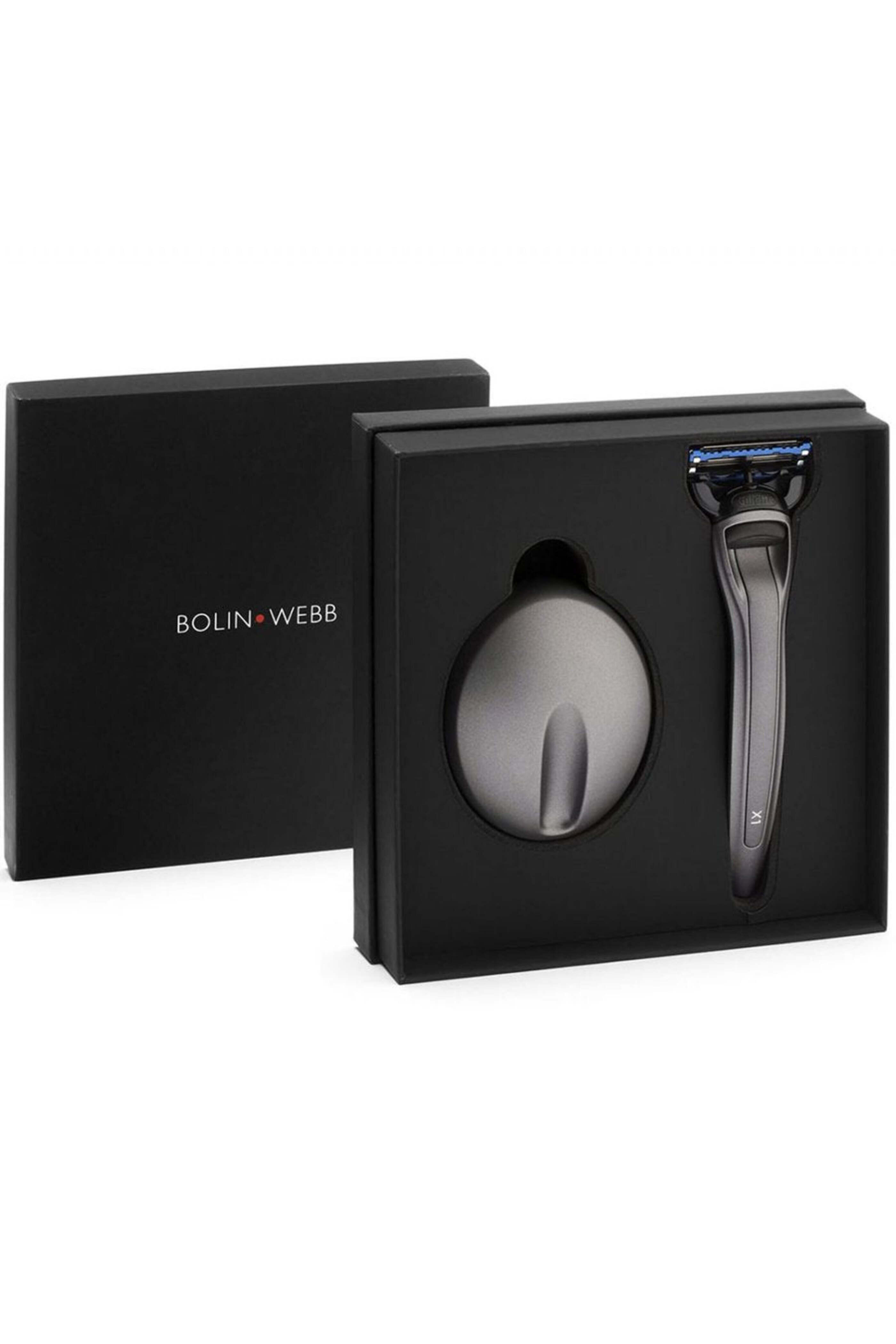 Bolin Webb X1 Matte Graphite & Stand. With a timeless graphite finish~ this unique soft touch matte set is a classic addition to the range. GQ Best Razor 2020. Fitted with Gilette Fusion5 blades. 5 blade technology for the closest shave. Primed and painted to an automotive finish. Presented in a signature gift box. British made. Gillette compatible.