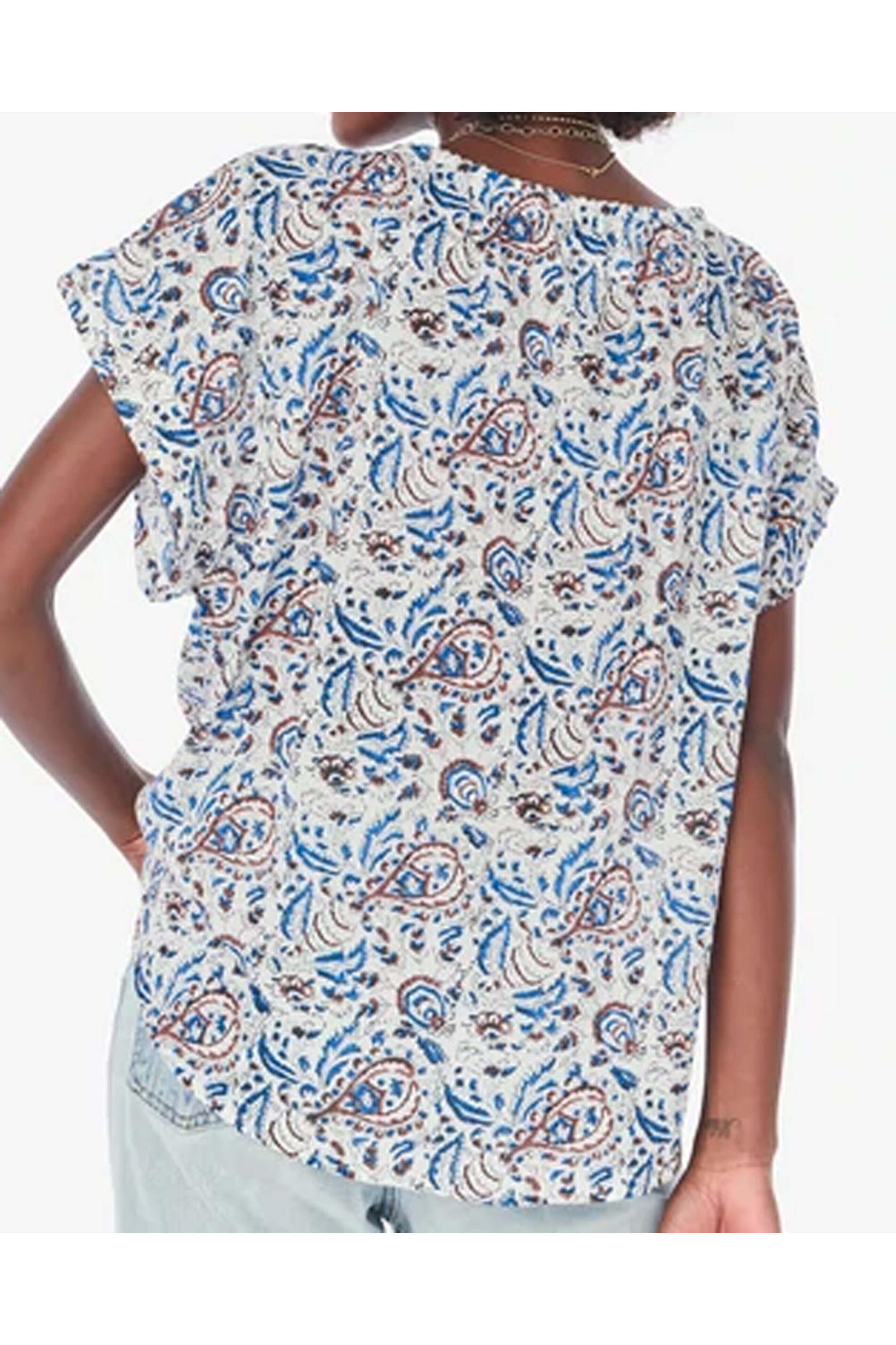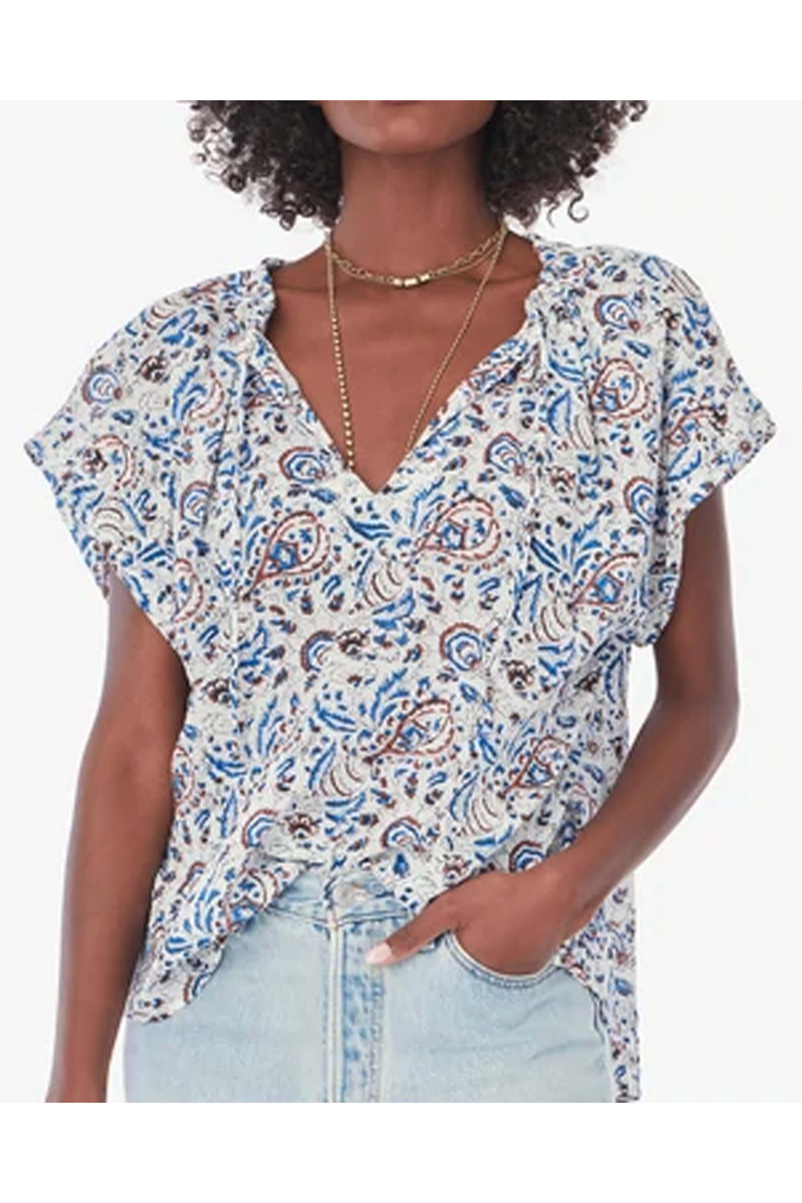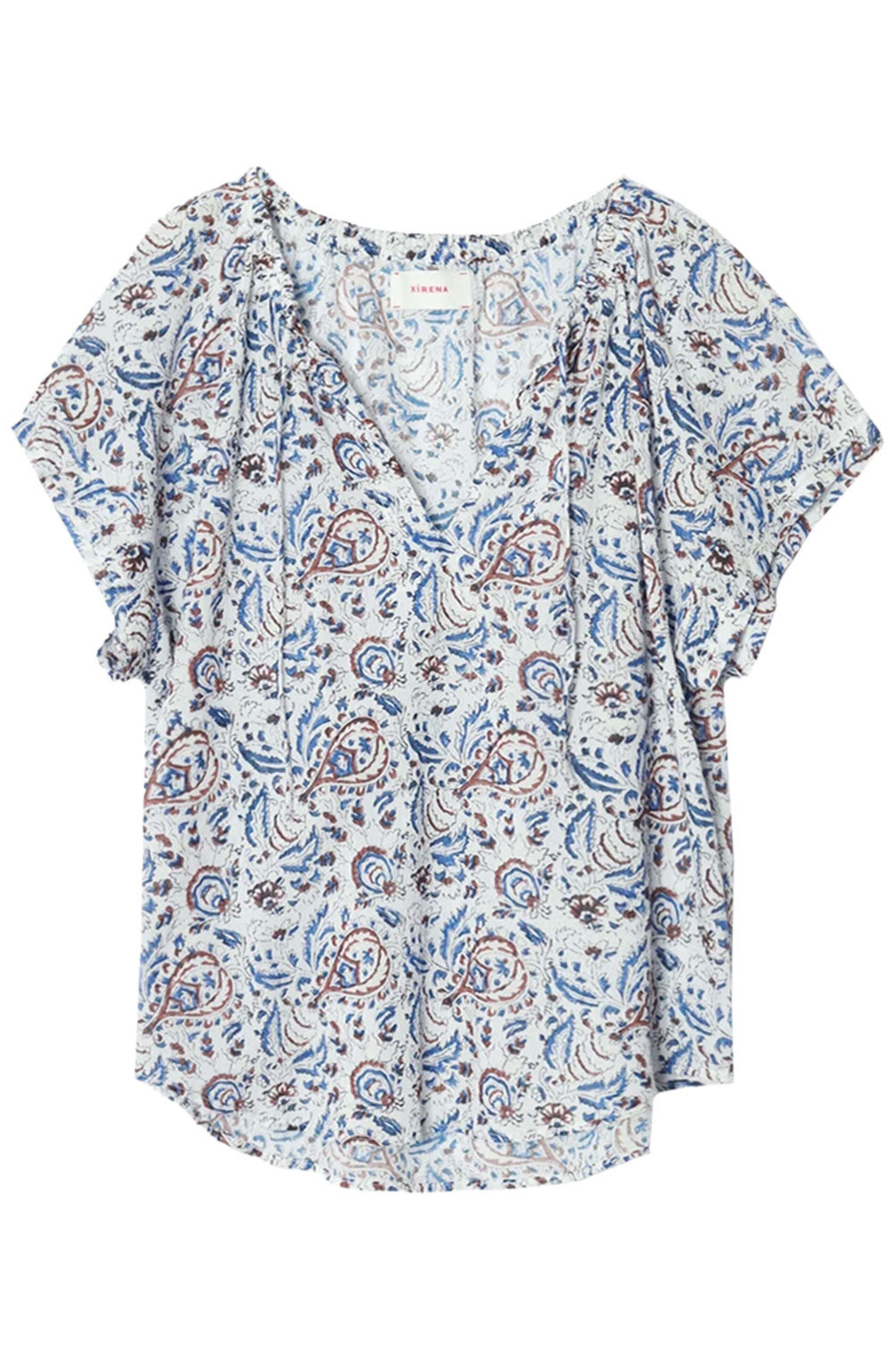Xirena White Mosaic Tessa Top. V-neck. Cap sleeves. Elastic neckline with gentle shirring. Drawstring detail. Shirttail hem. Le cactus print. Made in Los Angeles. 100% cotton.