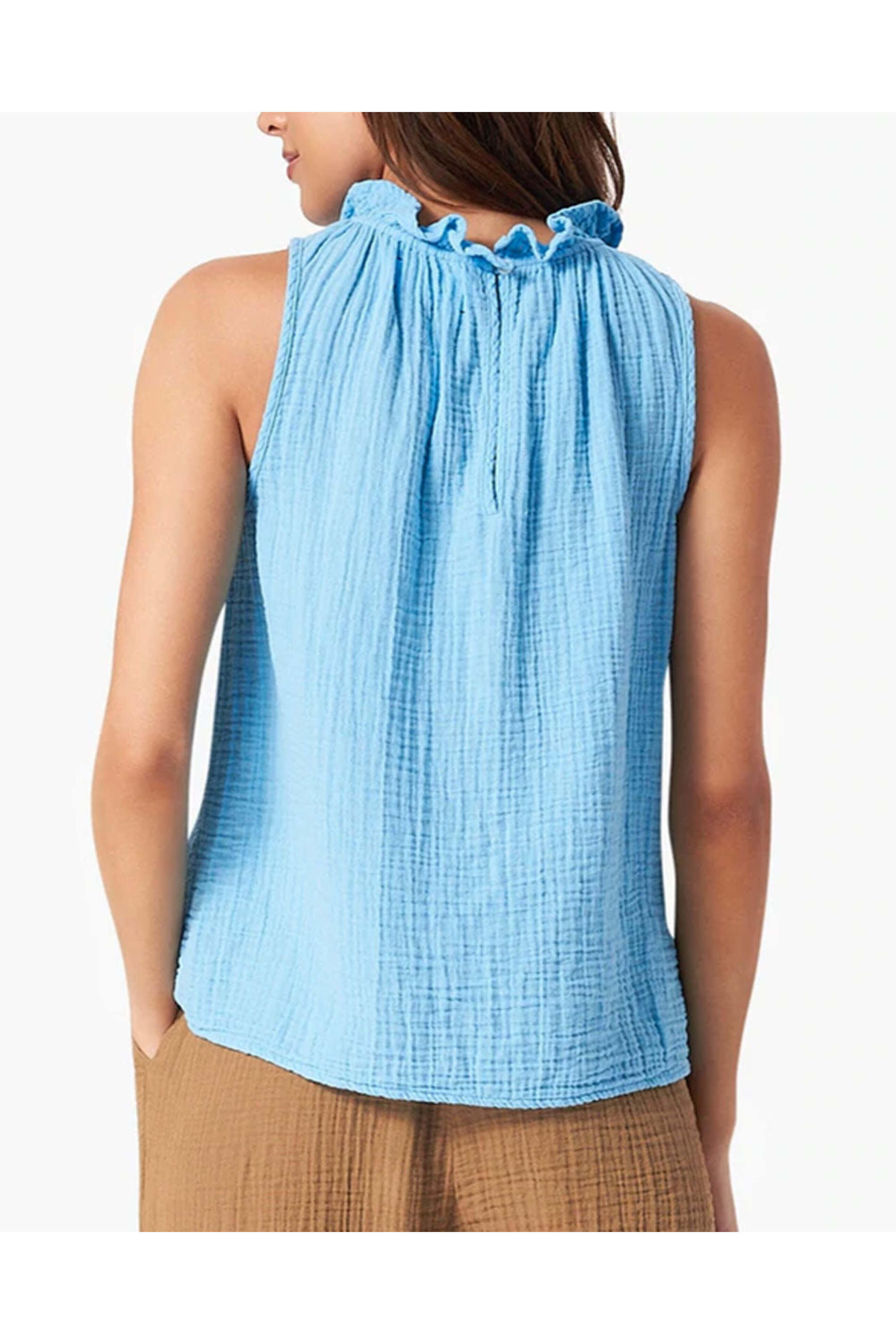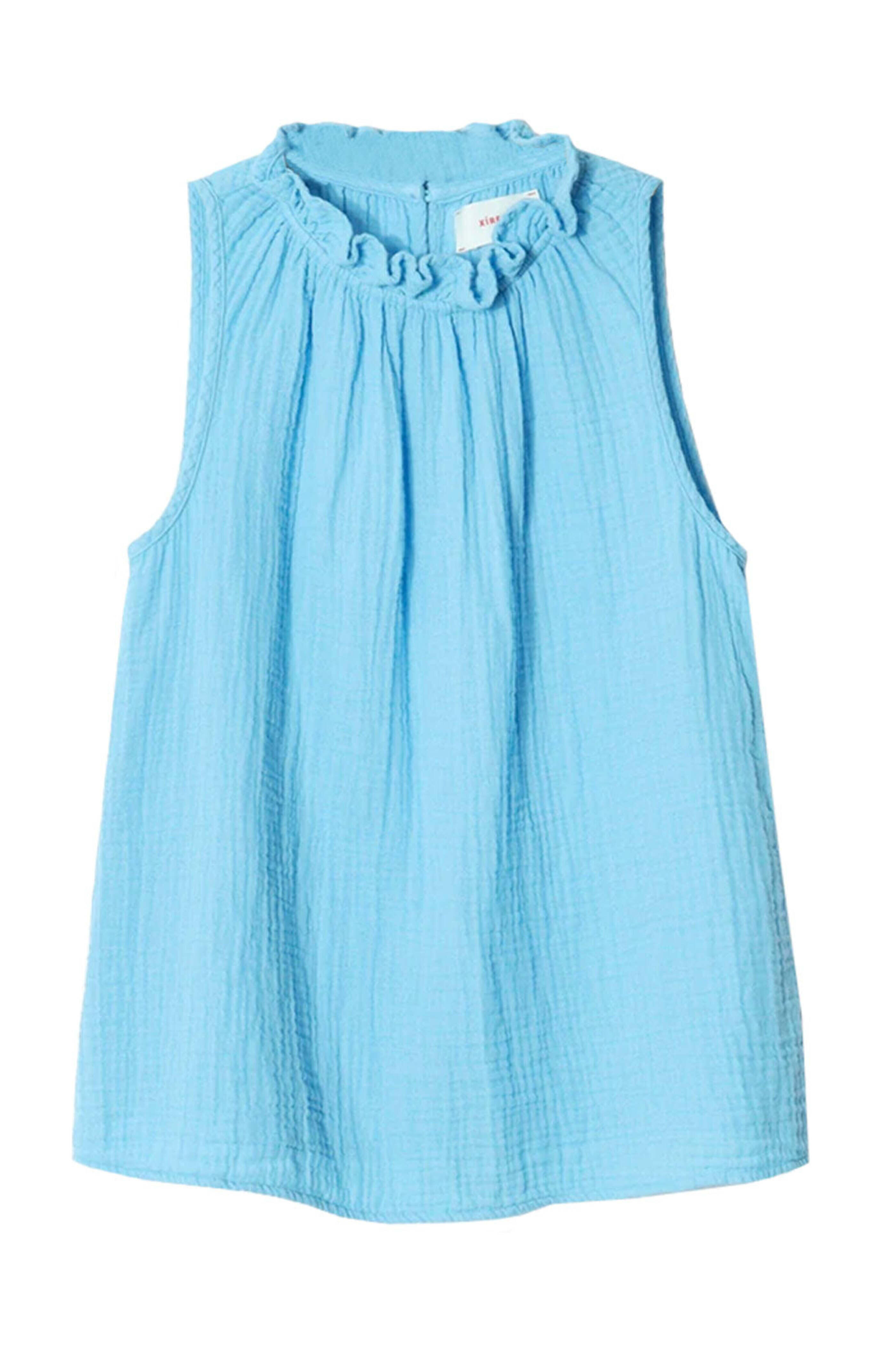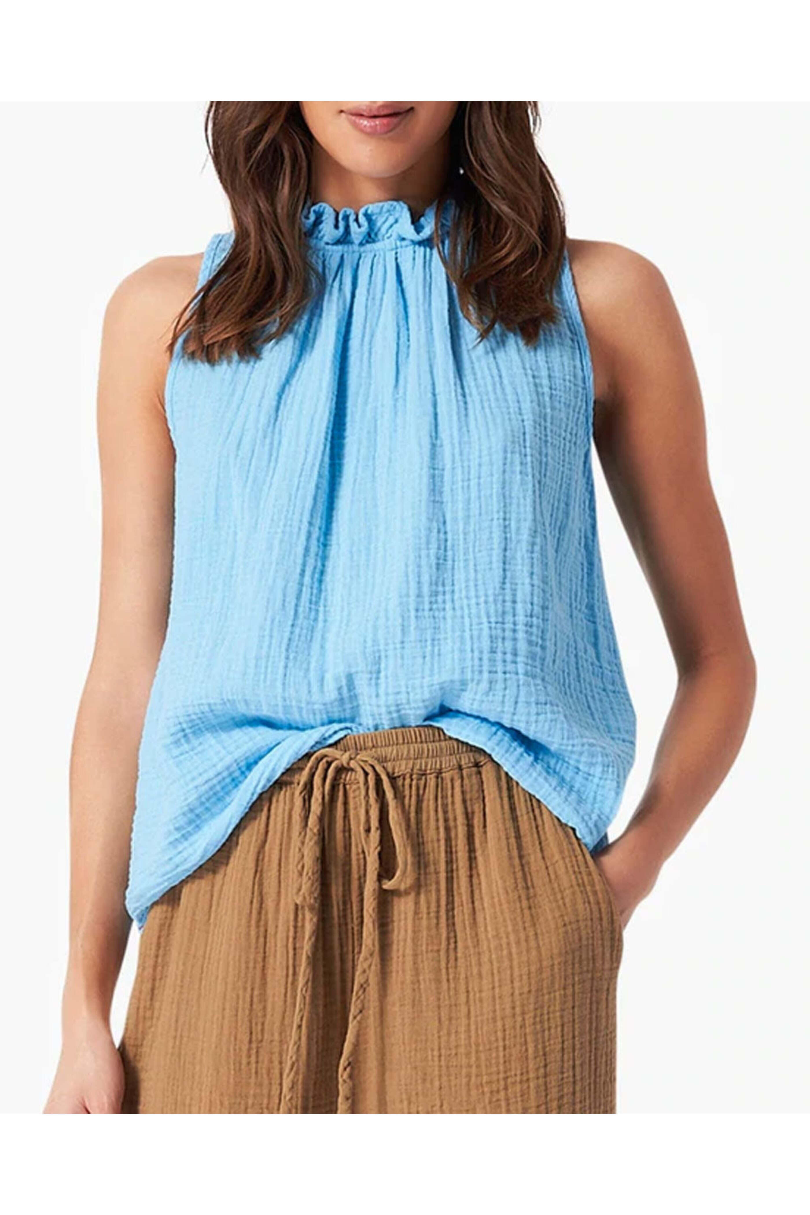 Xirena Fiji Bleu Noelle Top. High neck; ruffle detail. Back button closure; keyhole detail. Sleeveless. Relaxed fit. Gauze fabrication. 100% cotton.